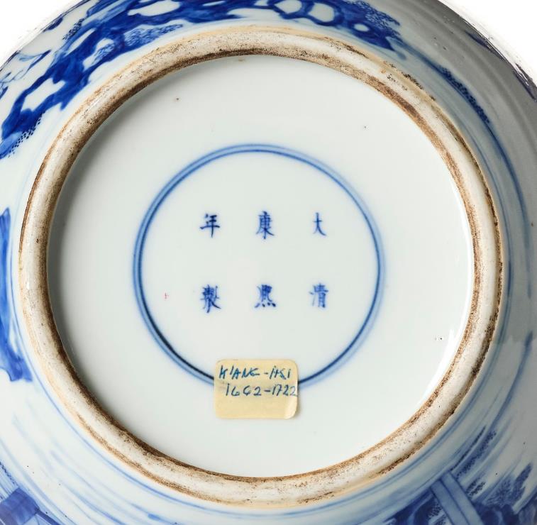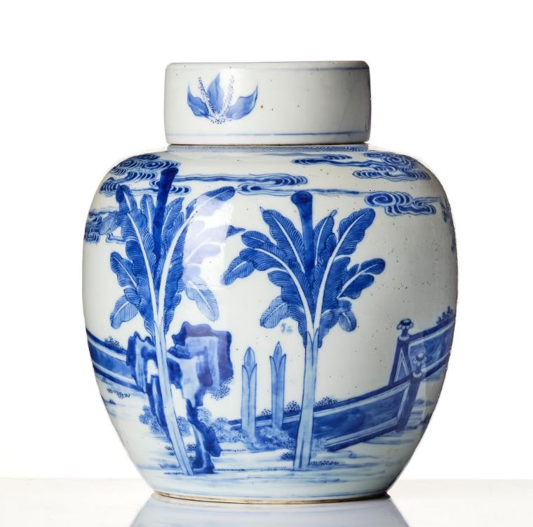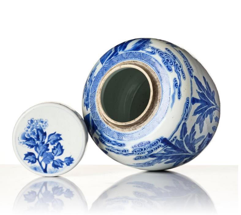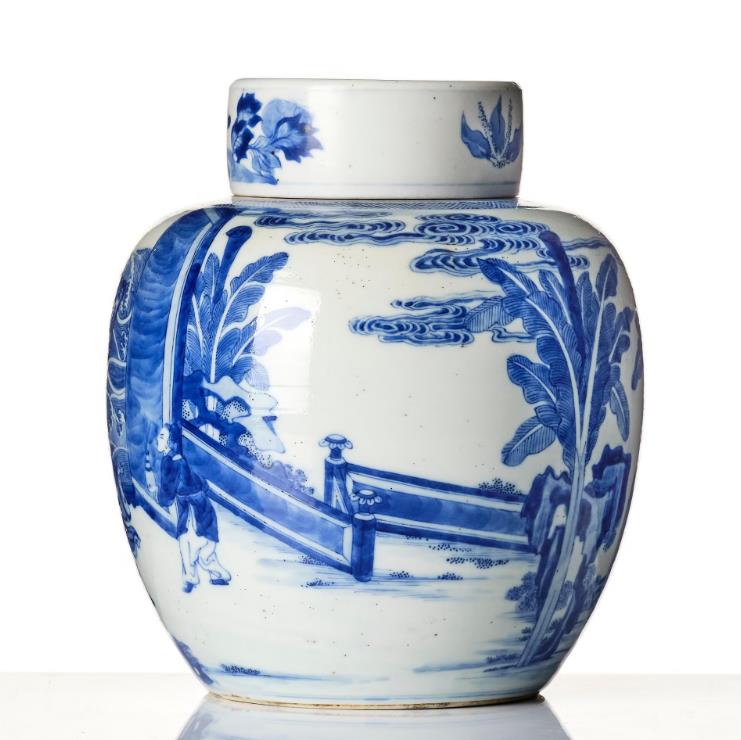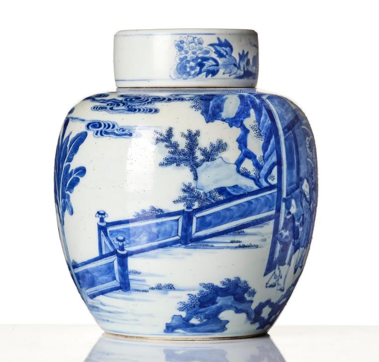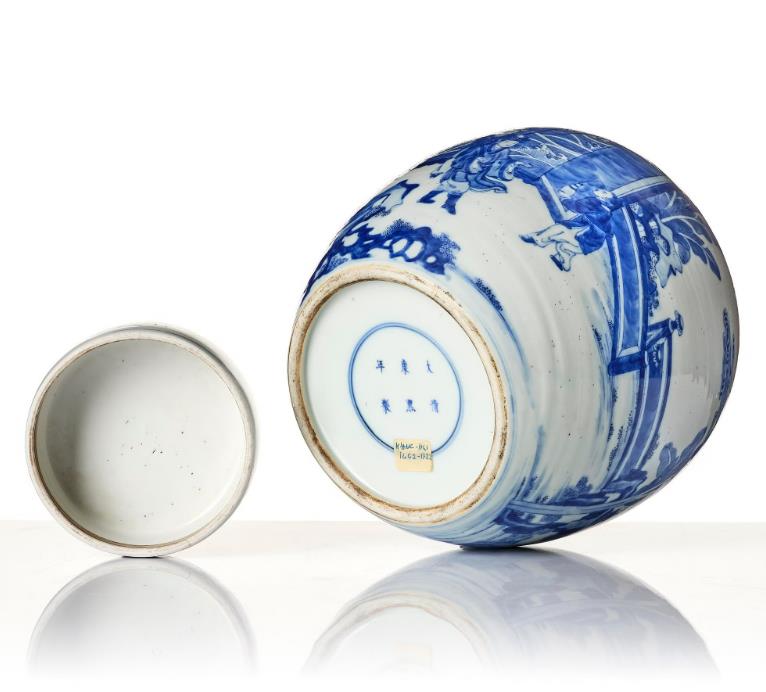 Qing dynasty, 19th century. The cover, 17th century. Of ovoid shape with an unglazed rim, decorated in a vibrant underglaze blue with a figure scene from court life. Base with a six character Kangxi mark. Height with cover 23 cm.