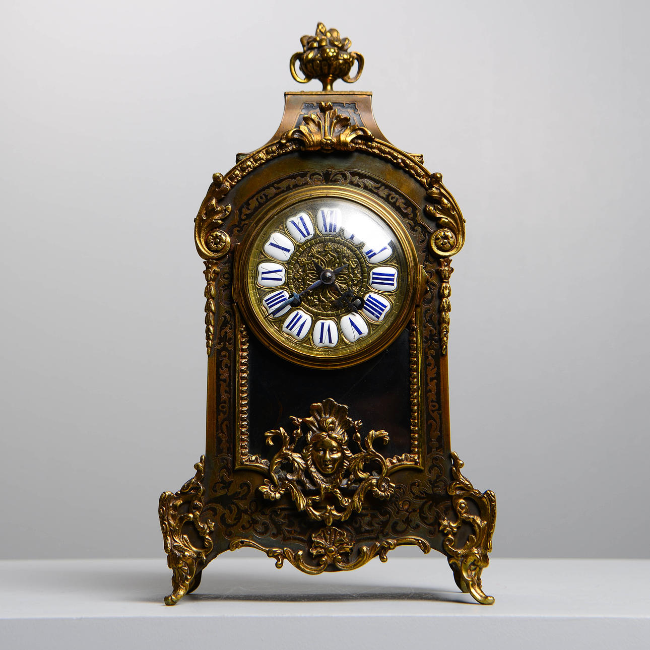 Gold bronzed dial with blue enameled Roman numerals on white porcelain. Height 36 cm. Condition Not functional tested. Damaged and repaired back. 25843