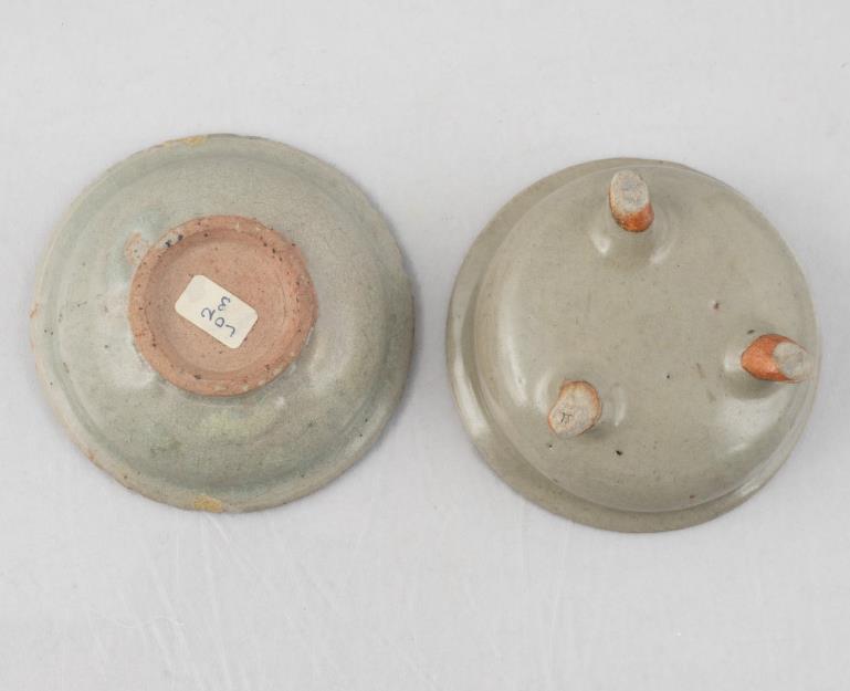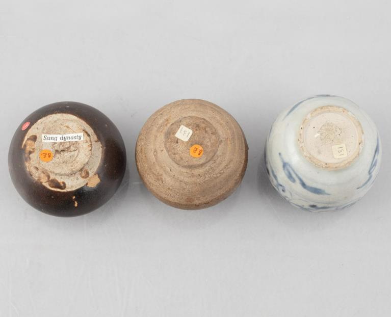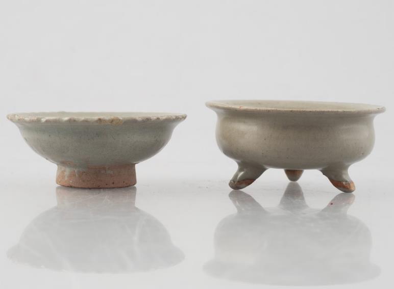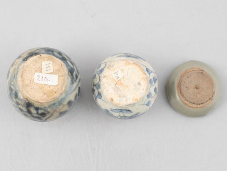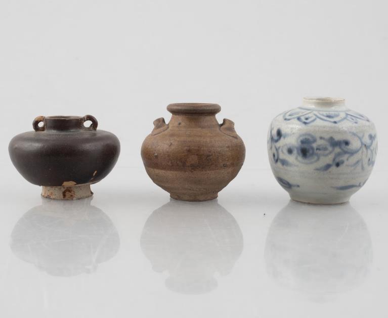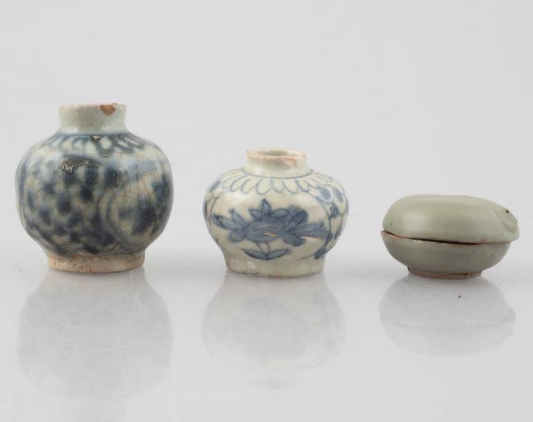 Comprising: Two vases with handles, brown glaze, height 5-6 cm. Two dishes/shallow bowls with celadon glaze, one on a round footring and the other with a tripod foot, diameter approx. 8.5, height 3.5-4 cm. Box with cover, celadon glaze, diameter 4.8 cm. Three jars with decoration in underglaze blue, made for the Southeast Asian market, height c. 4.5-7 cm. Wear. Matt glaze. Chips.