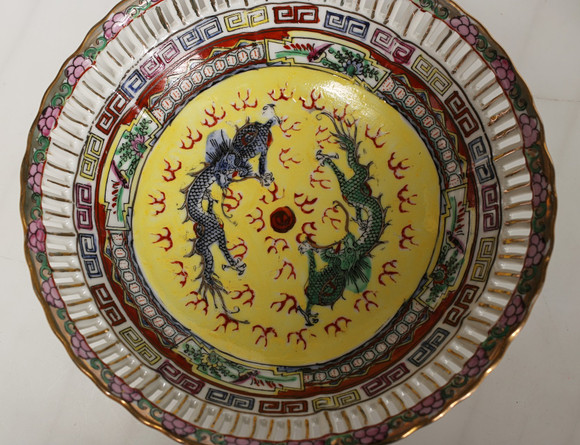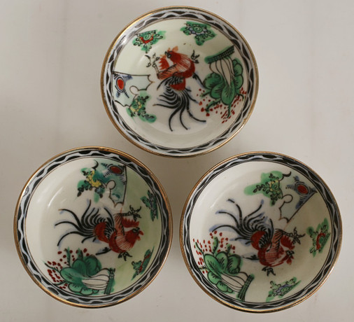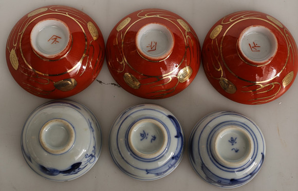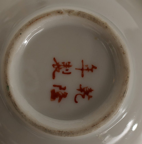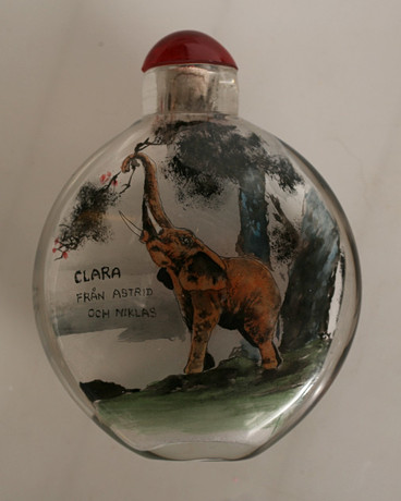 Smaller cups, larger portion for Sake“. two sets contain three in each. In the next group, two match, and one of them is an addition. A bowl dish with lattice rim, and dragons chasing the flaming pearl. Finally, a snuff bottle with inside painting, one side with an inscription in Swedish. CLARA from Astrid and Niklas. Largest diameter in the group 20.6 cm. Fitness report Light use wear. 10520