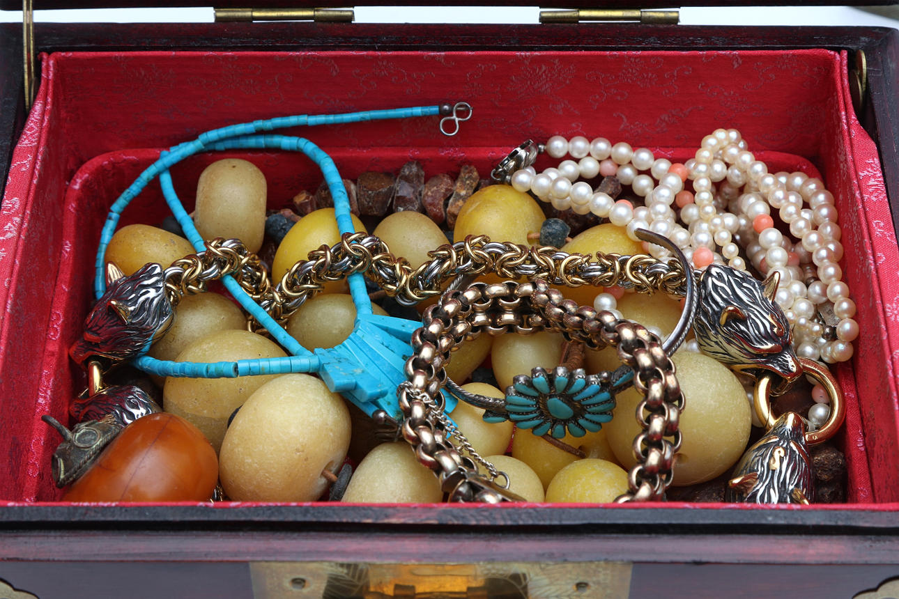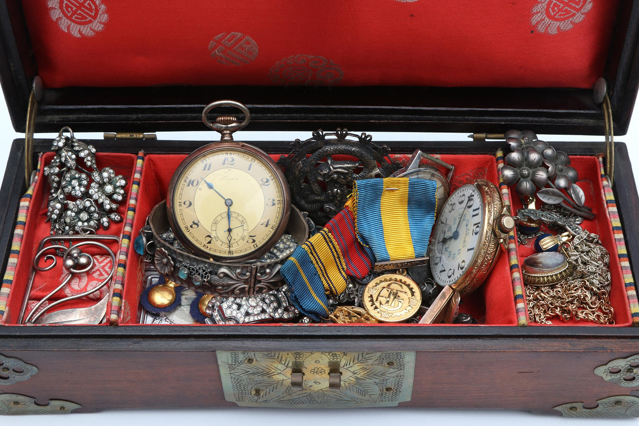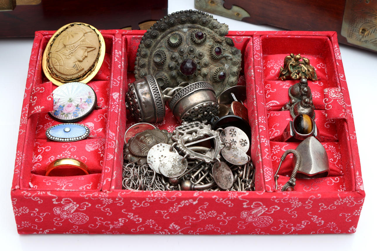 Silver jewellery including costume jewellery and enamel brooches.. Metal jewelry, bijouterie, pocket watches, wristwatches Zodiak hermetic manual etc. Condition Injuries occur. 8806