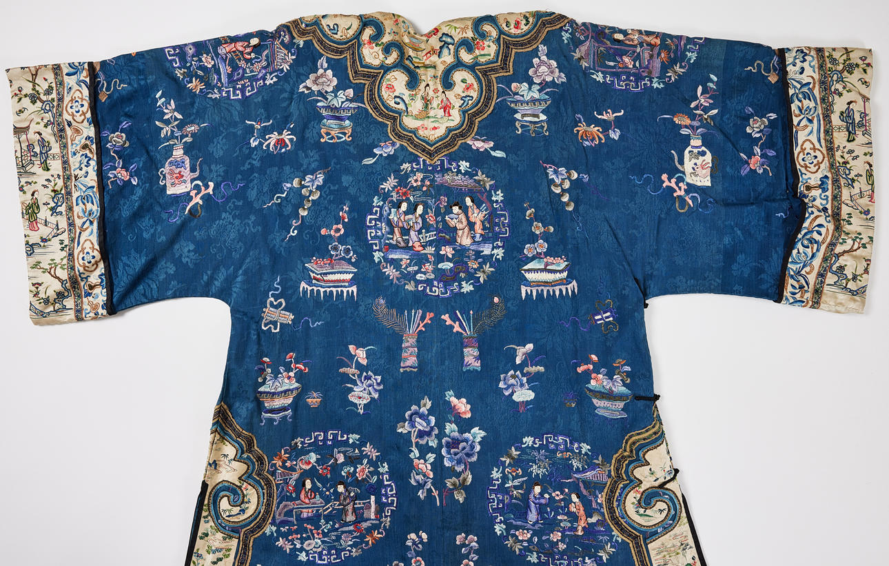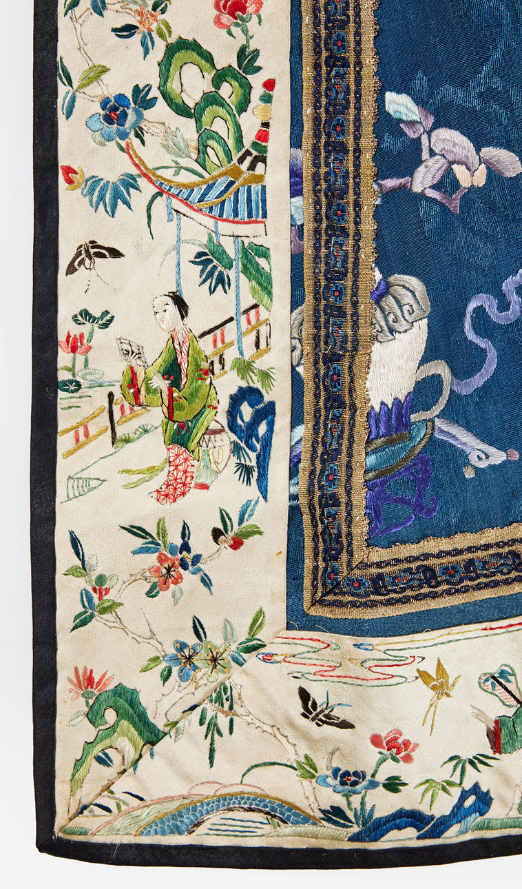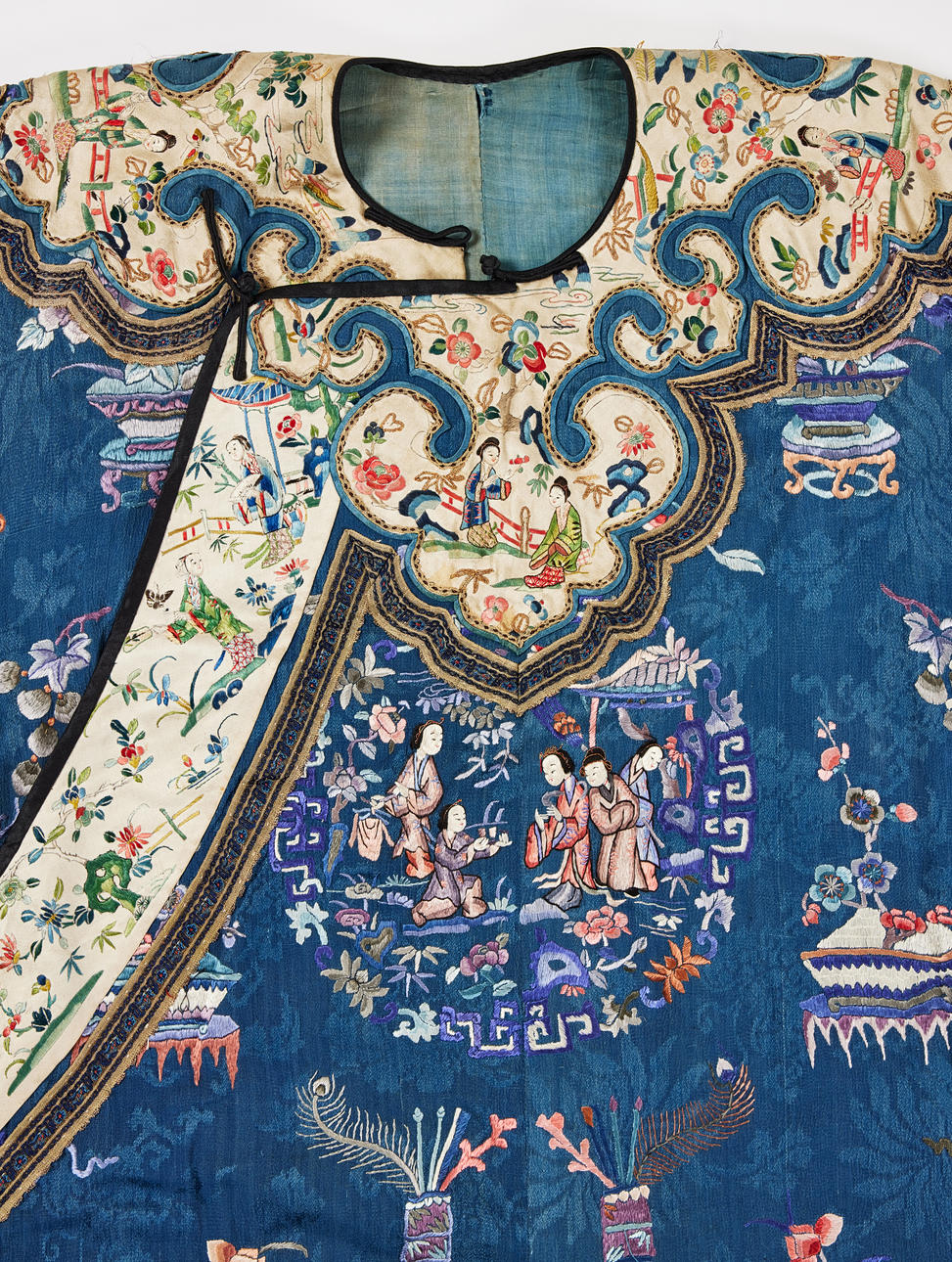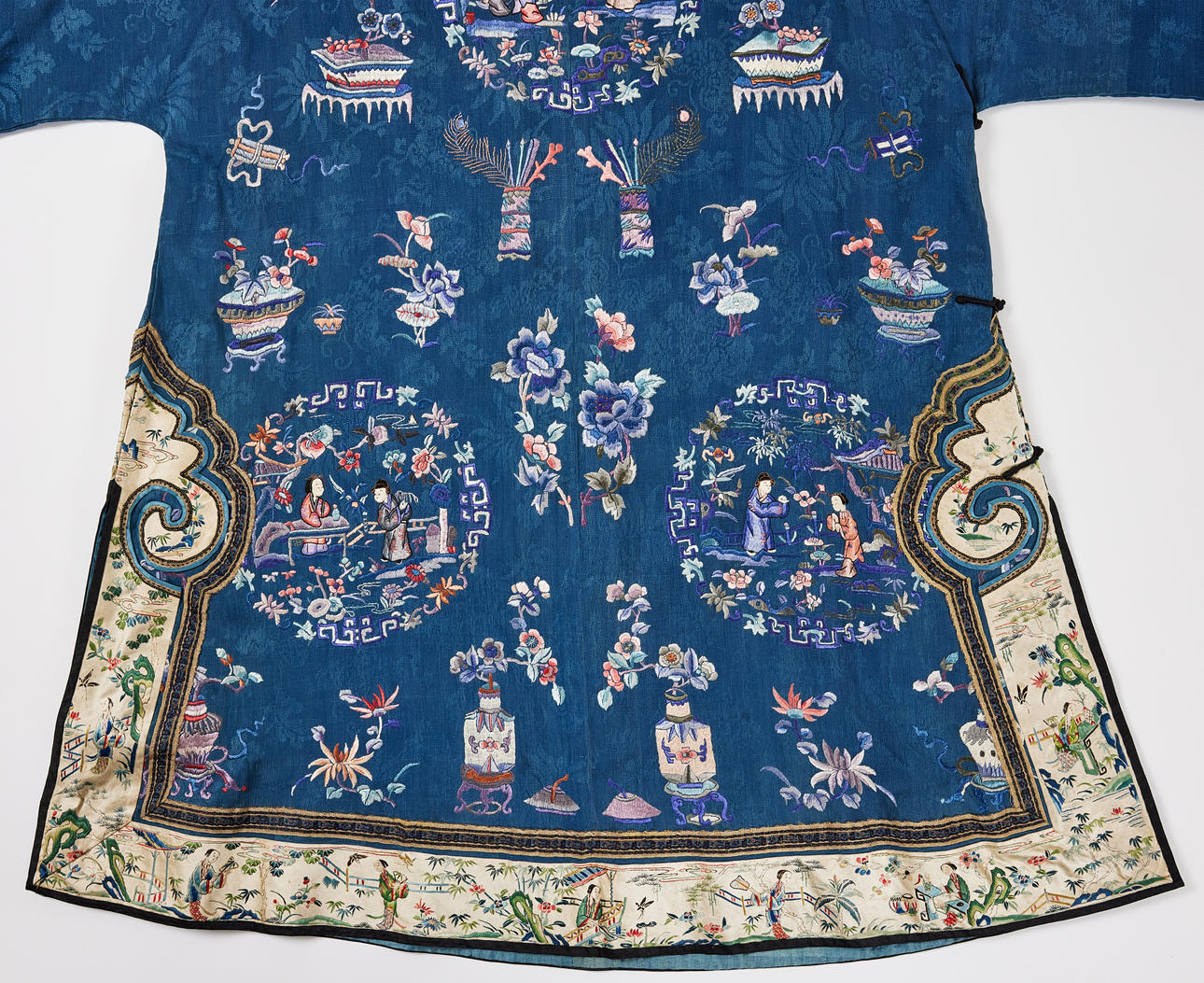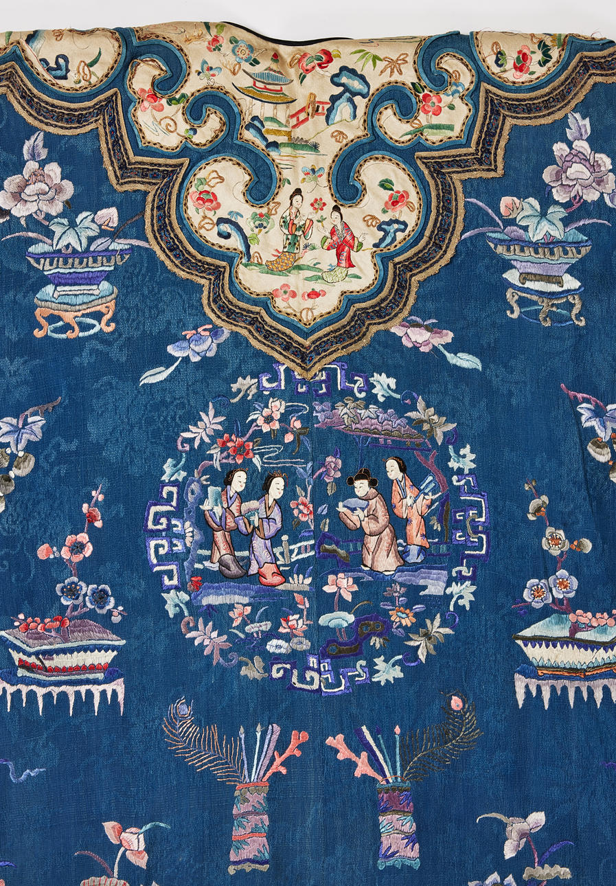 Embroidered with roundels of figures in landscapes, flower blossoms and foliage, surrounded by scattered floral sprays and antiquities against the blue ground, the sleeves, cloud-collar and hem lines with cream-white silk bands embroidered with flowers and elegant ladies, late Qing dynasty, length c. 115 cm. PROVENANCE: Elise Åkerhielm (1887-1978), Mälsåker Castle, Sweden. Condition Wear. Minor damages and stains. Please contact elisabet.fellbom@auktionsverket.se for more information. 38641