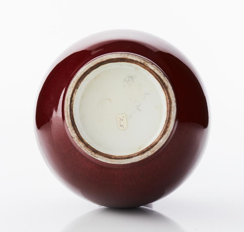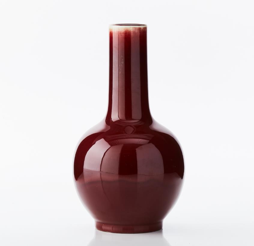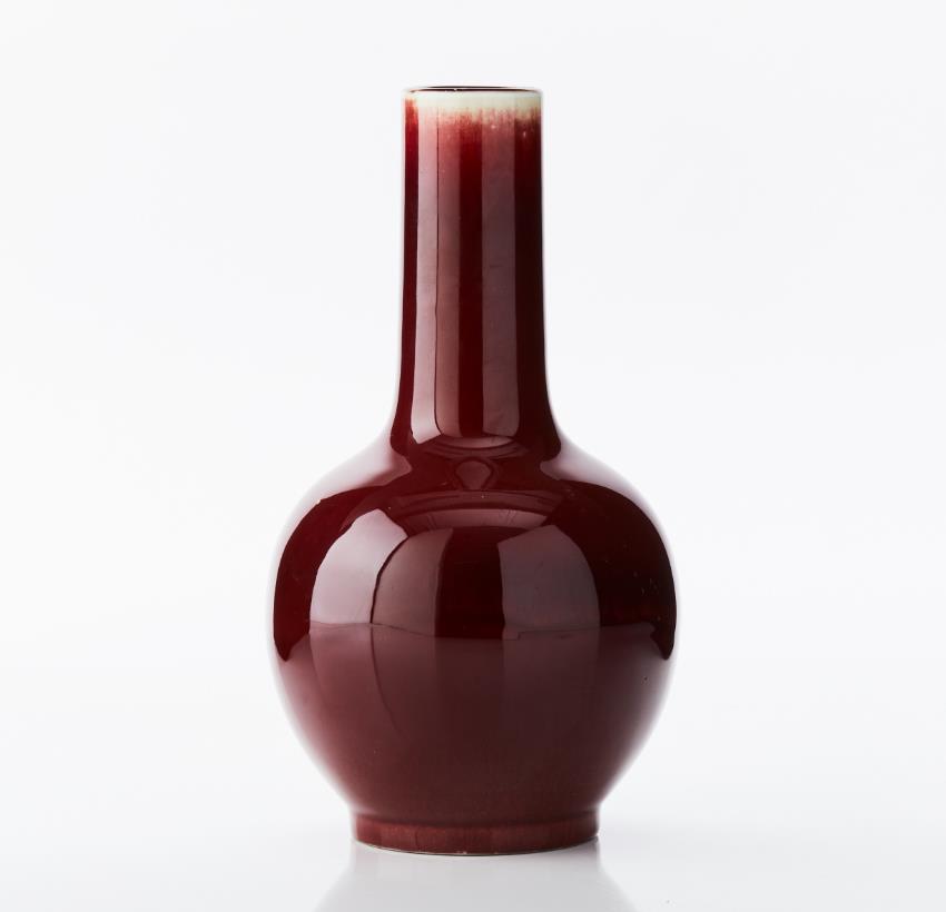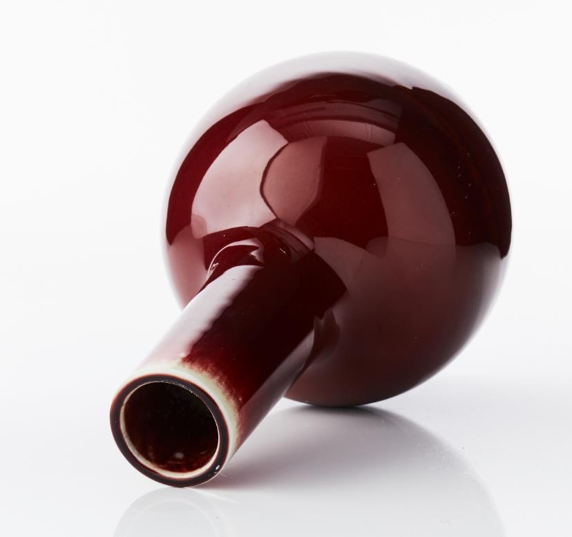 A ’Langyao’ or ’Sang de Boeuf’ Monochrome Porcelain Vase, Tianqiuping The bulbous body rising to a tall cylindrical neck, covered to the exterior with a bright red glaze thinning at the mouth to reveal the light porcelain body, the rim with an applied brown colour, the base glazed. Period: 19th century. Height: 25.5 cm.