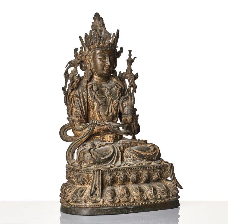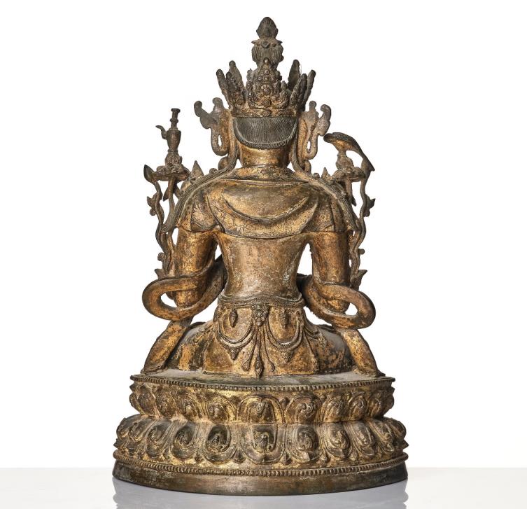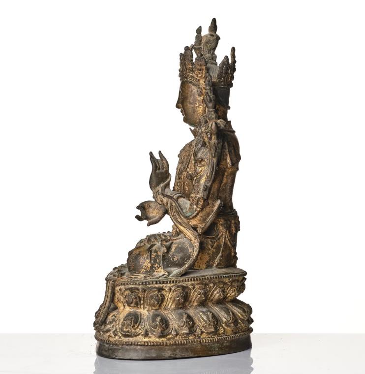 Cast seated in dhyanasana on a double lotus base, the figure is dressed in loose, flowing robes and elaborate beaded jewelry. The hands are held in vitarka mudra, each holding a leafy stem rising to the shoulders and surmounted by a bird on one side and a vase on the other. The face has a serene expression, and the hair is fashioned into a chignon centered by a crown where the figure of Amitabha Buddha to the center is missing. There are traces of gilding and red lacquer. Height 34.5 cm. Repair to crown.