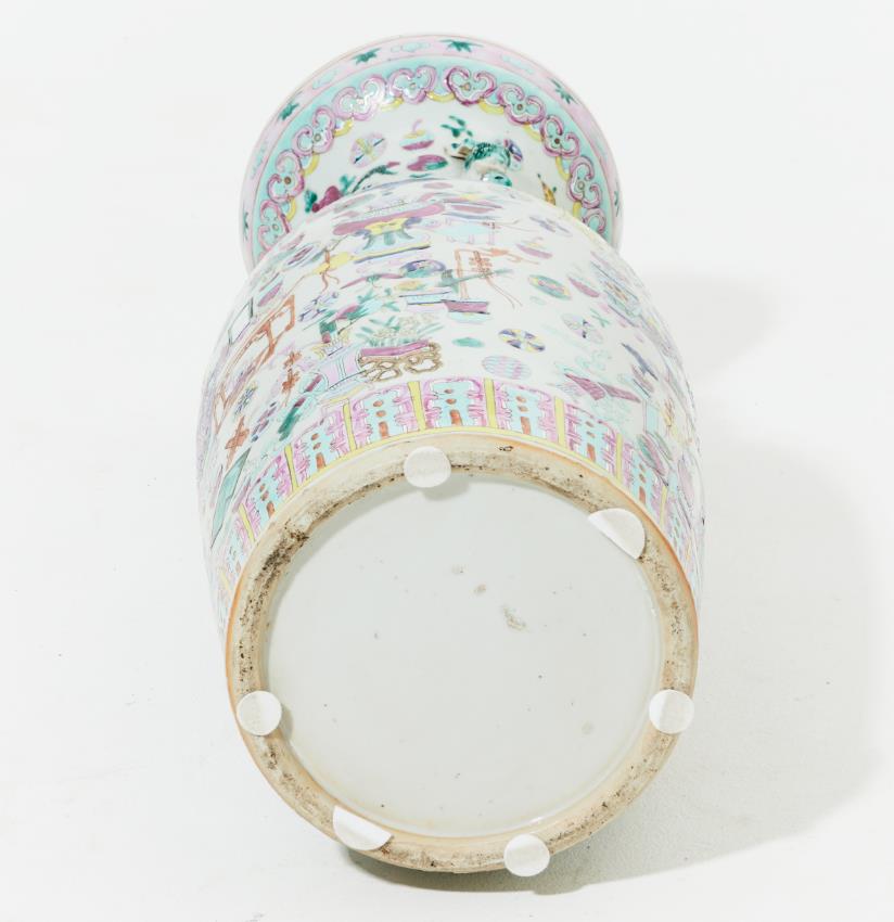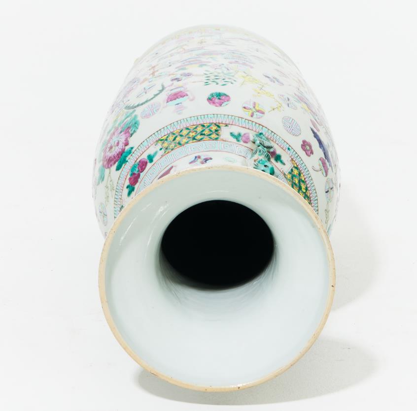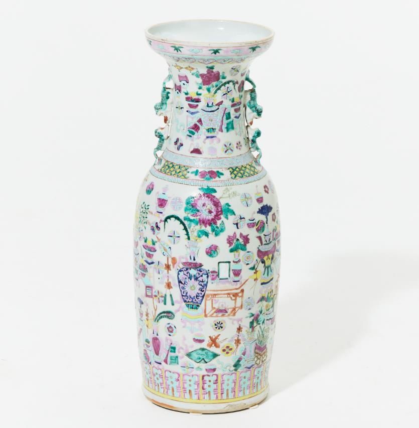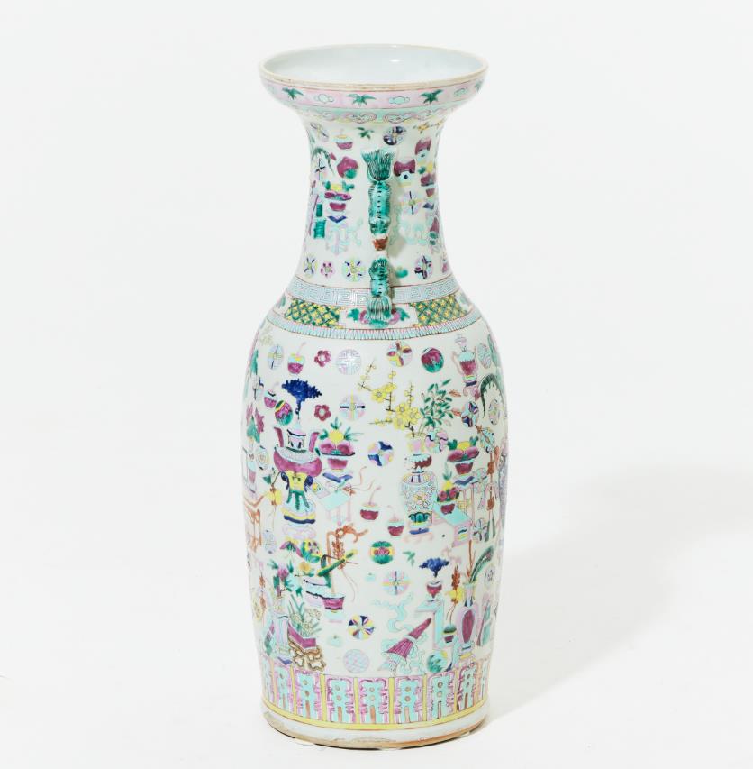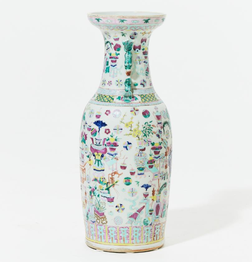 A Large Chinese Famille Rose Porcelain 'Hundred Antiques' Vase Period: late Qing (1644-1912). Height: 60.5 cm. Konditionsrapport Wear. Chips/glaze chips.