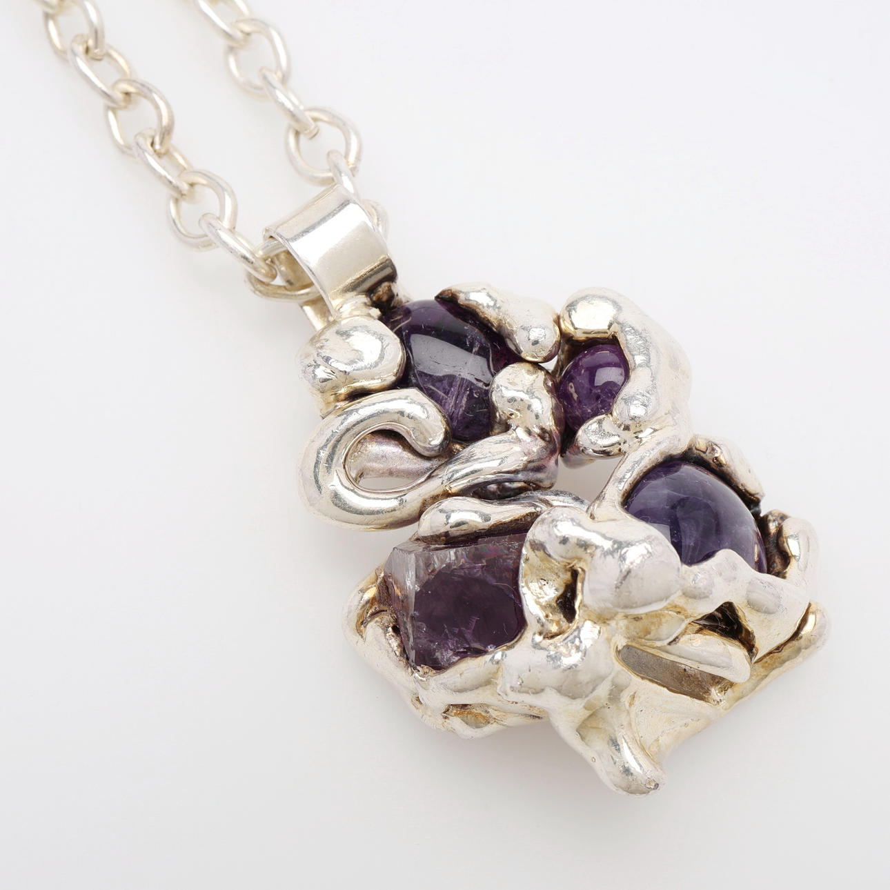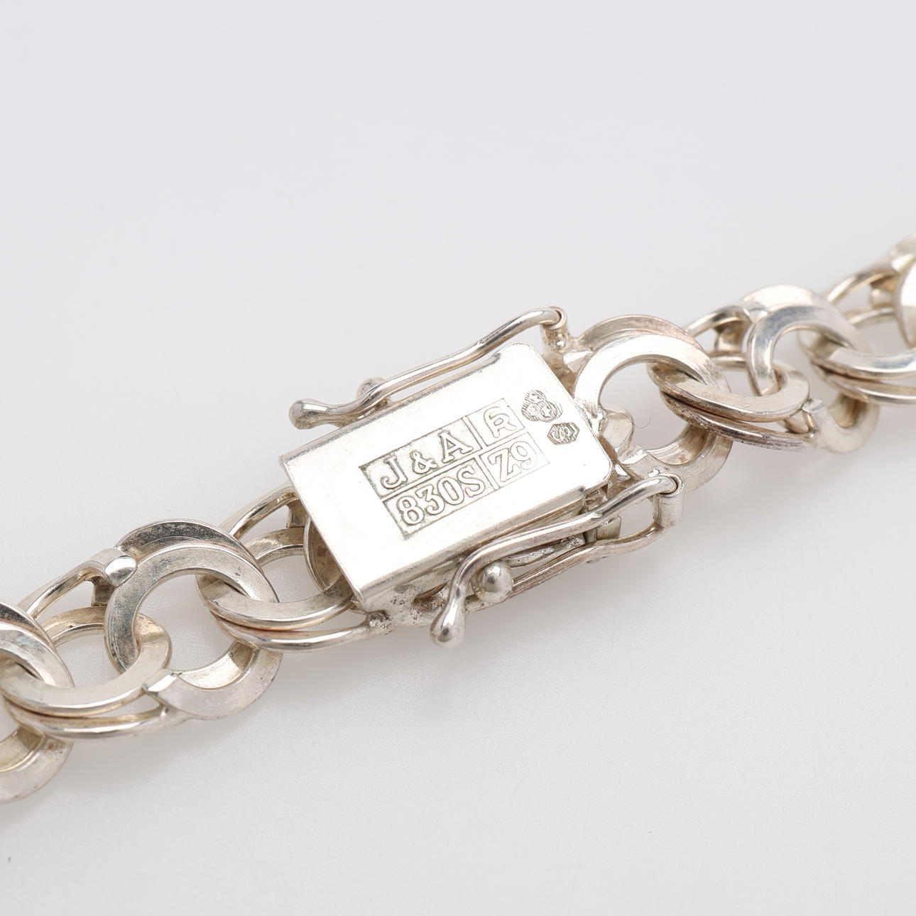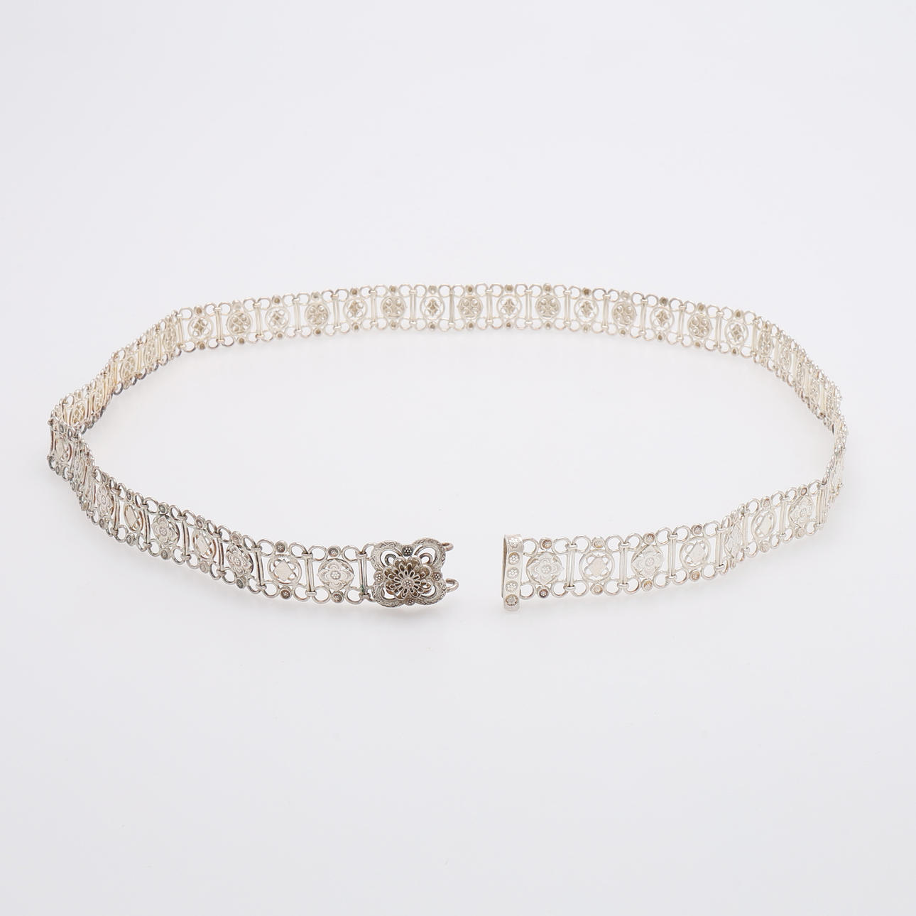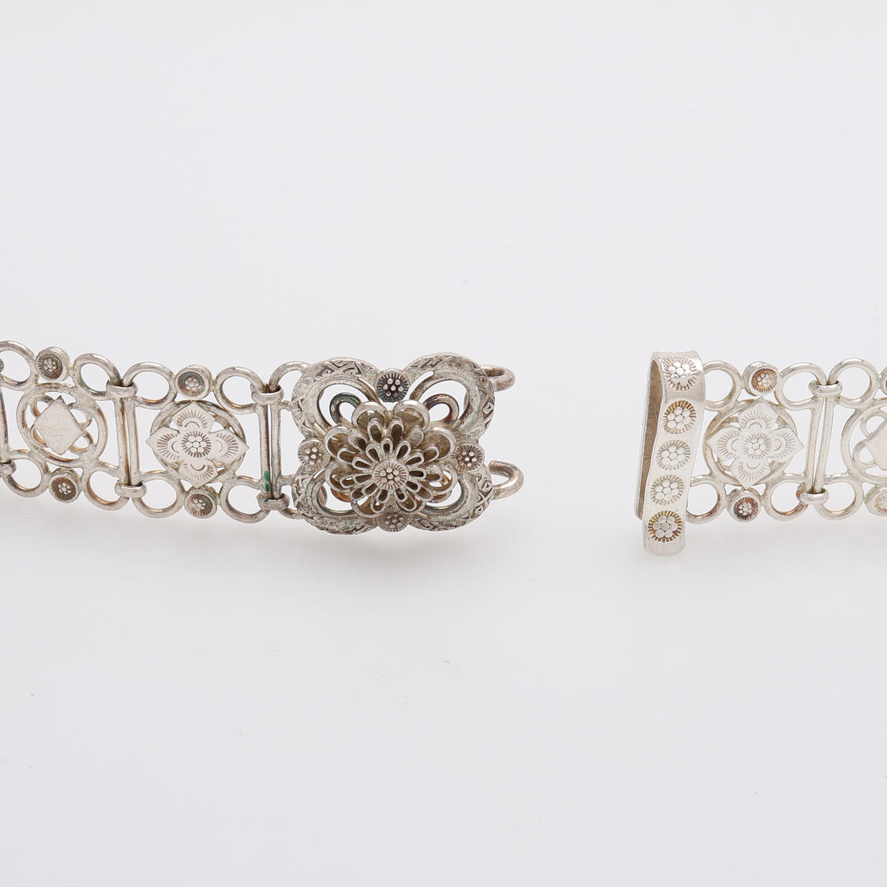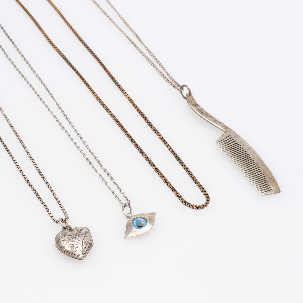 One belt, foreign stamps, length 80 cm. A bracelet with brown crystal, Smykkesmede, Denmark, 1970s, measures approx. 6x5 cm. Bracelet, rings and rods, length 18,5 cm. A necklace with pendant with amethysts, Annette Borke, Denmark, chain length approx. 74 cm, pendant height 5,5 cm. A bismarck bracelet necklace, stamped Jo-Ans Guld, Köping, 1974. Length 42,5 cm. Necklace, Venetian link, stamped OSAB, length 59 cm. Necklace with pendant, length approx. 44 cm. Necklace with mustache comb, chain length approx. 54 cm, comb length 6.5 cm. Necklace with heart-shaped pendant, Italian stamps, chain length approx. 41 cm, pendant height 2 cm. 6 pcs pendants, height 1.5-3 cm. 2 pairs of earrings, height 1.5-2.5 cm. Condition Normal wear and tear. 149958