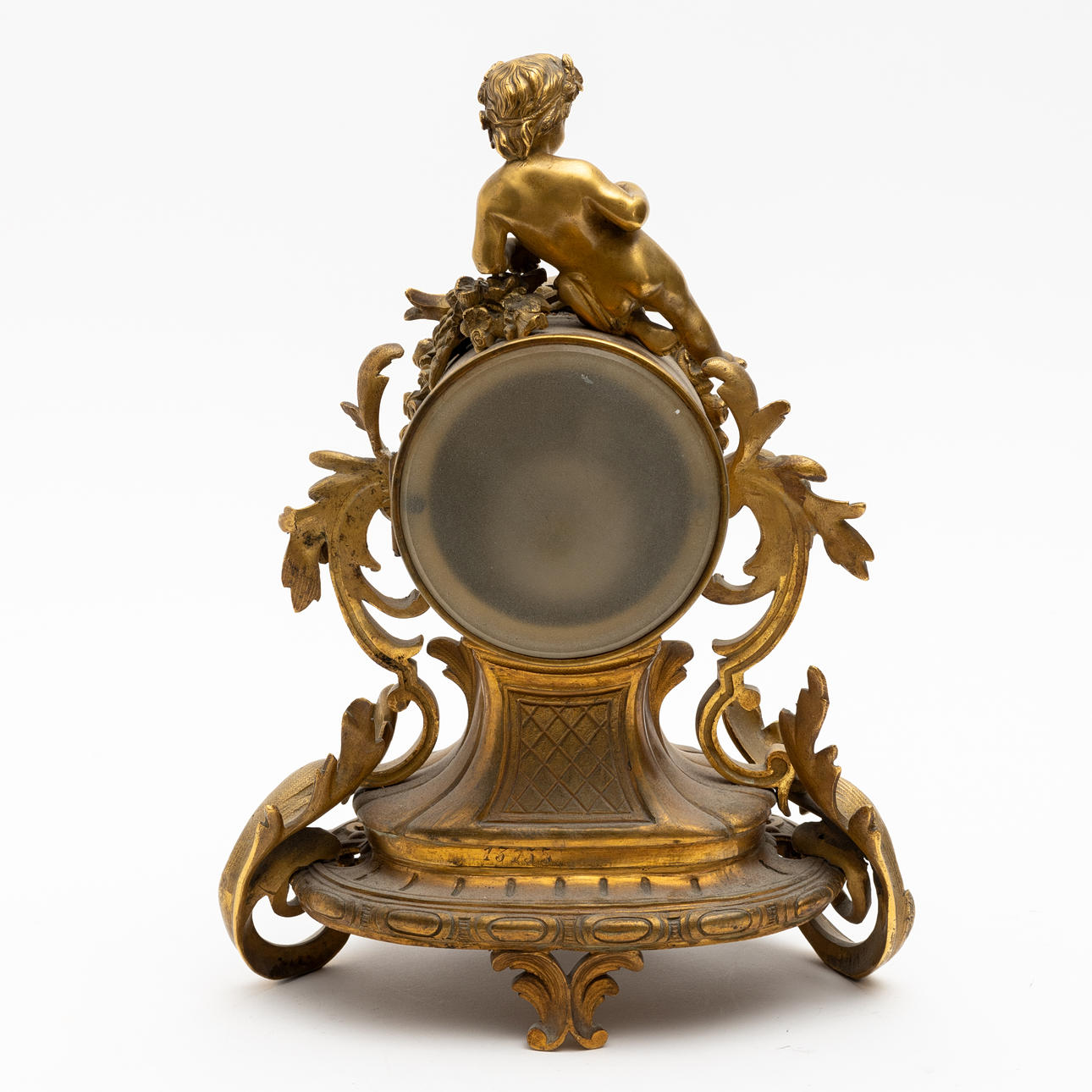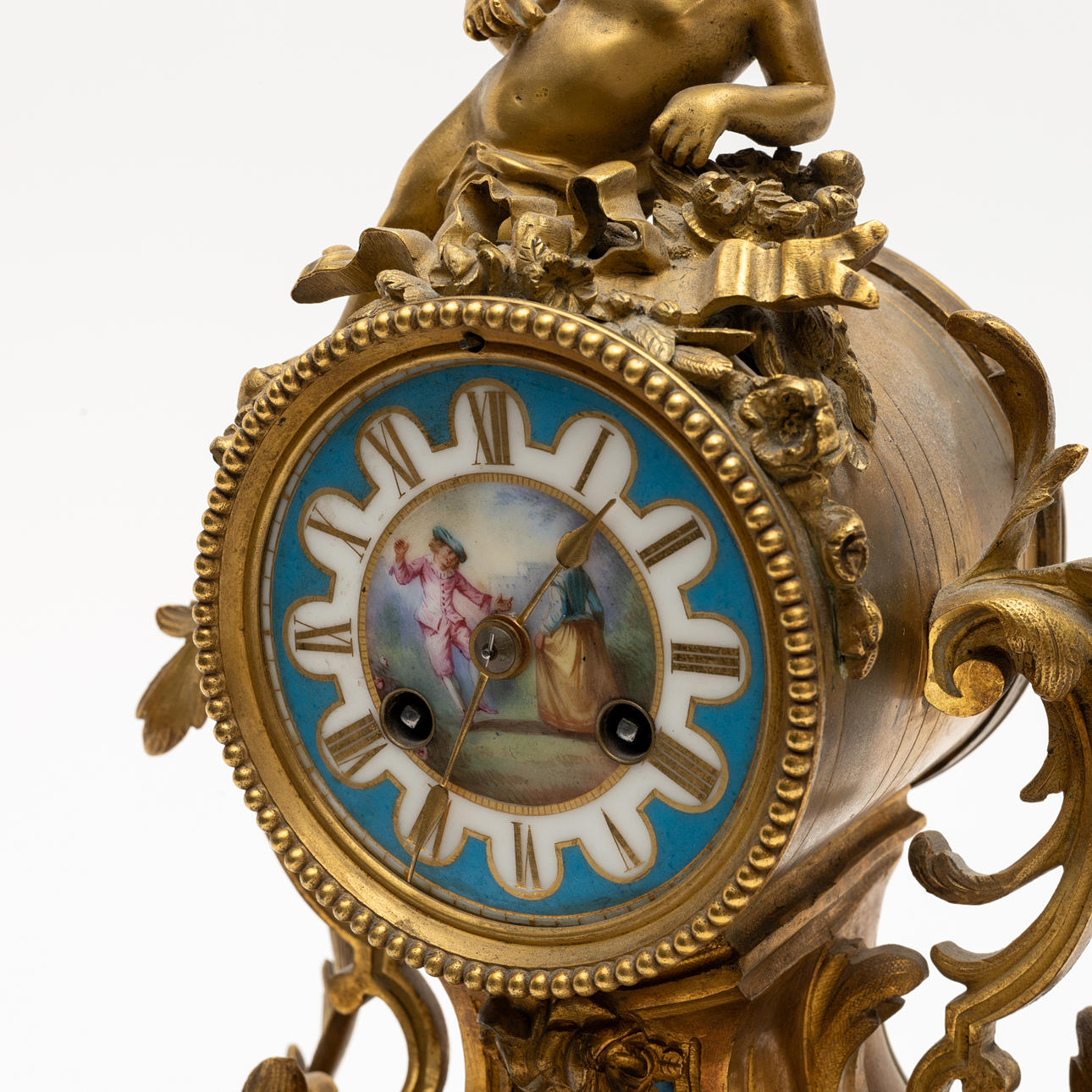 Decor in the form of foliage as well as boy with wreath in his hair. Dial and decorative part in enamel with polychrome figurine scene and musical instruments, width approx. 23 and height 29,5 cm. Clock key available. Condition Slight surface wear, dial with discolorations, not functional tested. Key/keys included. 334813