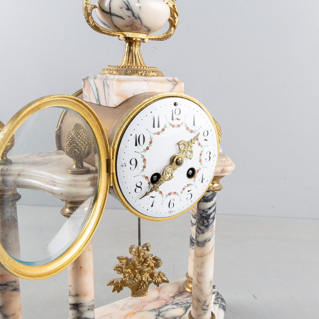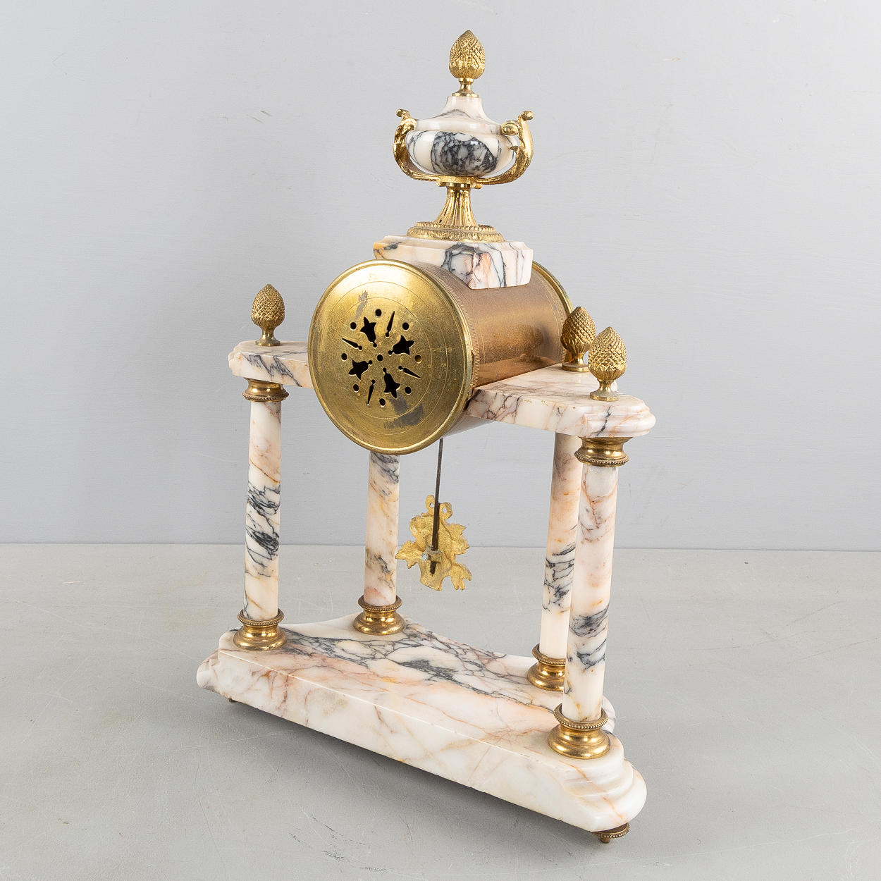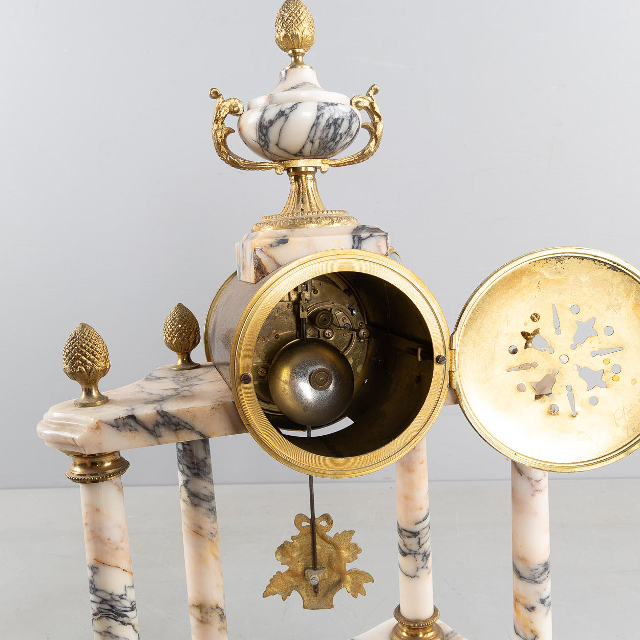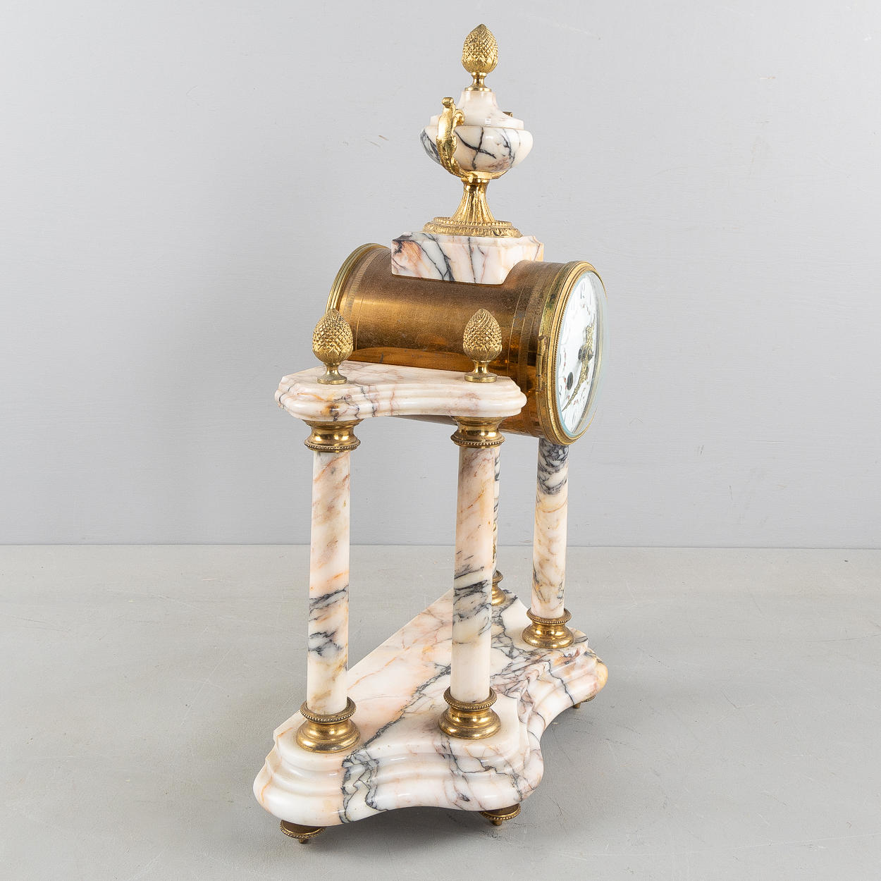 Marble and brass, enamelled dial, height approx. 47, 33x15 cm. Condition Minor chips appear. Key/keys included. 68246