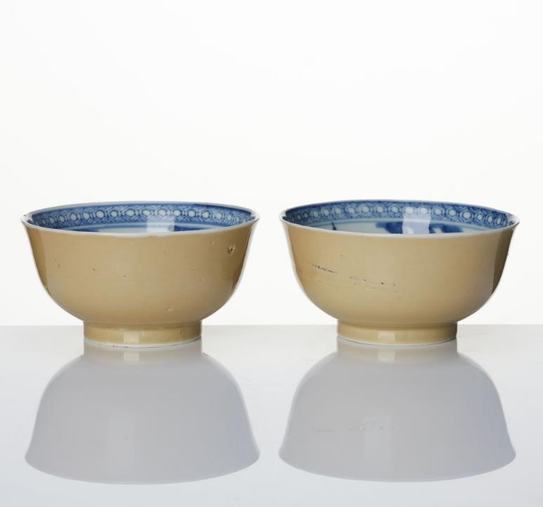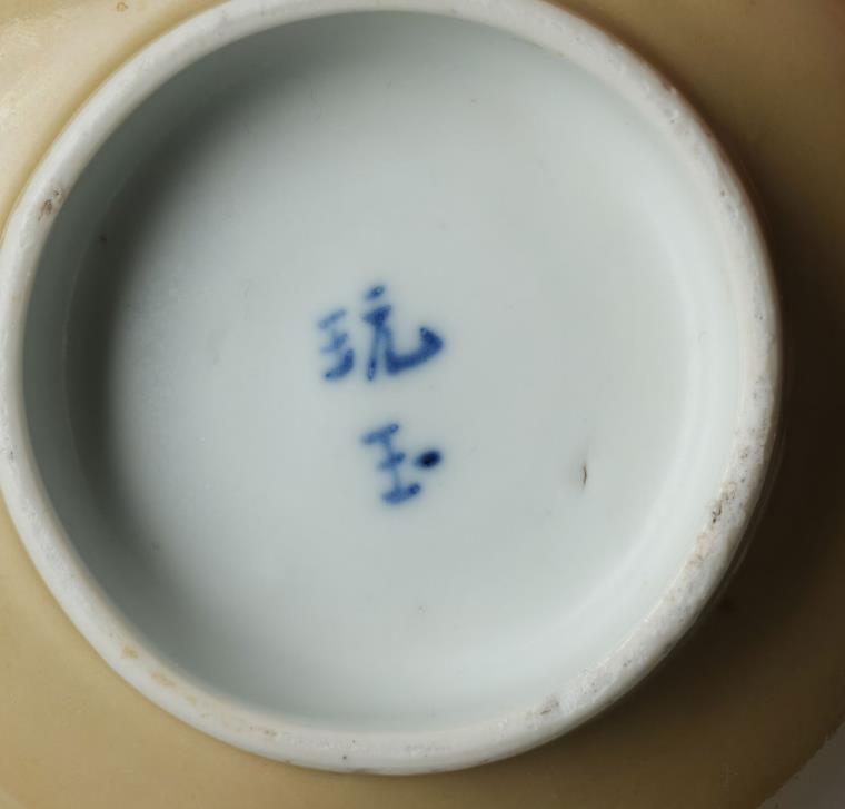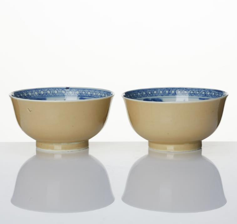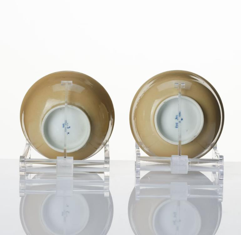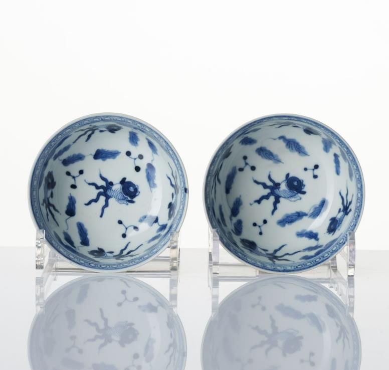 Decorated with underglazed blue goldfish to the interior, the exterior with pale cappuciner brown glaze. Height 6.3 cm. Diameter 12.4 cm. Firing cracks to the sides.