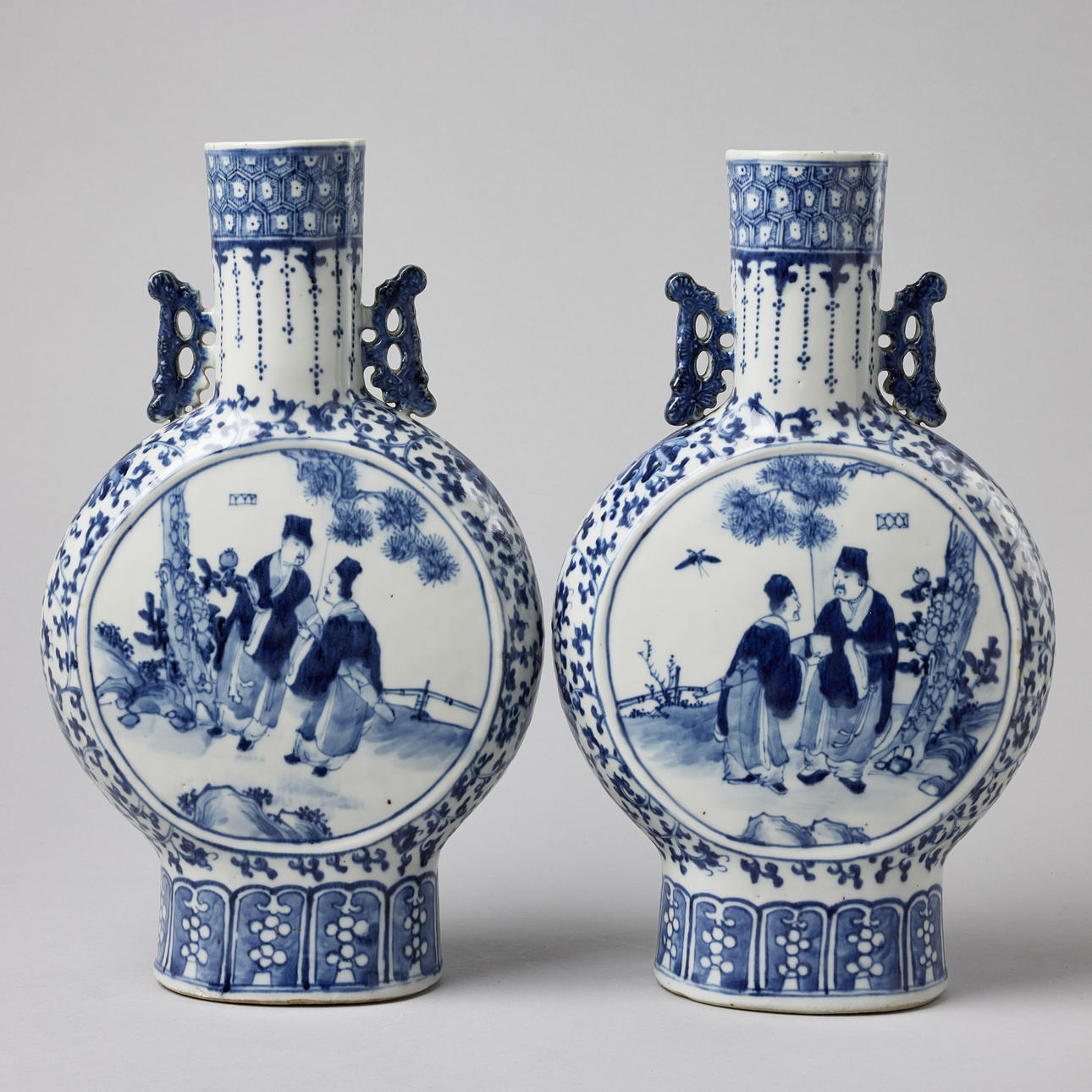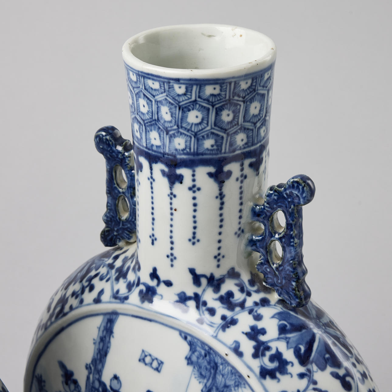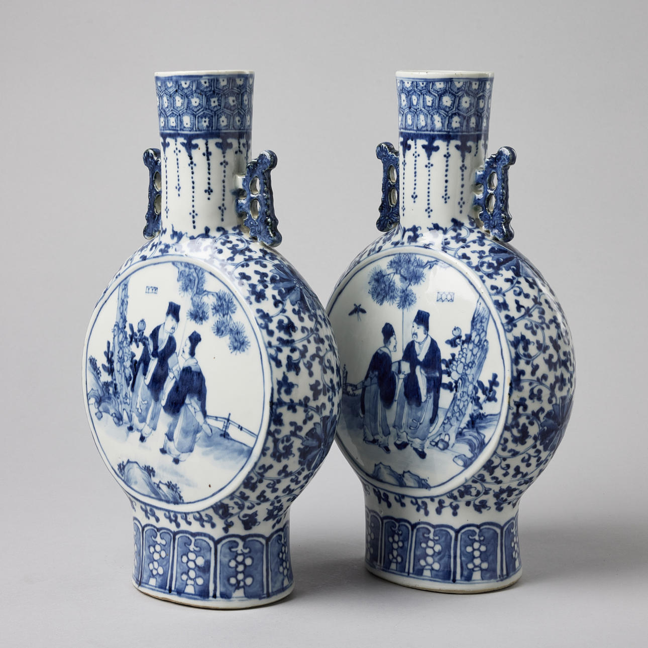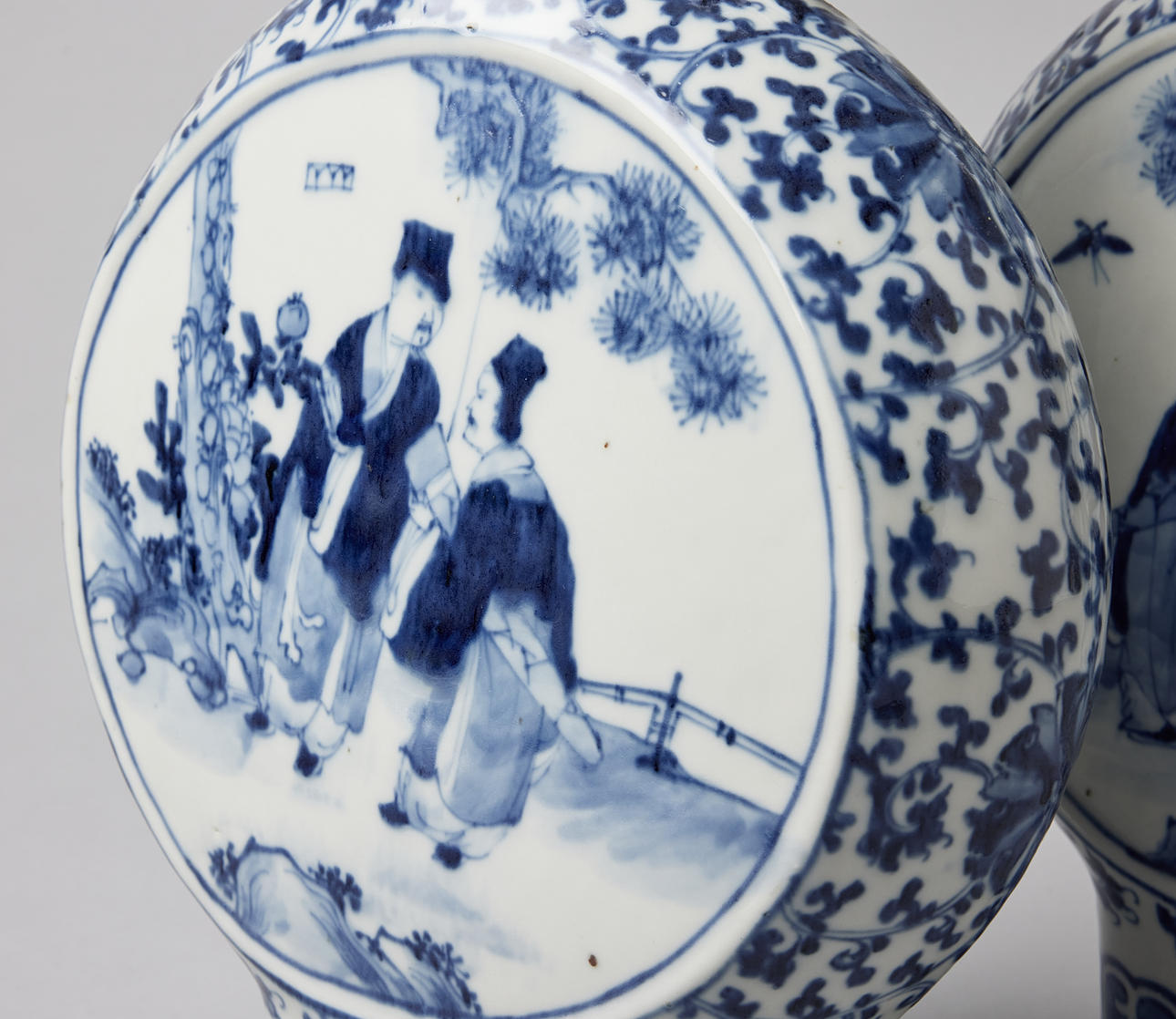 Raised on a tall foot, applied with twin handles, decorated with figures and lotus flowers, Kangxi mark, 19th century. Altura c. 41 cm. Condition Both with cracks. No repairs found with UV-light. 28917