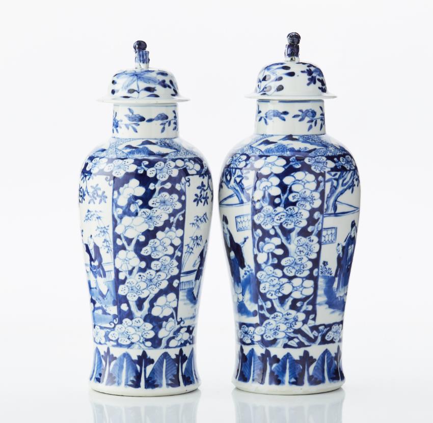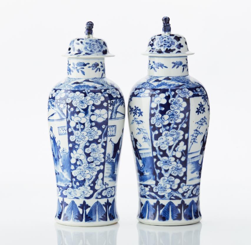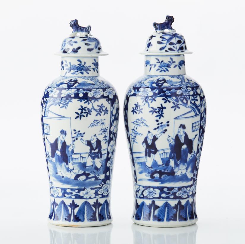 A Pair of Chinese Blue and White Porcelain 'Figural' Vases and Covers