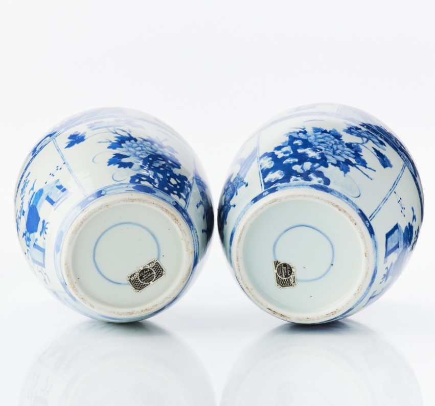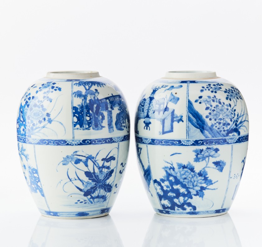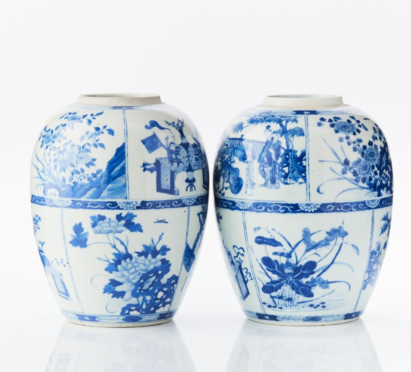 A Pair of Chinese Blue and White Porcelain Jars Of ovoid form, decorated in shades of underglaze-blue with panels enclosing figures and mythological beasts within terraced landscapes, another panel with Xi Wangmu and her attendant with a peach, alternating with panels with blossoms, auspicious objects including censers, scrolls, and books, stylized borders around the foot, shoulder and neck. Period: Qing (1644-1912). Height: 26.5 cm.