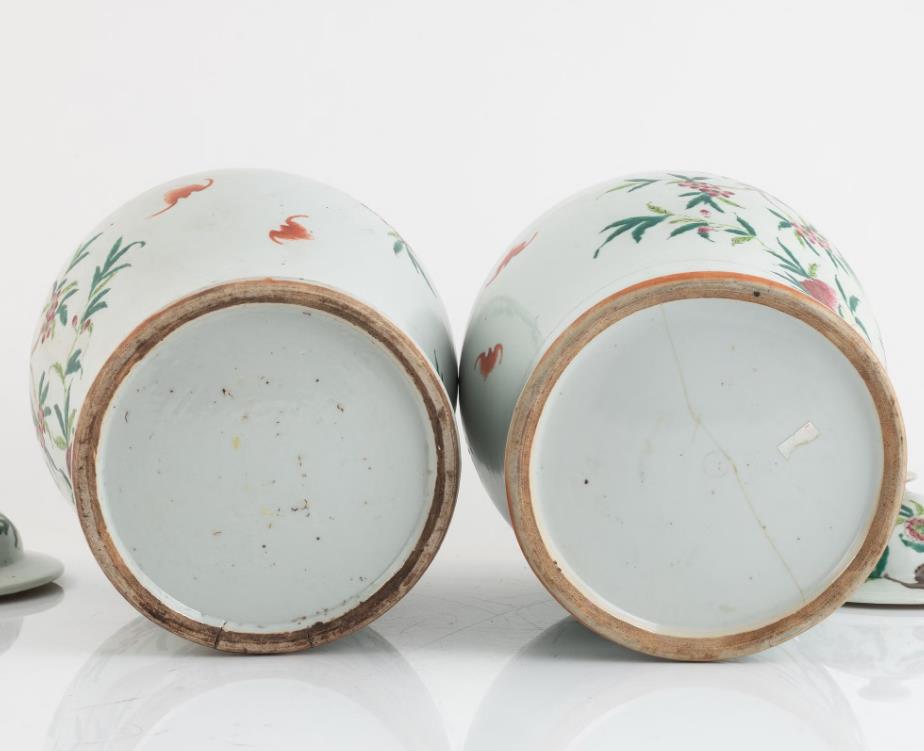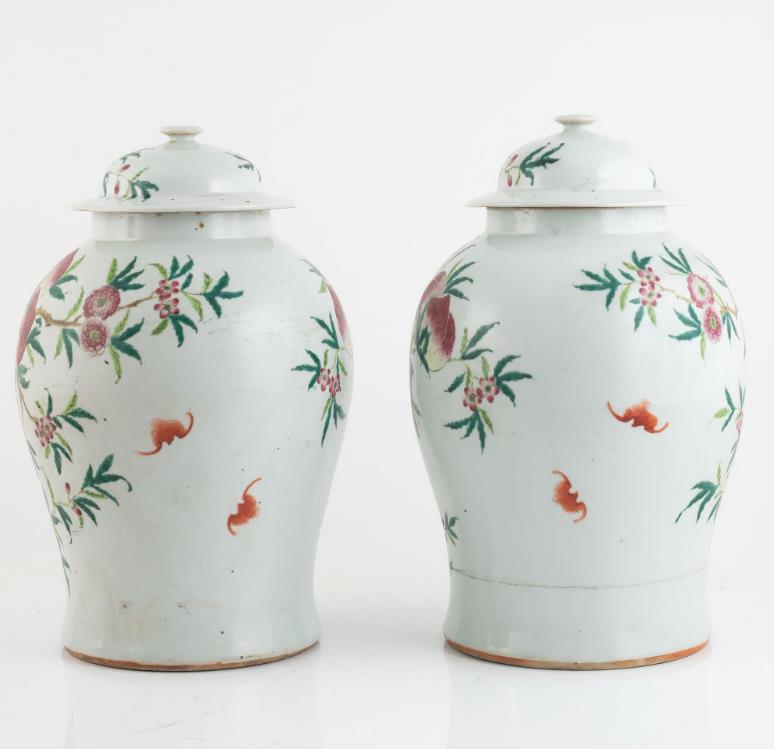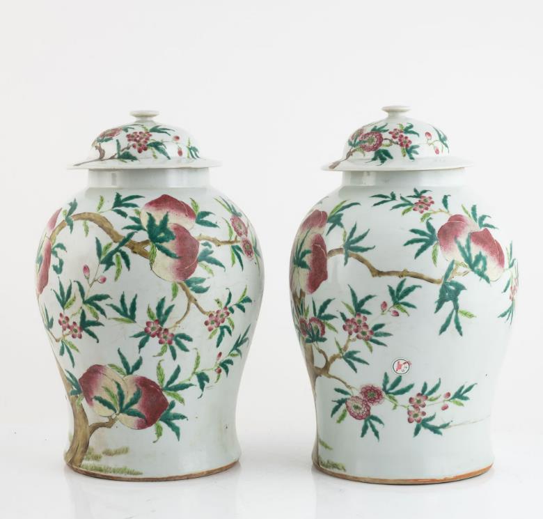 A pair of Chinese famille rose peach vases with covers