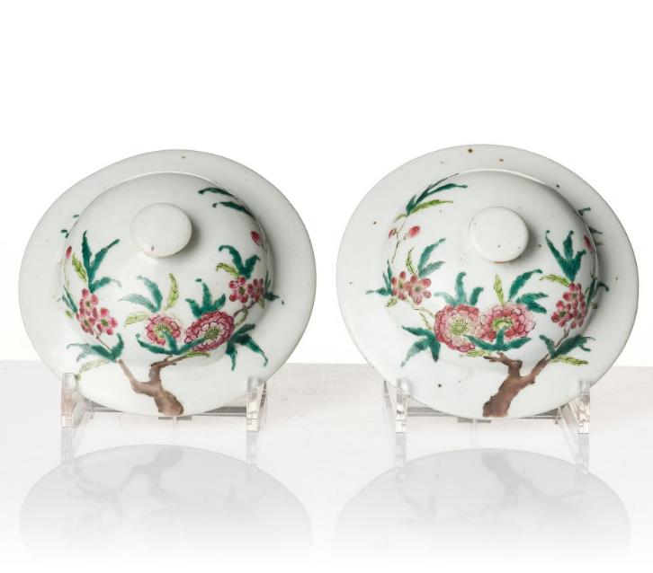 Baluster shape. Decorated with famille rose tress in bloom with peaches and red bats. Domed cover decorated with branches in bloom. Height 39 cm.