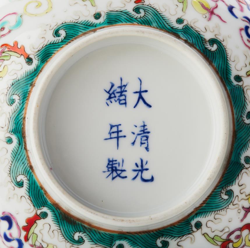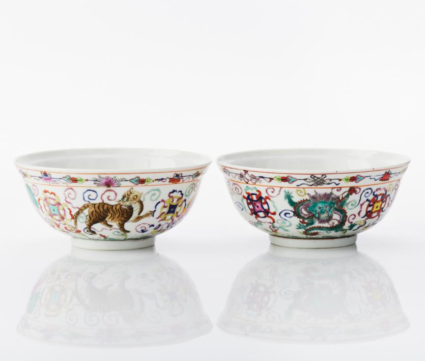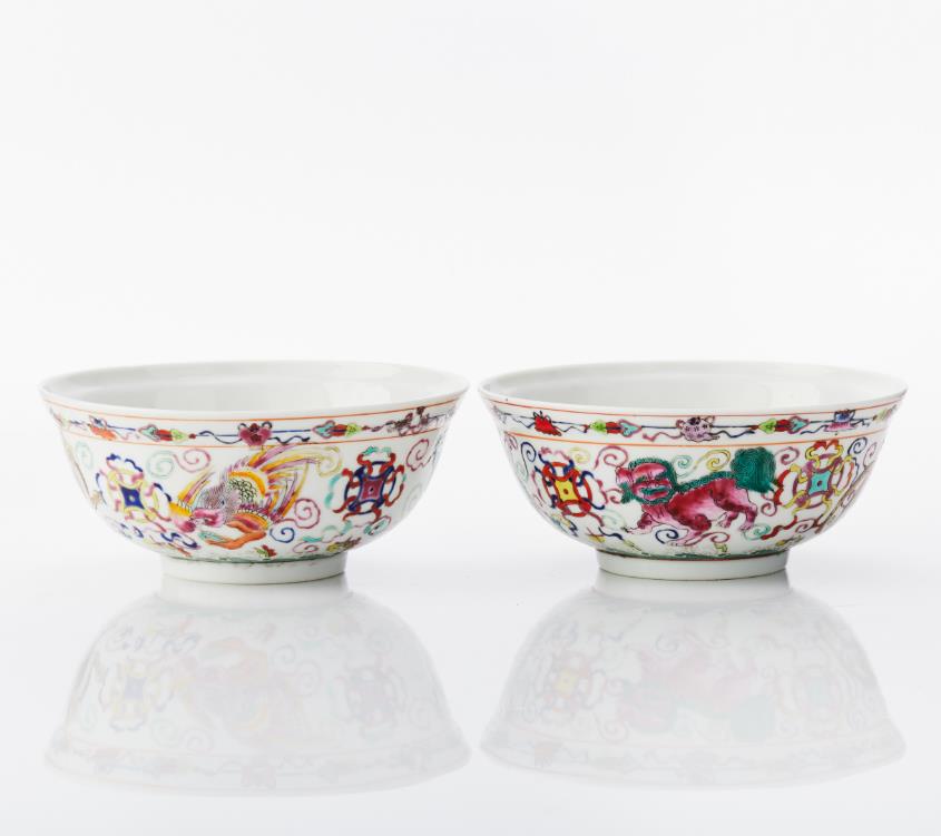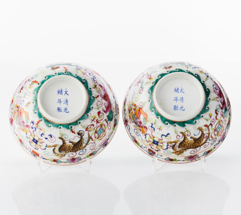A Pair of Chinese Famille Rose Porcelain 'Mythical Beasts and Bajixiang' Bowls The base with a six-character mark of Guangxu in blue enamel. Period: 20th century. Height: 7 cm, diameter: 16.5 cm. Proveniens Sven-Olof Landgren (1917-1981), director at the Swedish industrial company SKF, and consul in Turin, Italy. Thence by descent. Konditionsrapport Wear. Small firing spots.