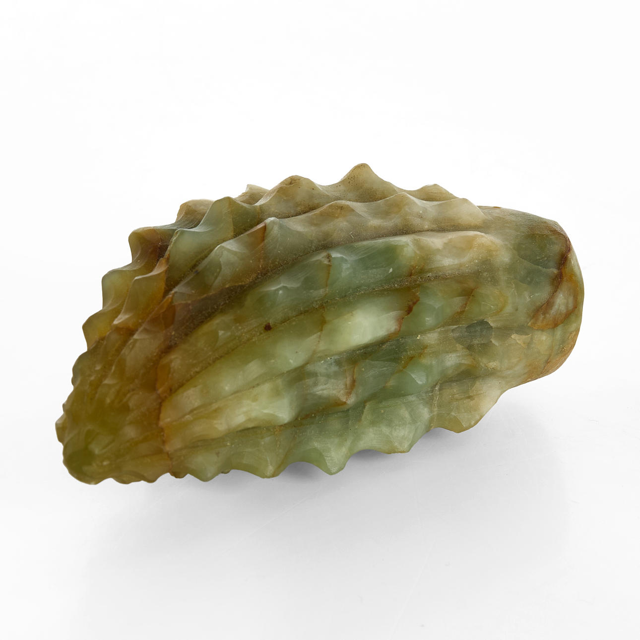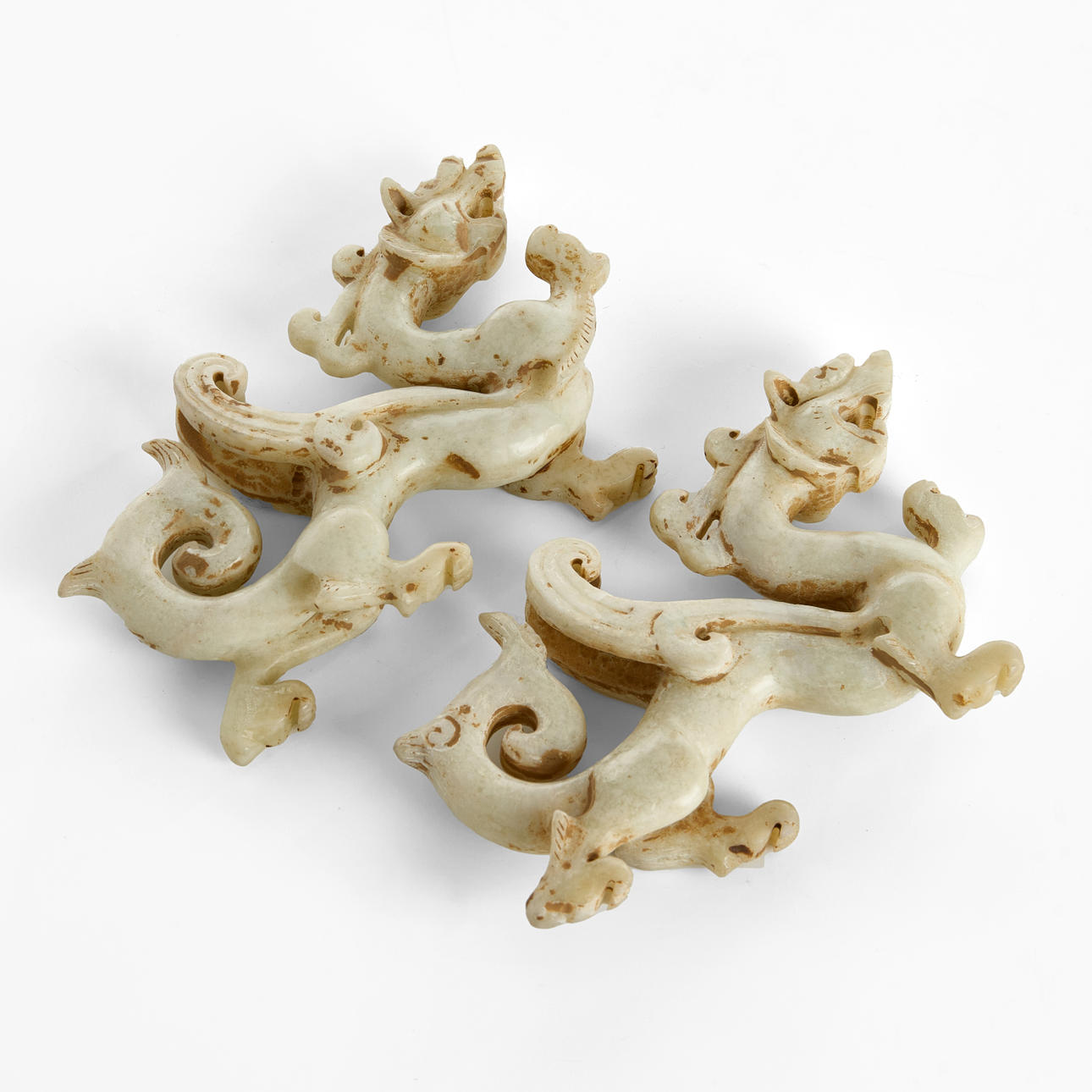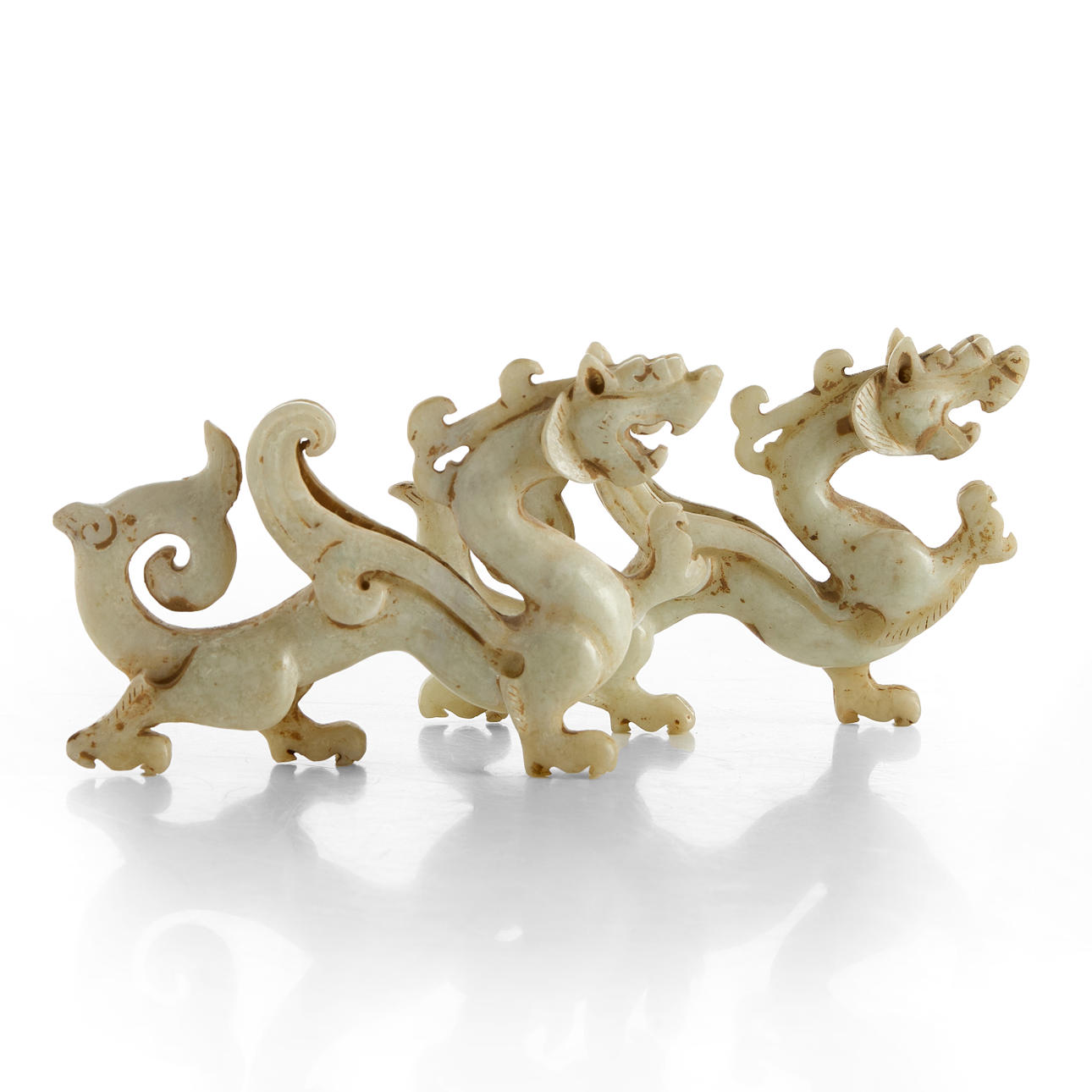 LATE 20TH CENTURY, A PAIR OF DRAGONS AND A FRUIT. The dragons, length: approx. 13,5 cm. Fruit length: 9.5 cm. Condition Small chips and small rejects appear. 99389
