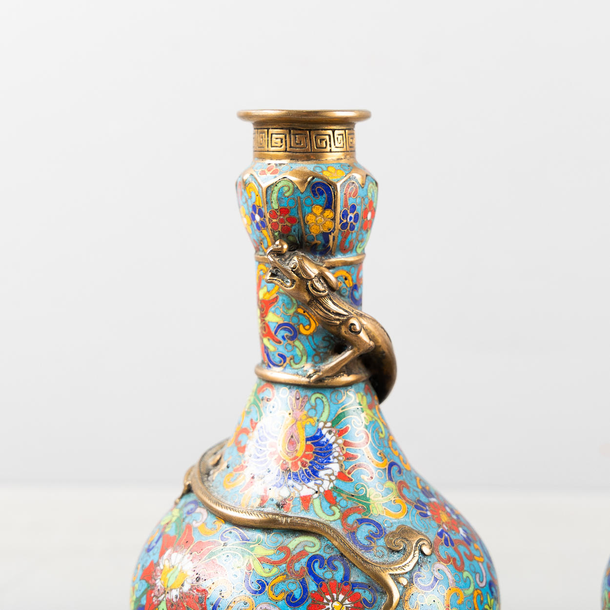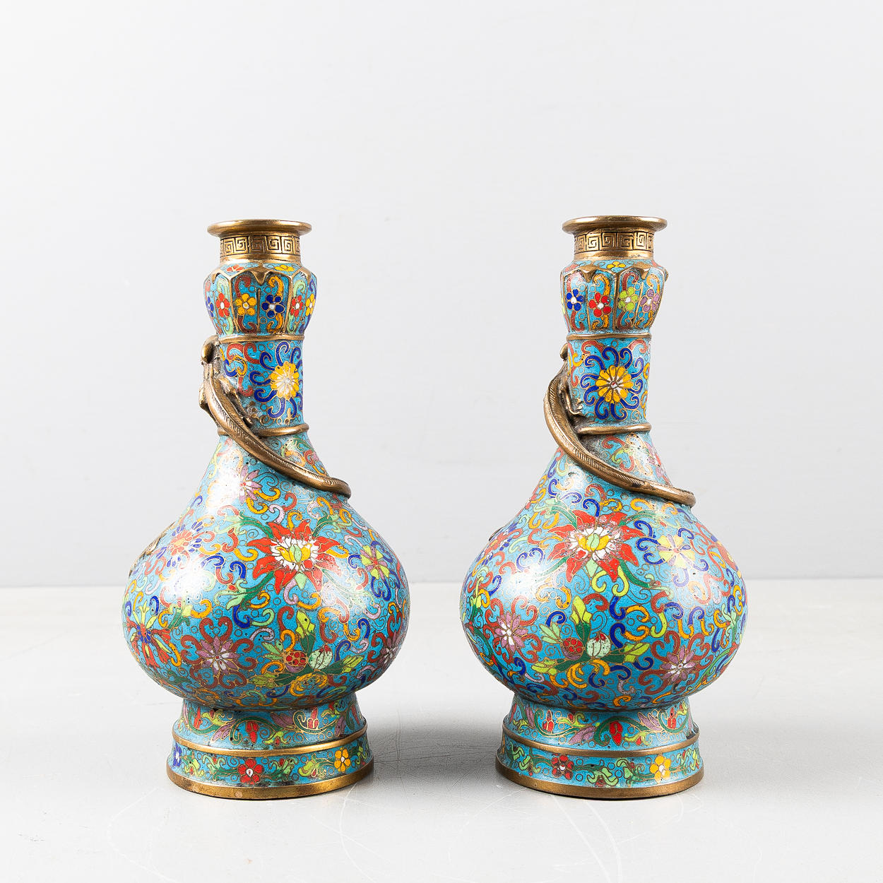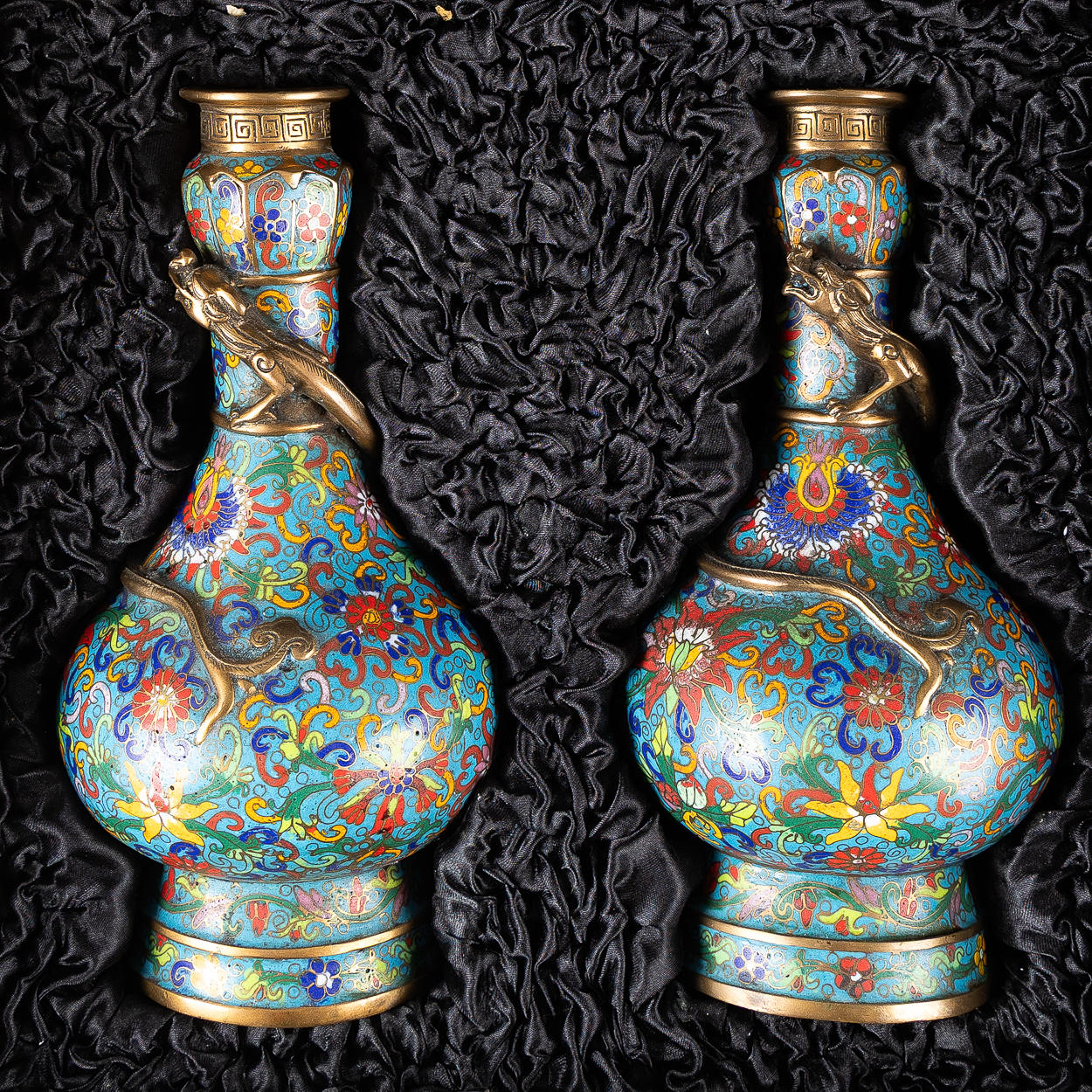 Probably China, decor with dragon, marking on the bottom, heights approx. 22 cm, case, height 14, 32x28 cm. Condition Normal wear and tear. 69614