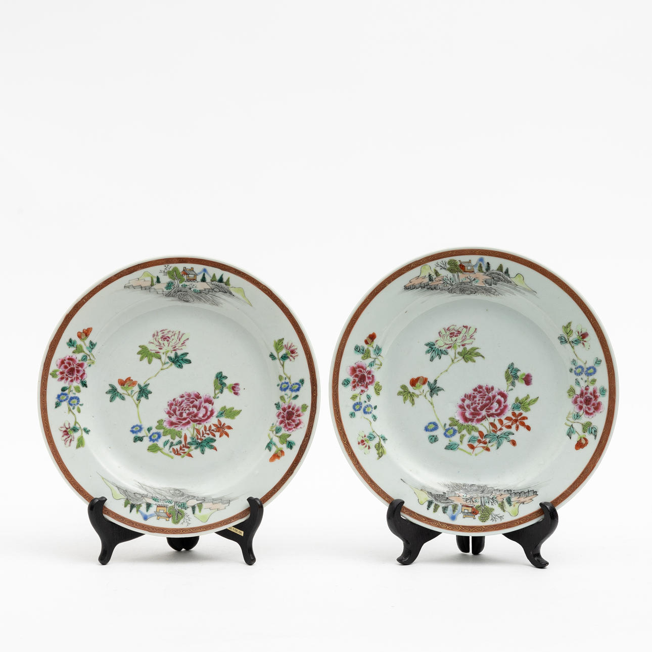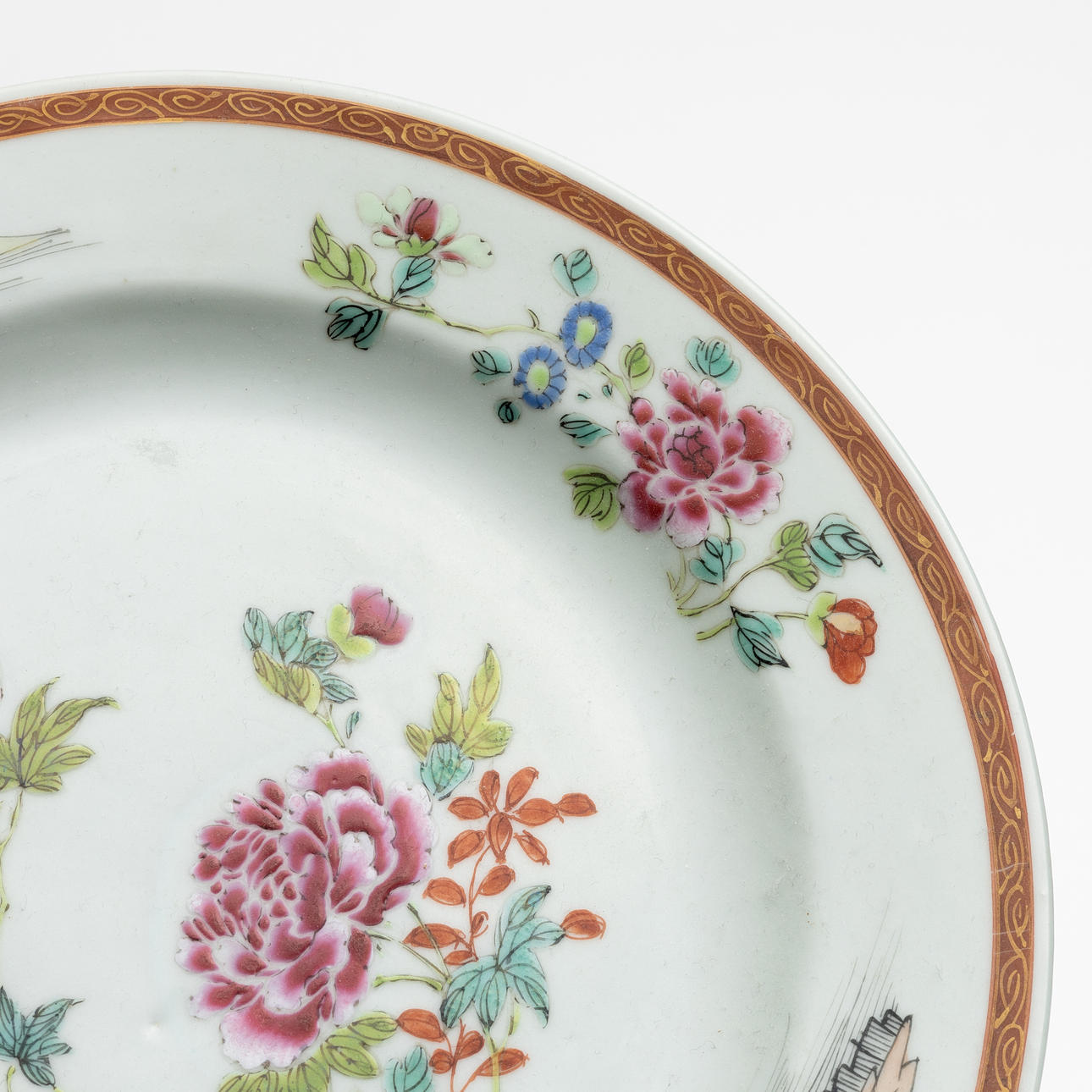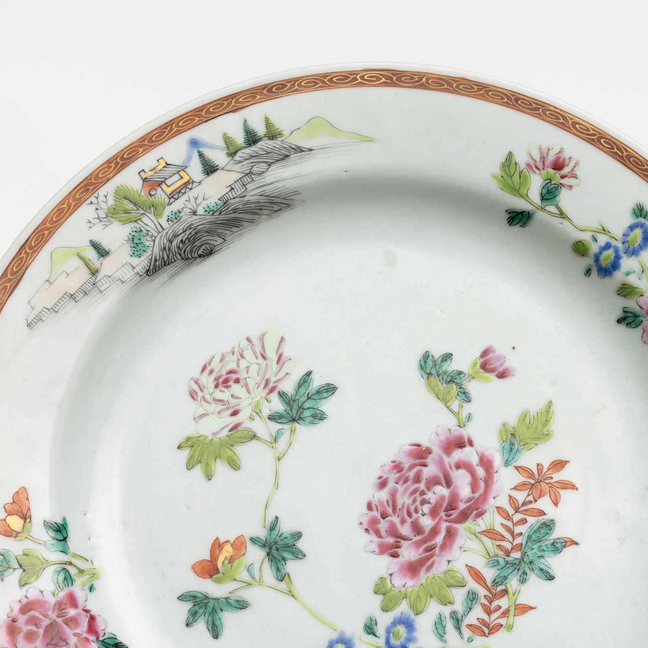 Decor in the famille rose palette with motifs of peonies, brim with landscapes and flowers. Diameter about 23 cm. Condition Age-related wear. 319539