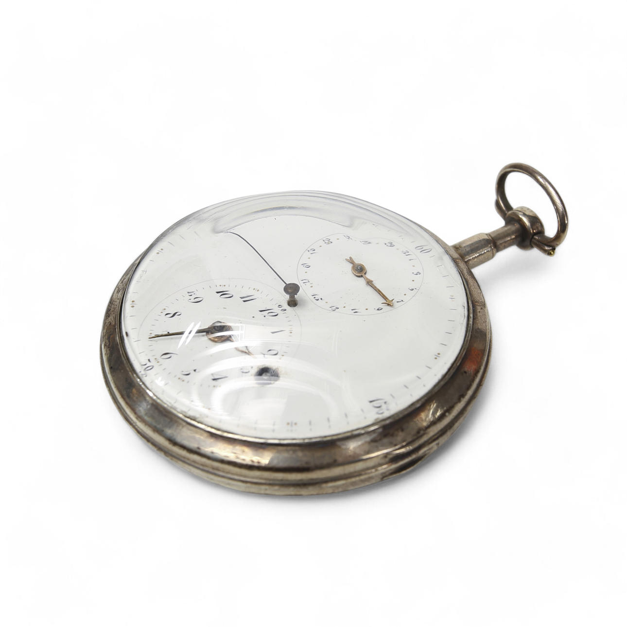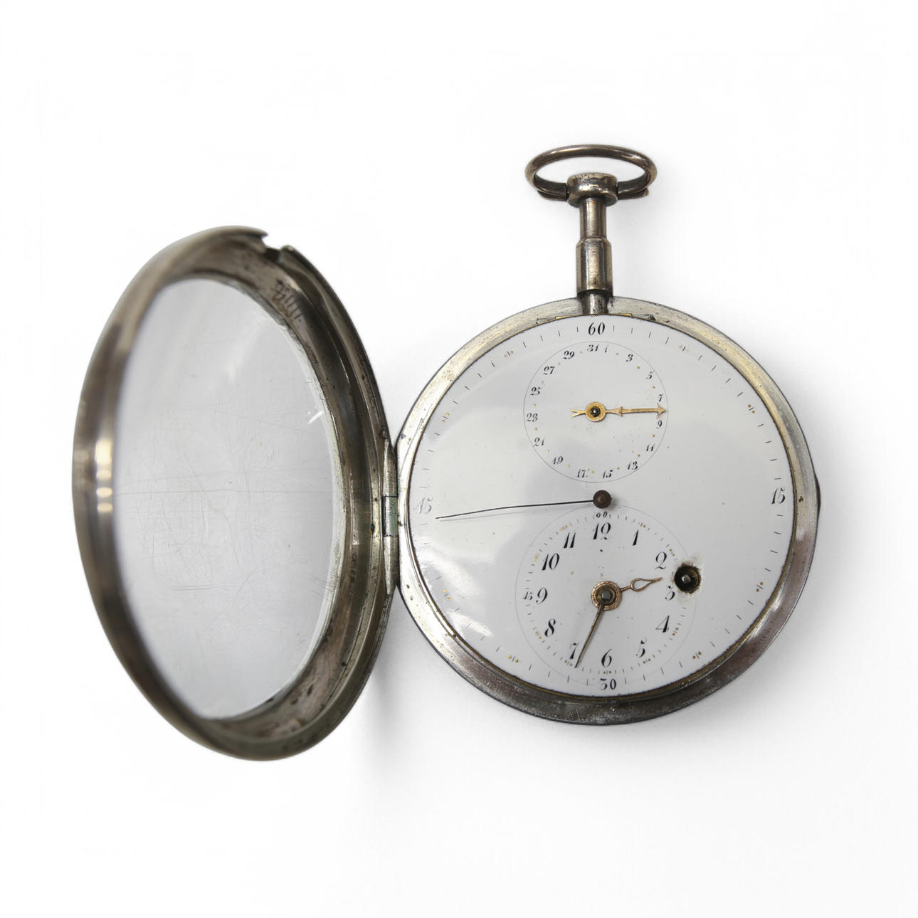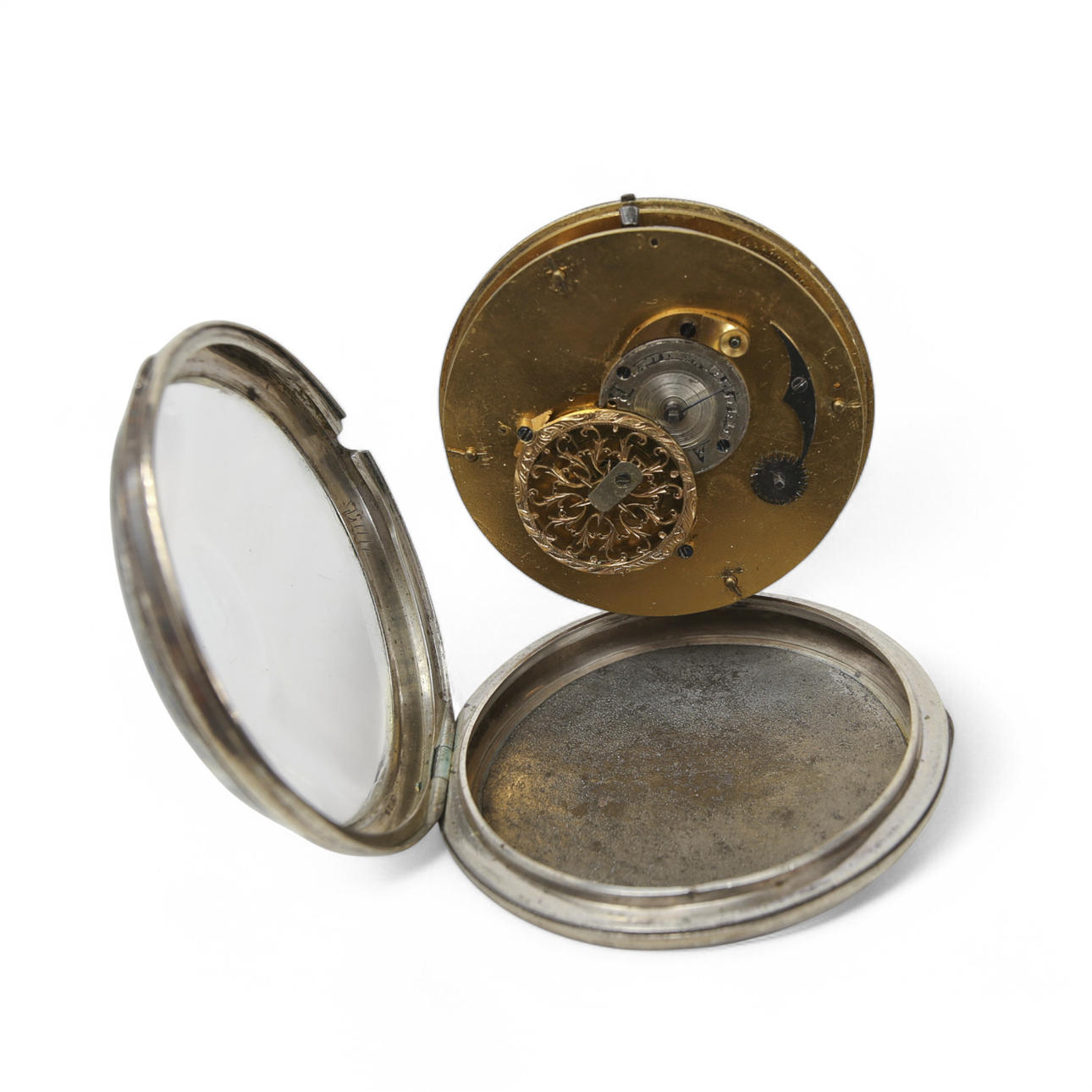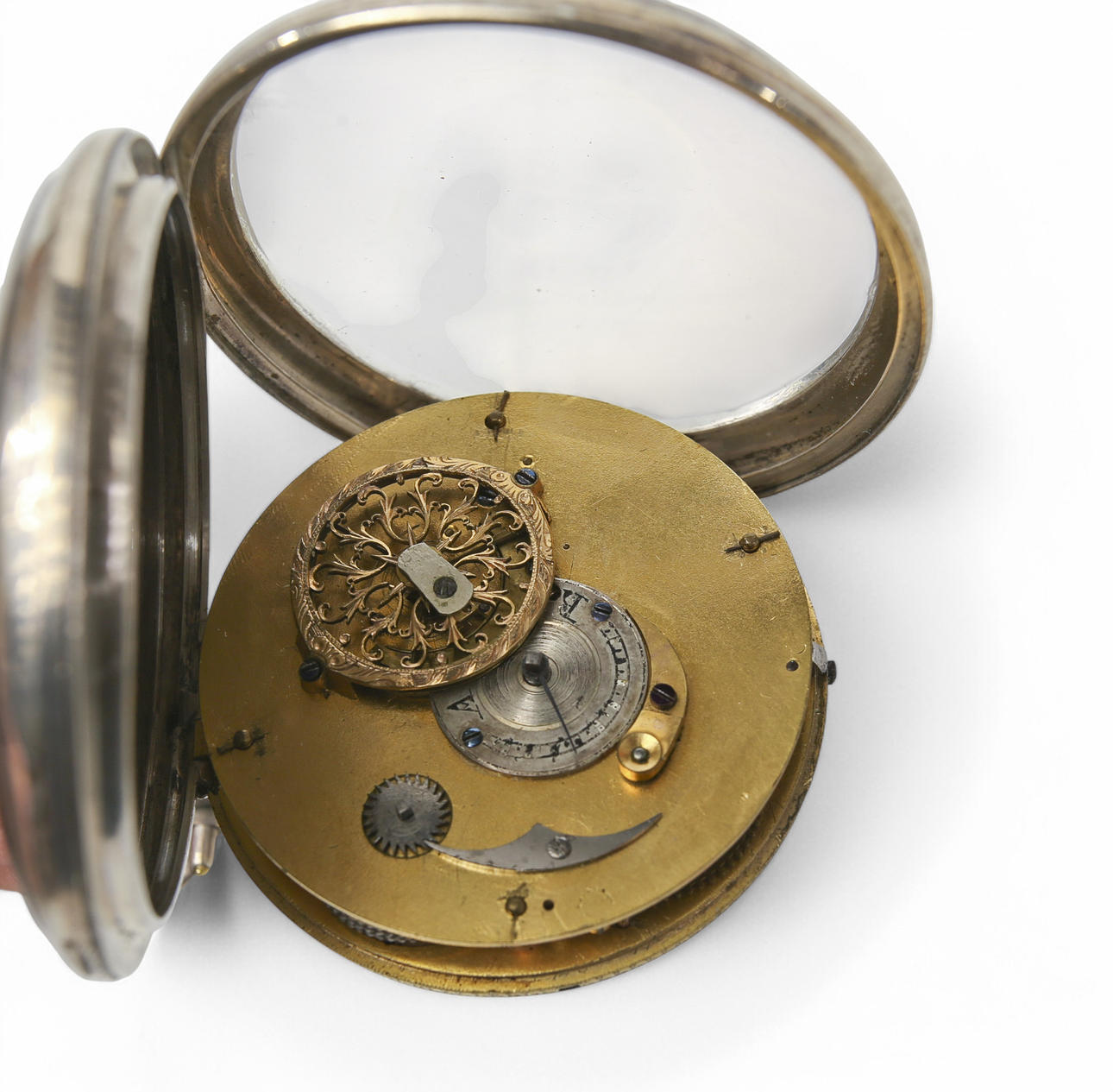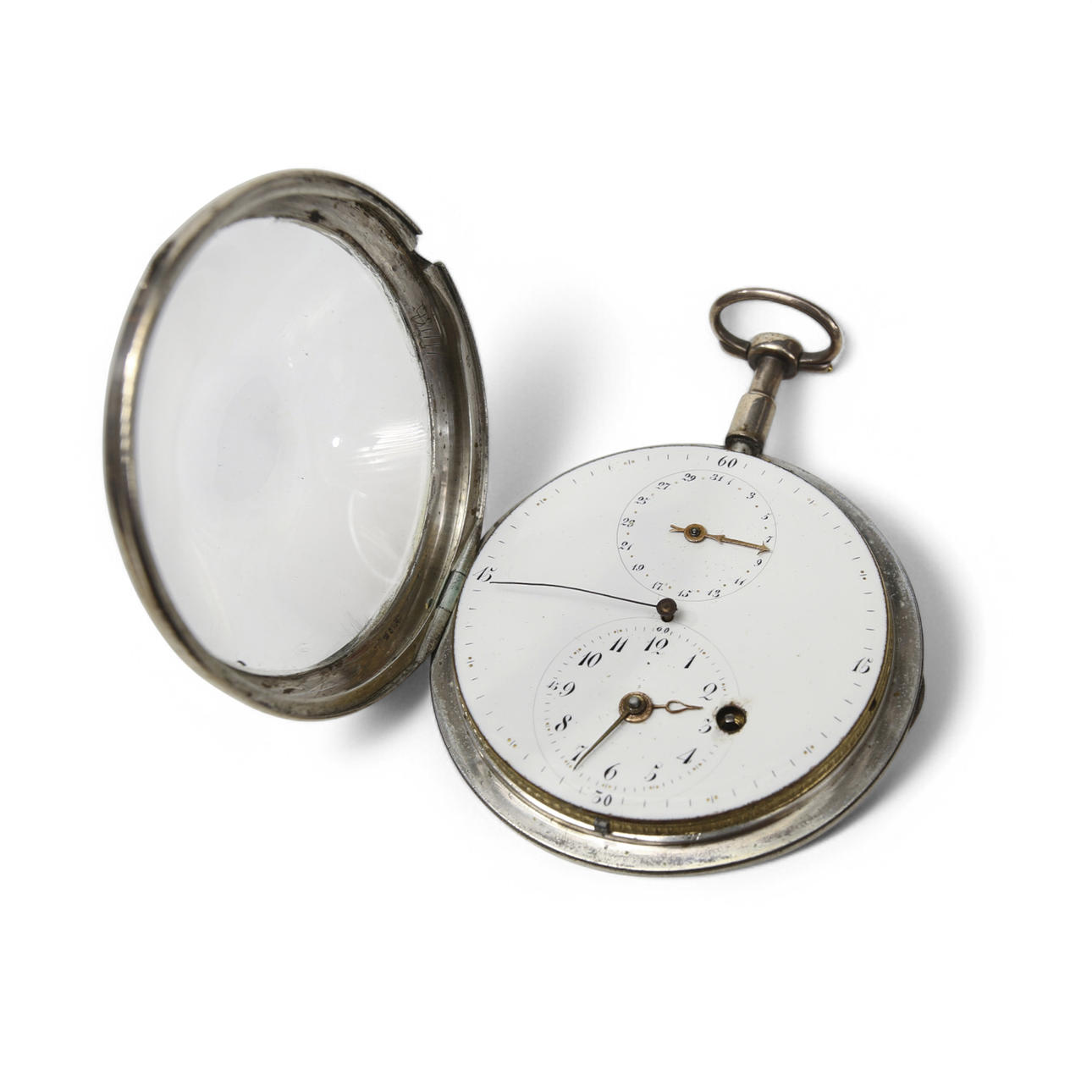 First quarter of the 19th century. Weight 116.5 grams. The dial shows hours, minutes, seconds and dates, gilded and blued dials. Diametro 61mm. Condition Usage and age-related wear. enamel damage at the mission hole in the dial - otherwise whole. Scratches. The shaft to the walking system is whole. No functional warranty is provided. 27396