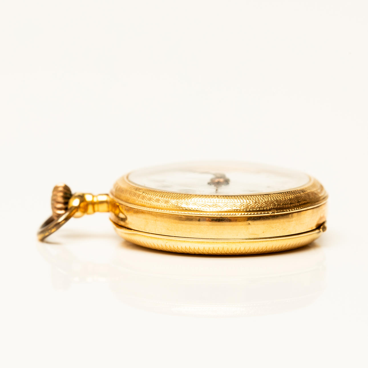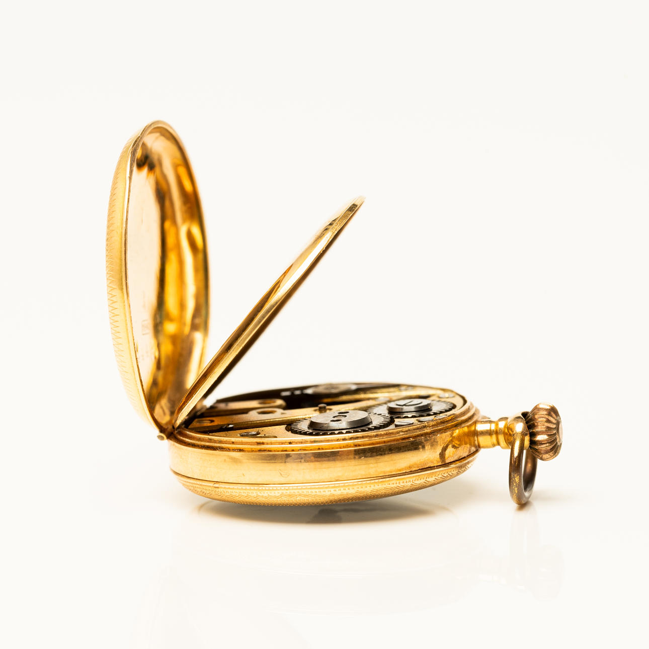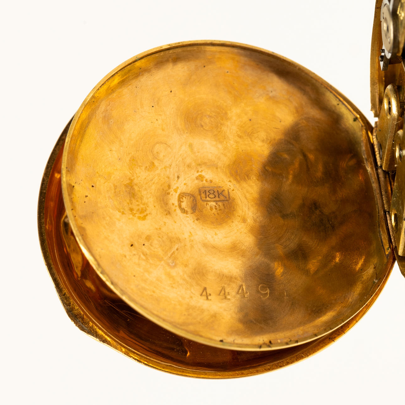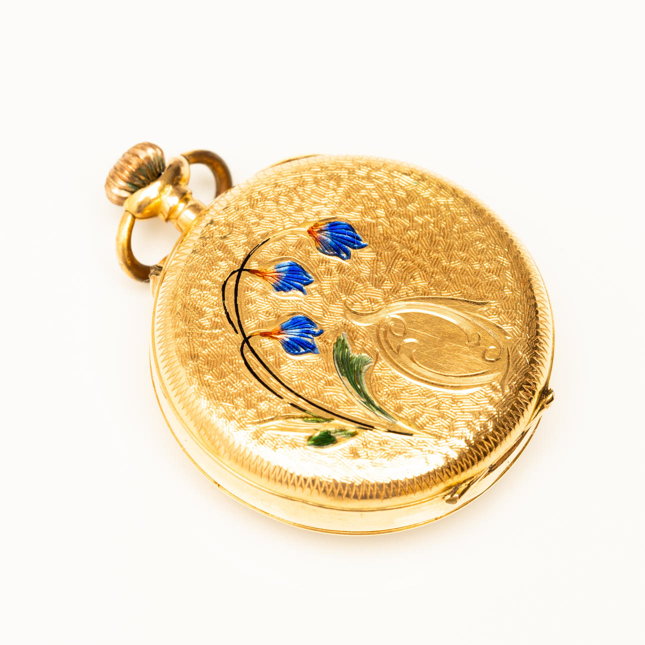 Manual, cylinder work, outer and inner case of 18K gold, enamelled decoration, early 20th century. Enameled decor of flowers. Diameter approx. 25 mm Weight about 12 grams. Condition Worked at the time of cataloging. No functional warranty is provided. Damage to enamel. Dents. 297704