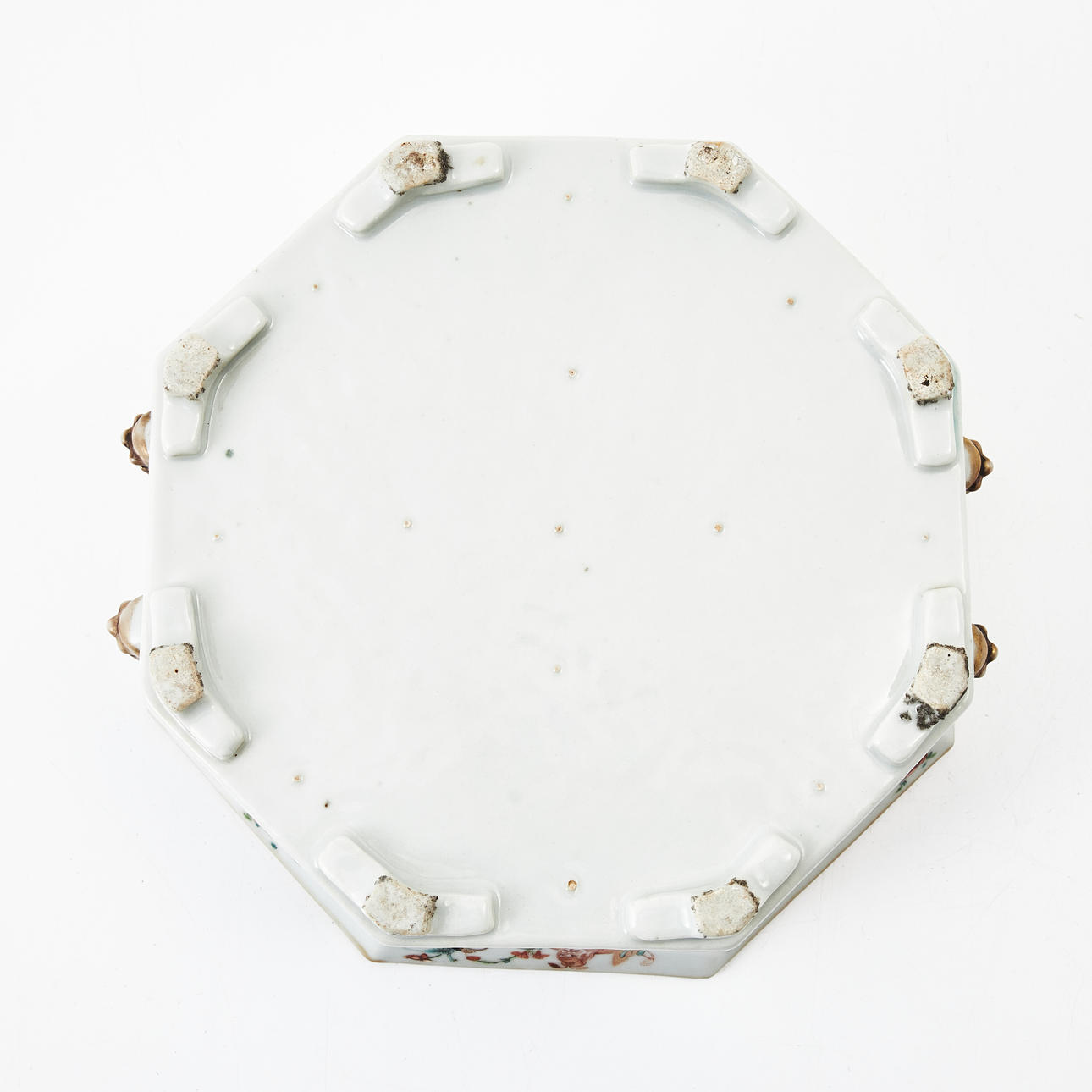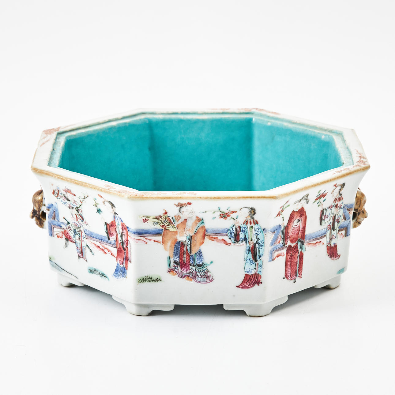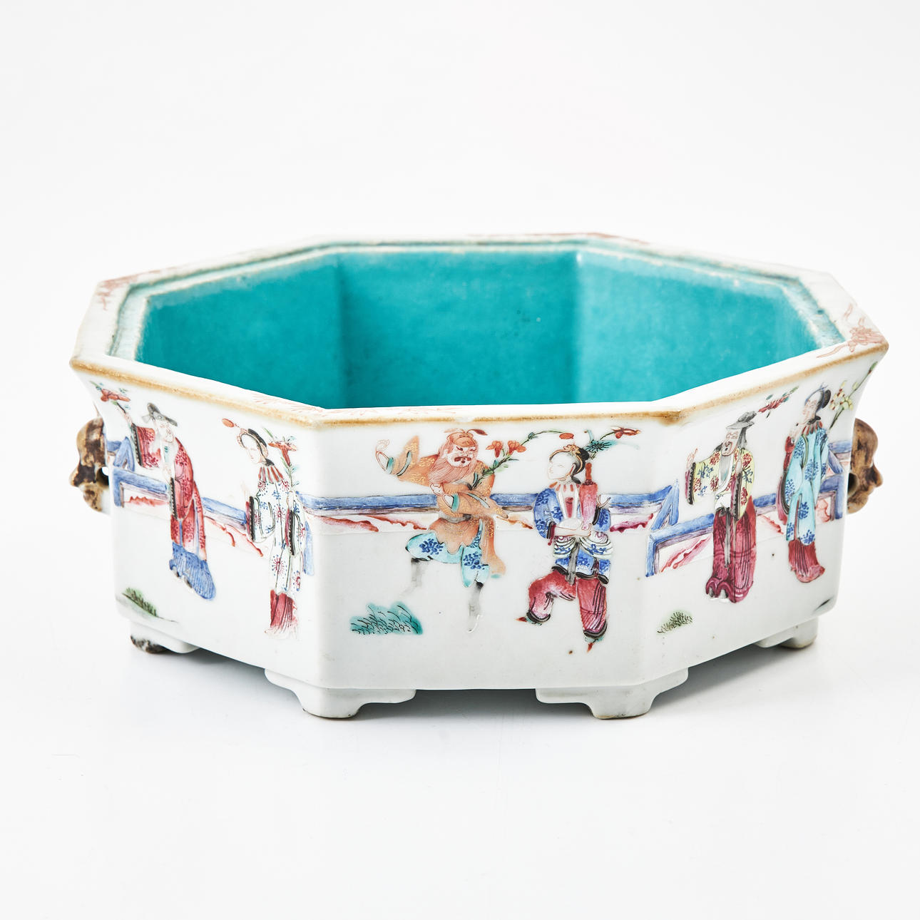 Octagonal shape, decoration of figures on garden terrace in enamel colors, iron oxide, sepia and gold, inside with turquoise glaze. Diameter ca 22, height 9 cm. Condition Originally with a cover. Wear, chips. 263412