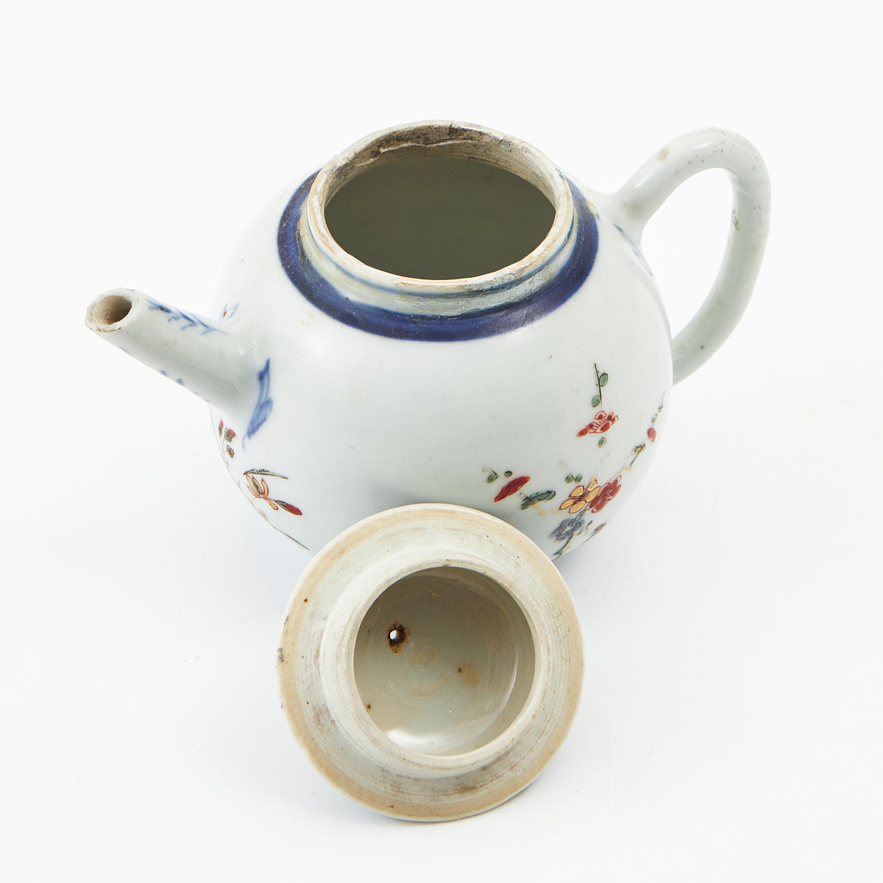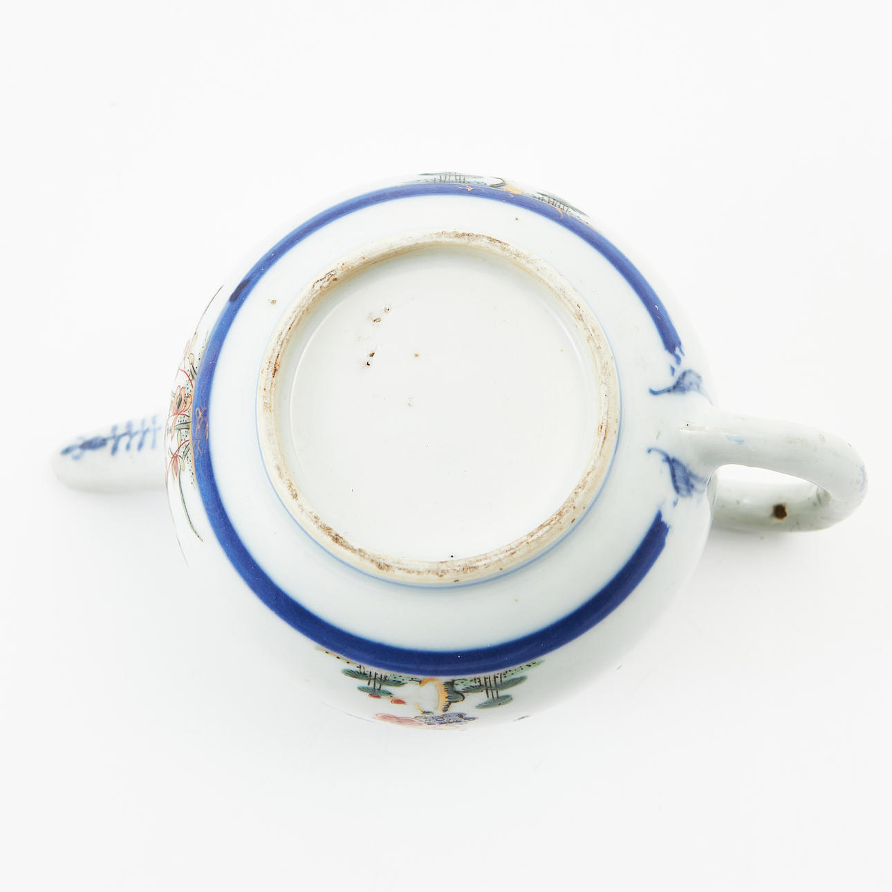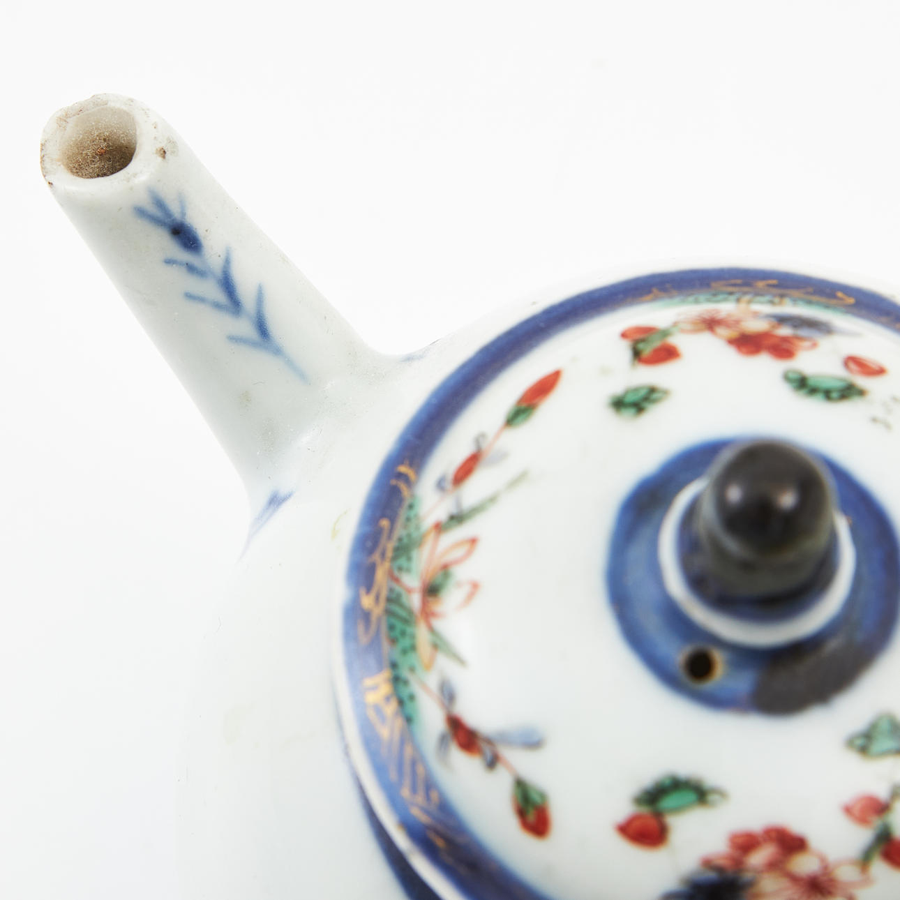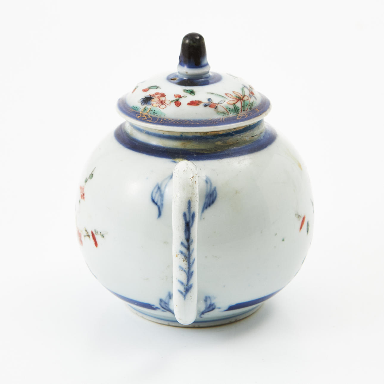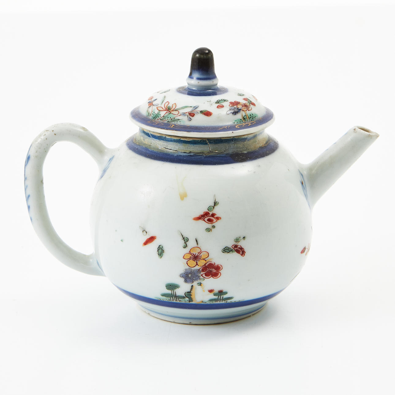 Globular, decoration of prunus and blue border in enamel colors, iron oxide and gold. Height approx. 12 cm. Condition Repairs, chips. 214108