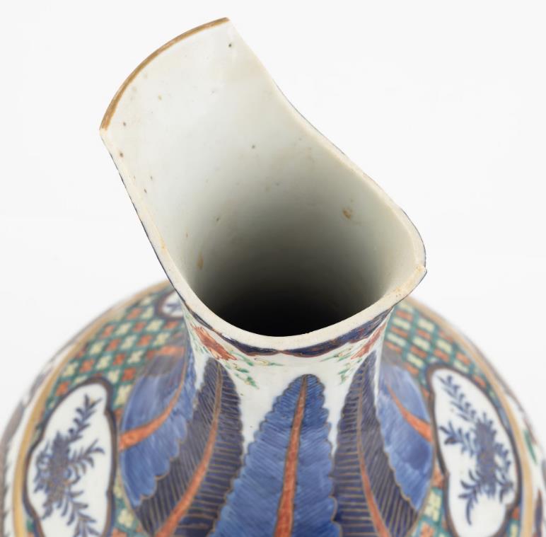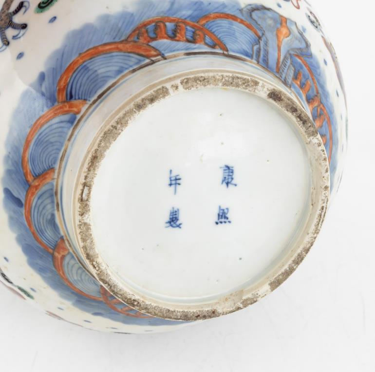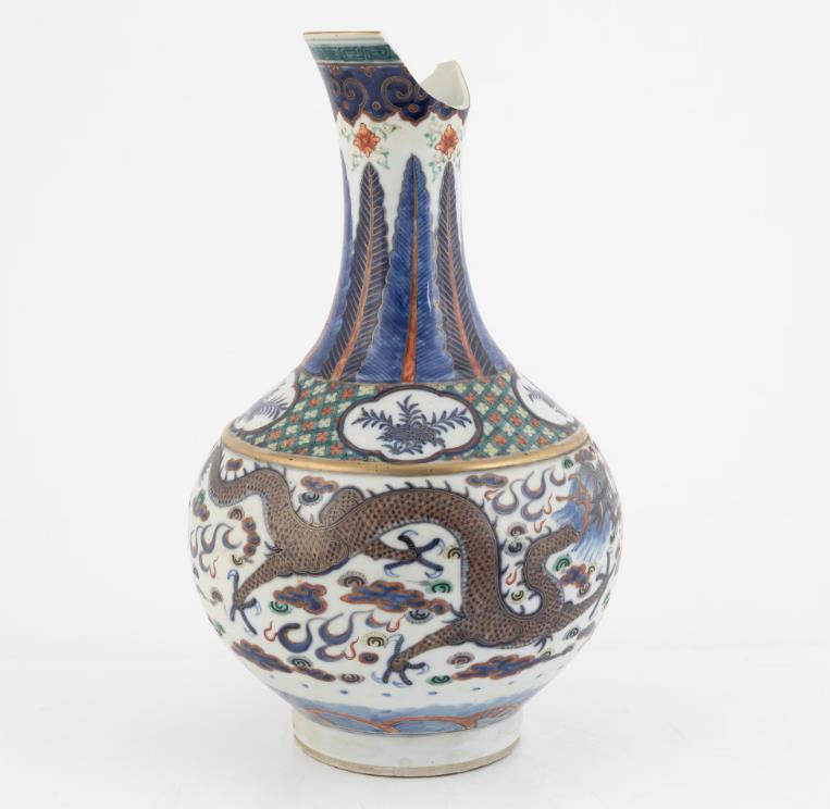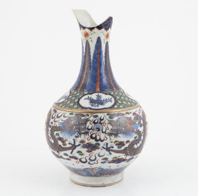 Decorated in underglaze blue and enamel colours with a motif of two four-clawed dragons chasing the flaming pearl among cloud formations. The neck is decorated with banana leaves. Marked with the Kangxi mark in underglaze blue, but of later manufacture. Height 28 cm. Cracks. Damages. Glaze spots. Chips to footrim.