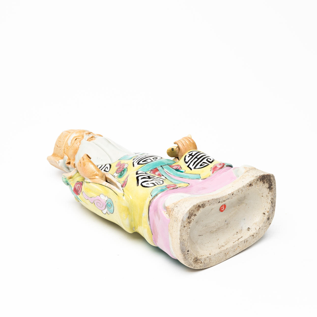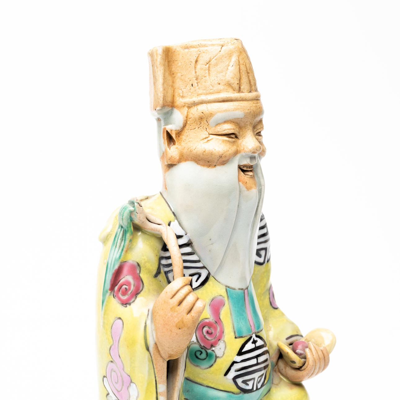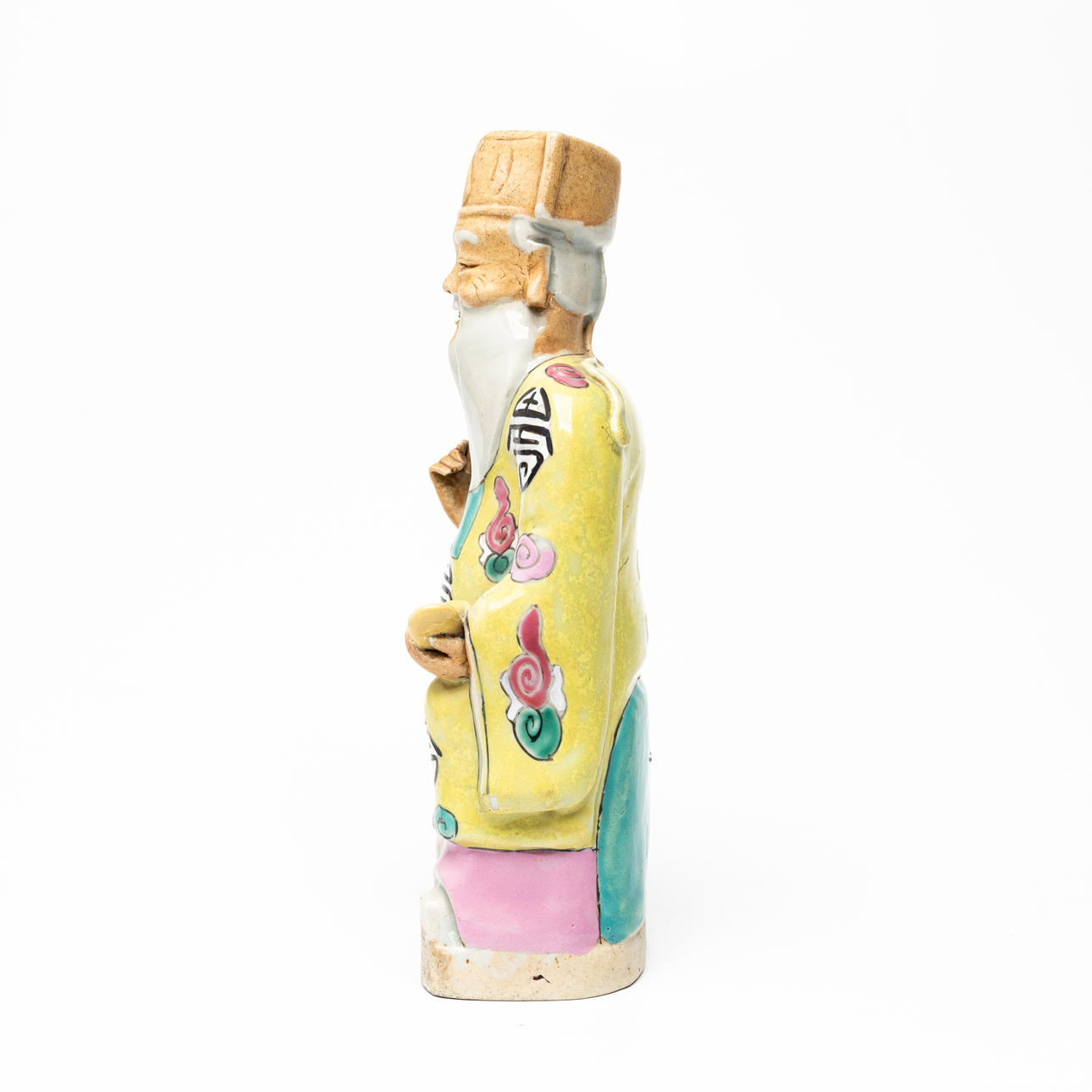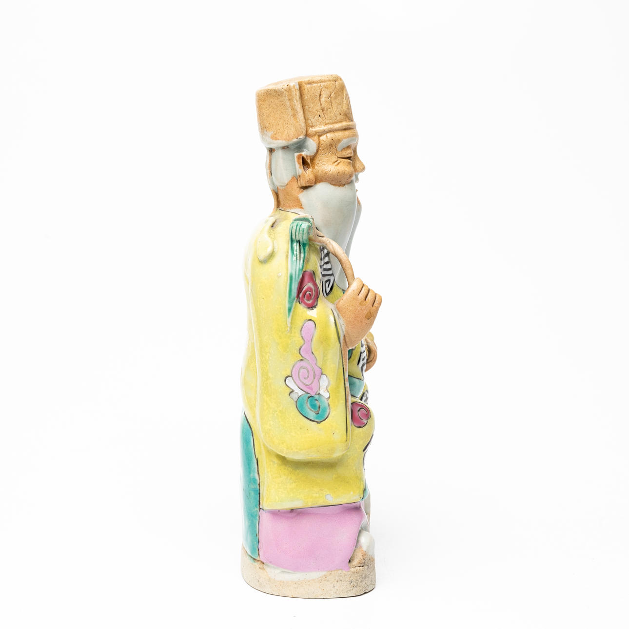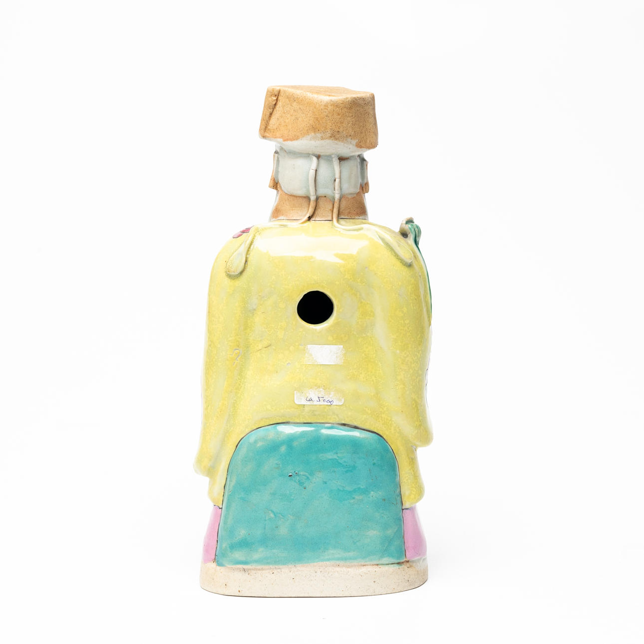 19th century China. Man with official costume, glazed in yellow with details in pink and green, height 21 cm. Condition Wear and tear. Minor manufacturing defects.