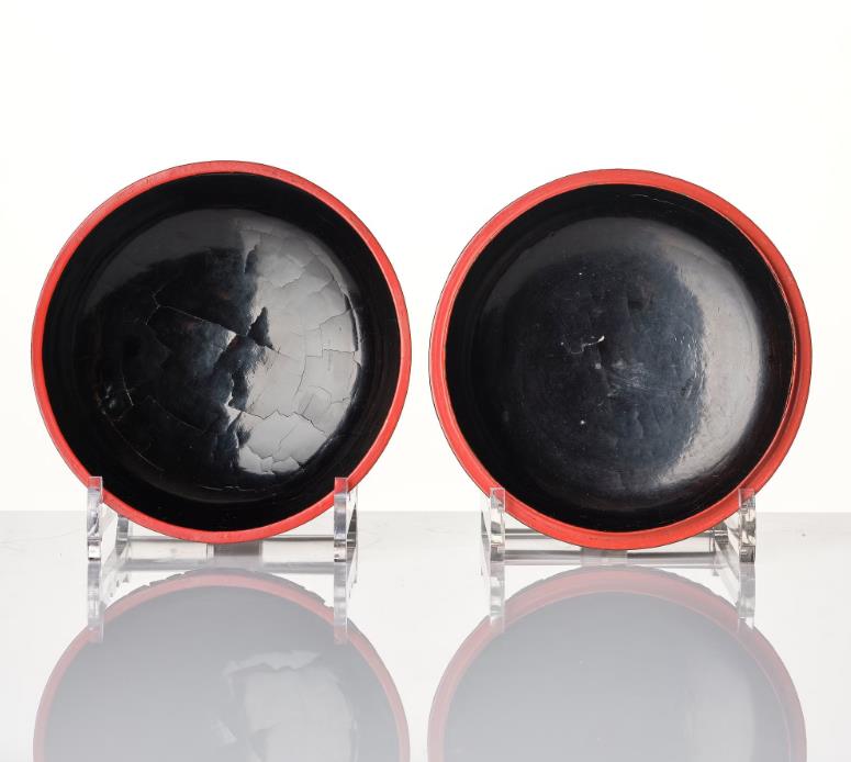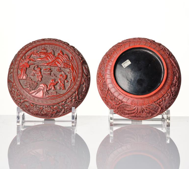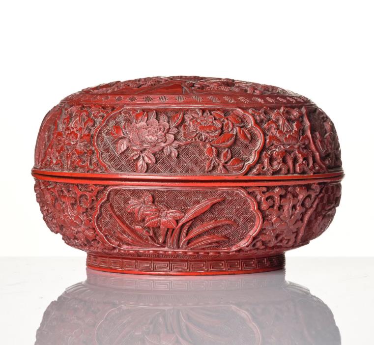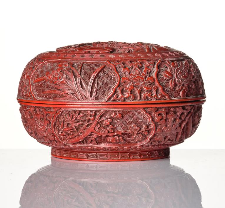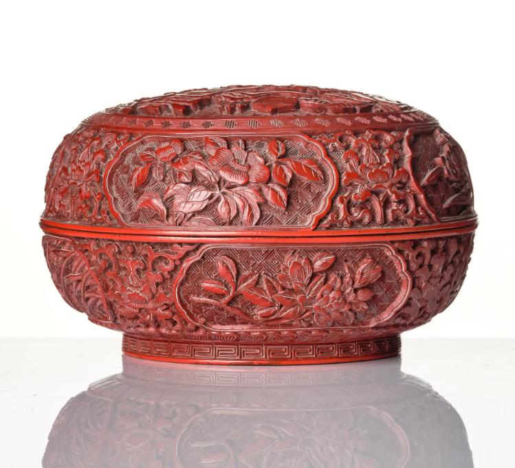 Rounded sides, the top panel decorated in deep relief with boys playing in a garden by a river. The sides with panels decorated with peonies, magnolia, cherry blossom and narcissus. Diameter 15.8 cm. Cracks to the interior.