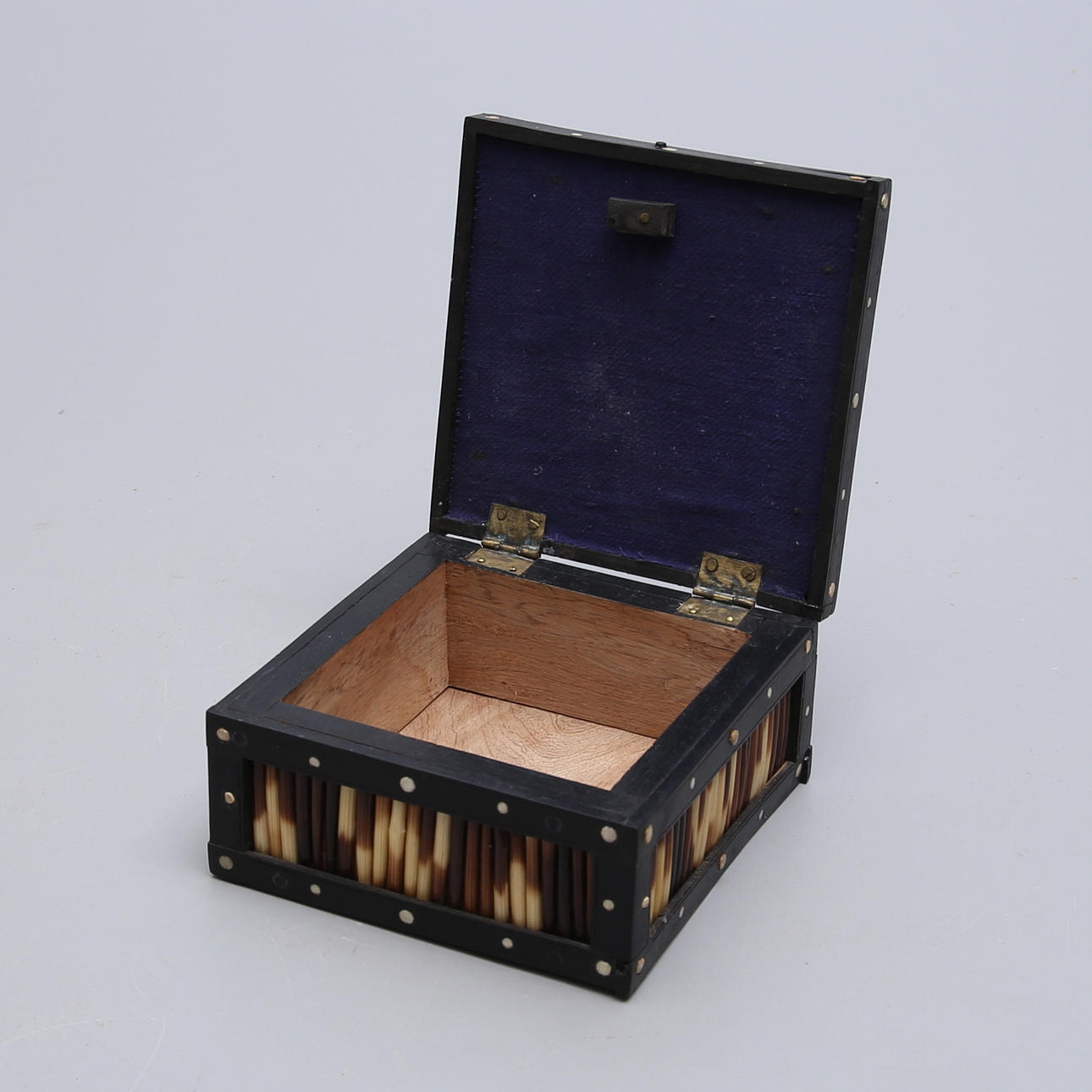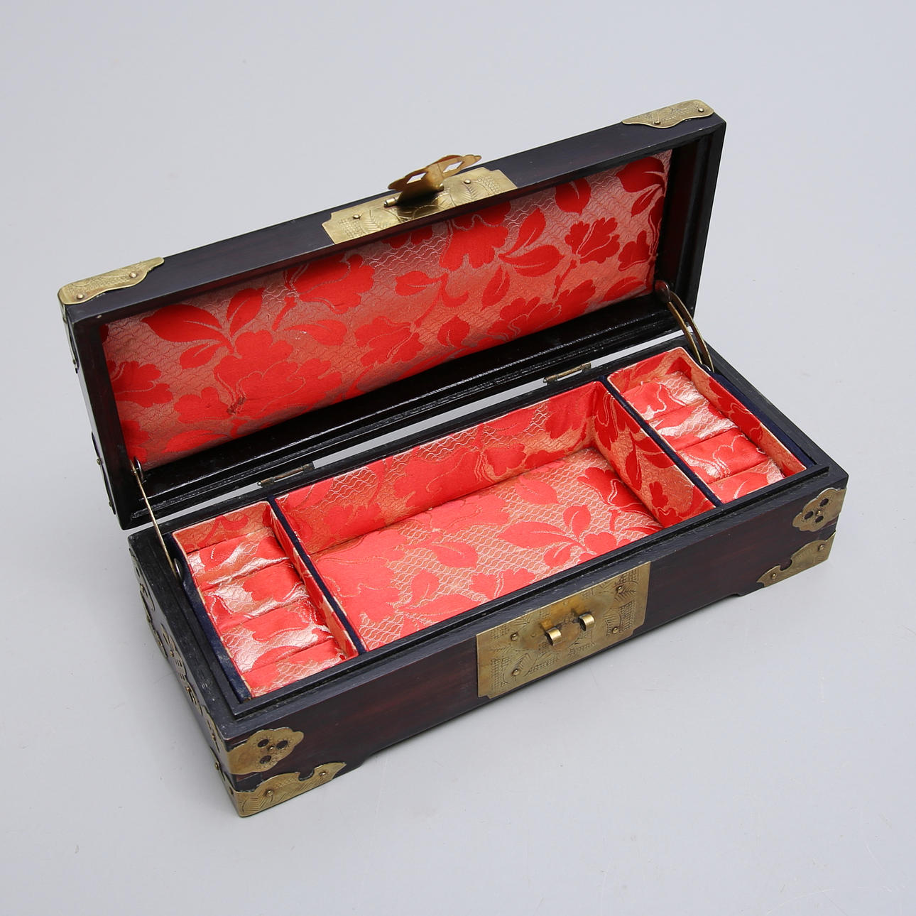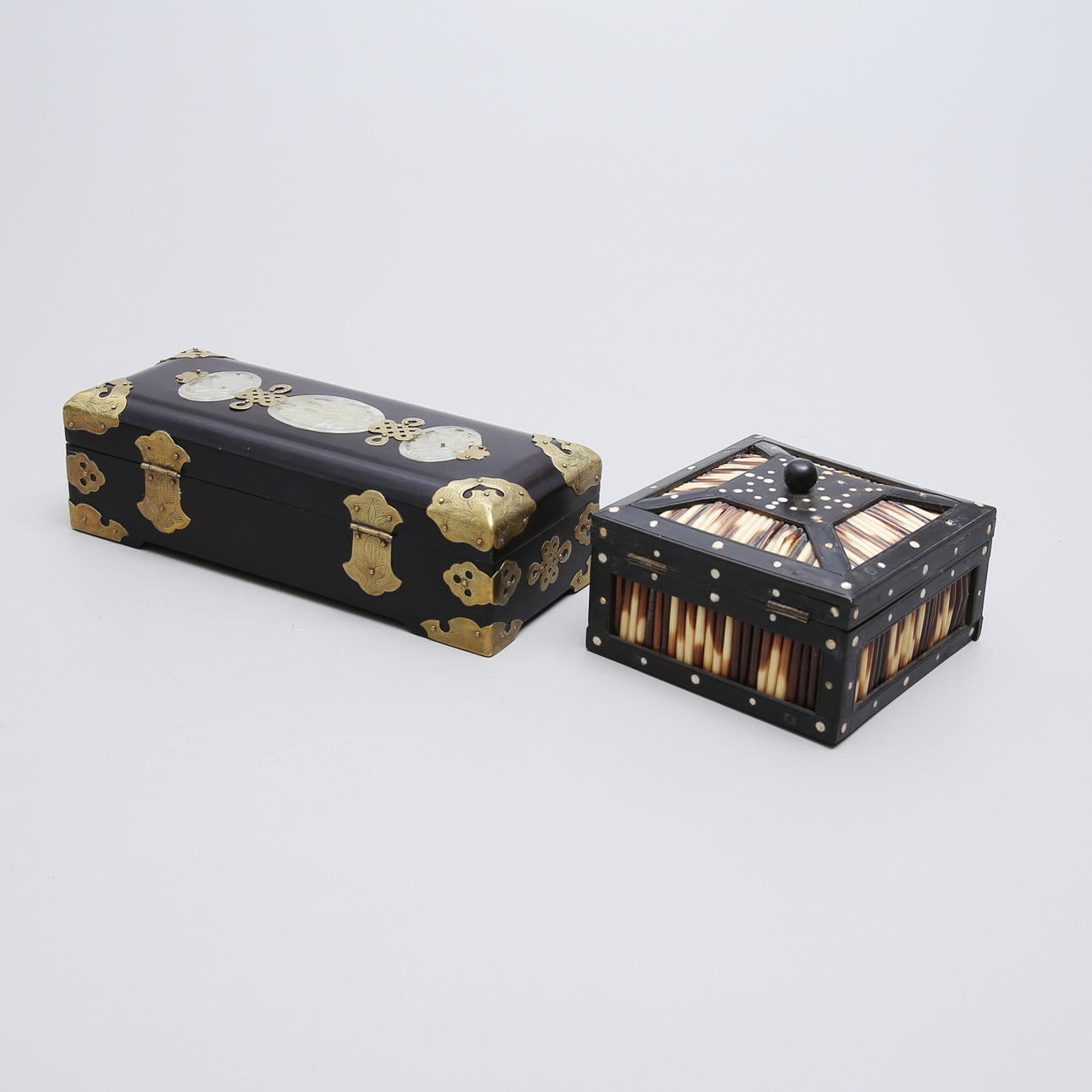 Jewelry box wood/yellow metal, China 25x10x7.5 cm Box wood/turbot sticks, 13,5x13,5x9 cm. Condition Minor wear. 114516