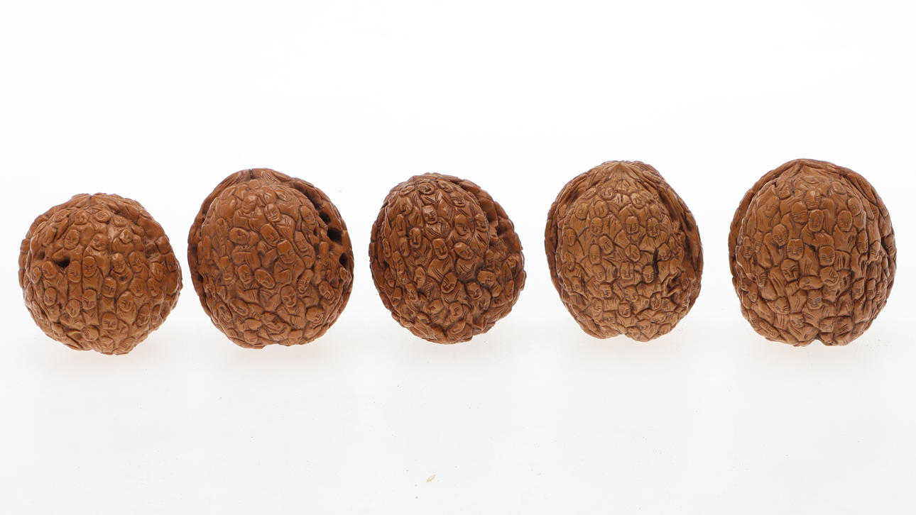 A set of 5 carved walnut shells, China.