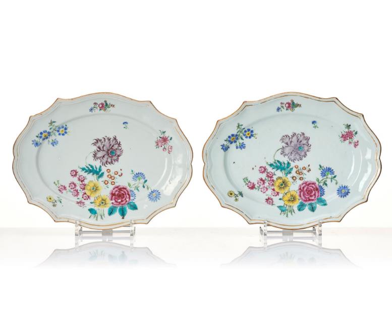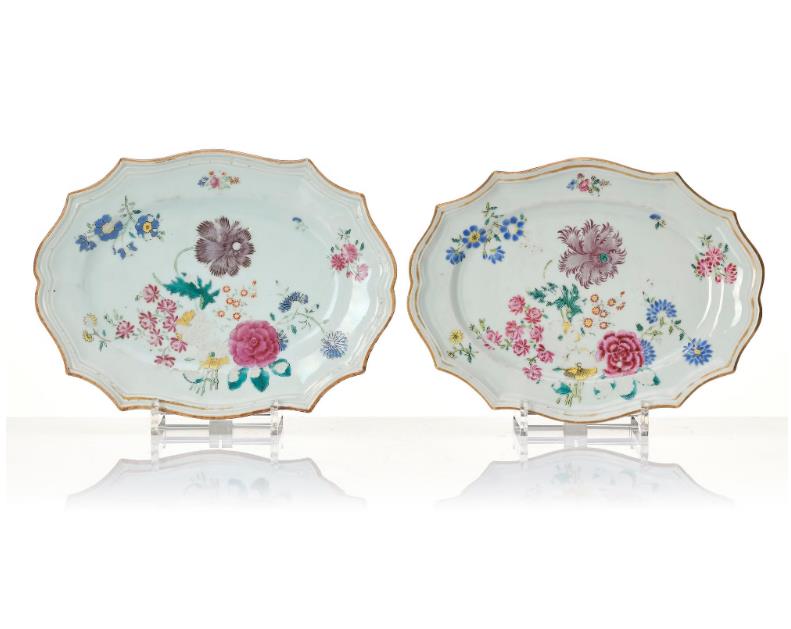 Lobed after a European silver model, decorated in vibrant famille rose colours with flowers. Lenght 30-44 cm. Firing flaws, wear