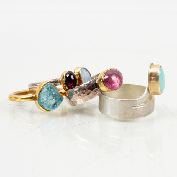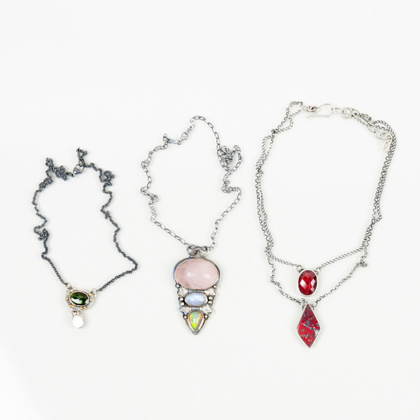 8 hängen med fast/lösa halskedjor, olikslipade ädelstenar, hängenas längd ca 35 - 65 mm, kedjor i olika längder, 1 armband med reglerbar längd Olikslipade ädelstenar, ringstorlek 17/53 - 17,25/54 Hängen med fasta kedjor, varav ett i två rader, olika längder, hängenas längd ca 20 - 60 mm