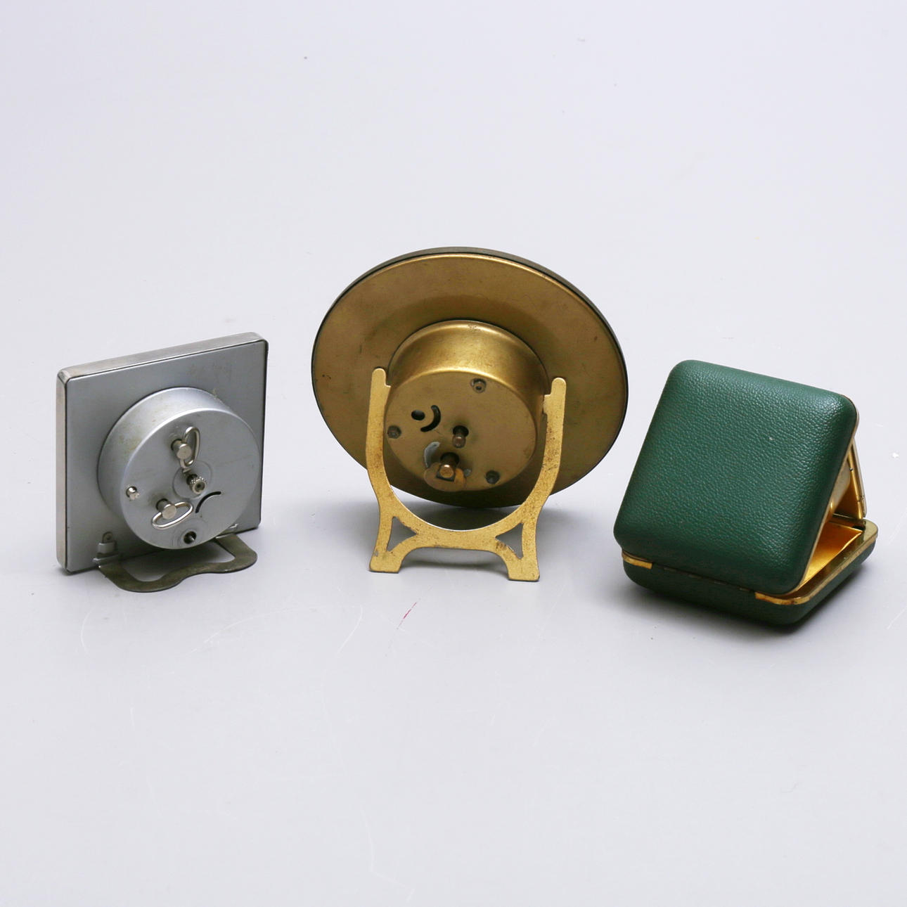 Table clock, motif with windmill, rotating wings, early 20th century, diameter12 cm. Travel watch with alarm, Goldbühl, second half of the 20th century, height 8 cm. Travel watch with alarm, Europe, second half of the 20th century, height folded 8 cm. Condition Minor stains and marks. Worked at the time of cataloging. No functional warranty is provided. 114588