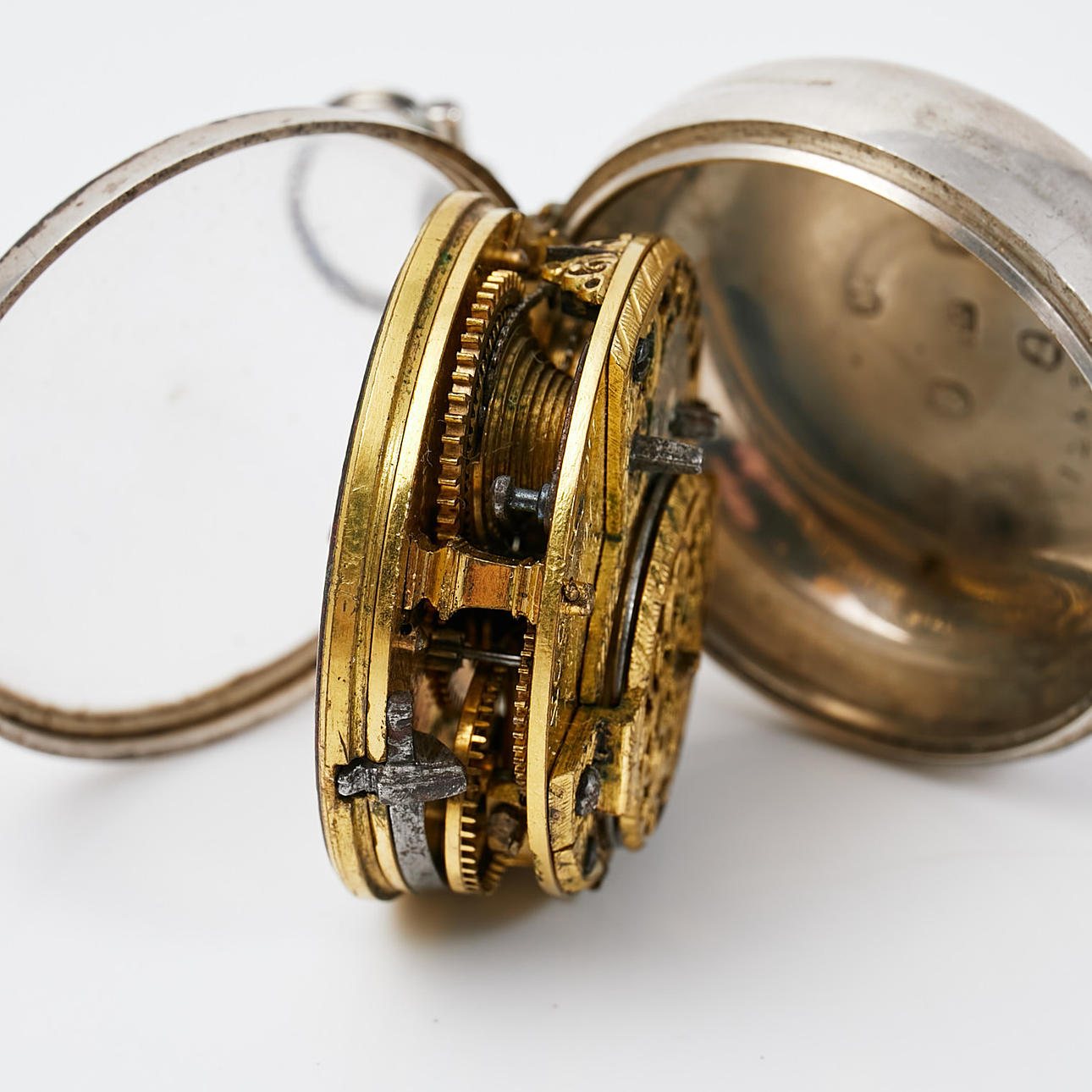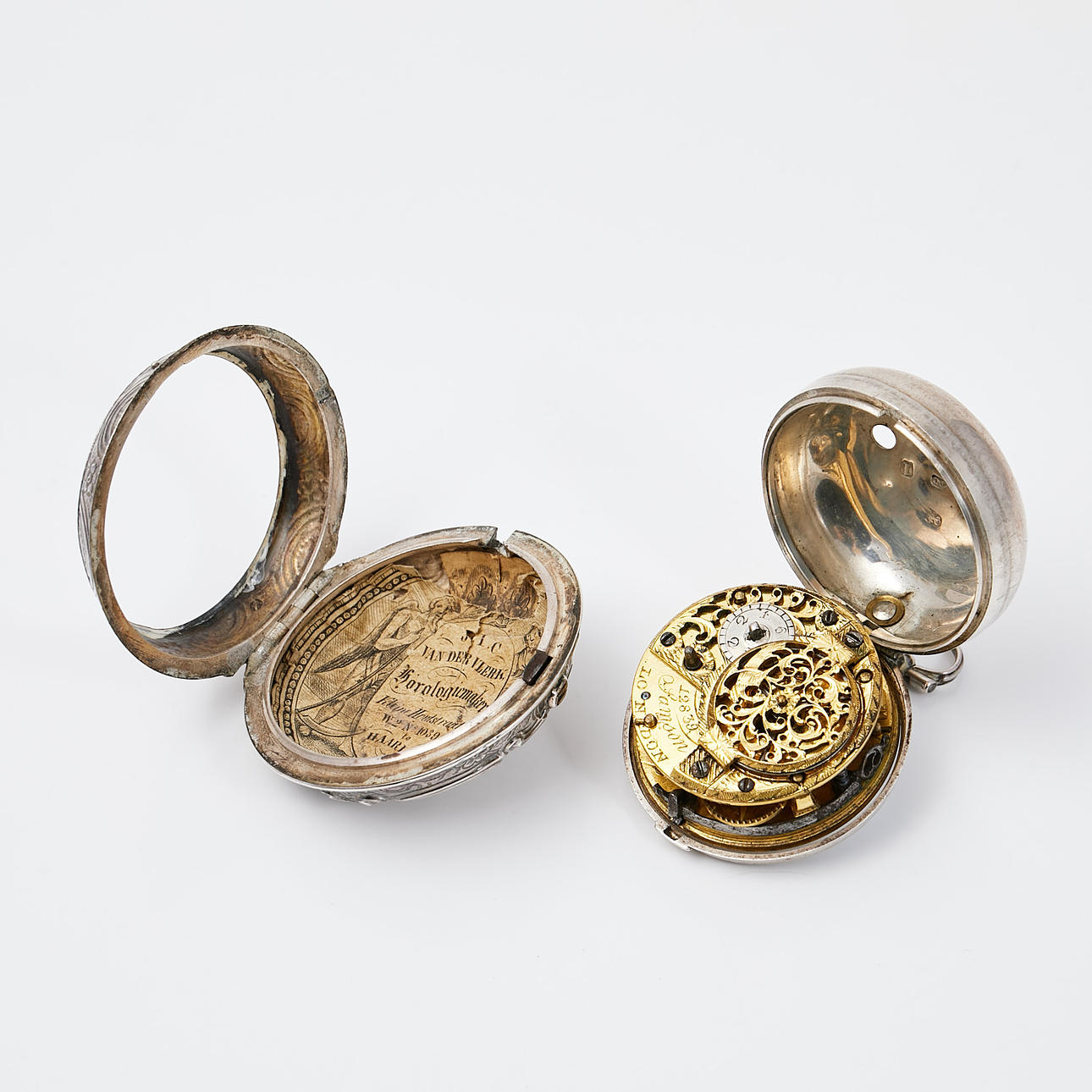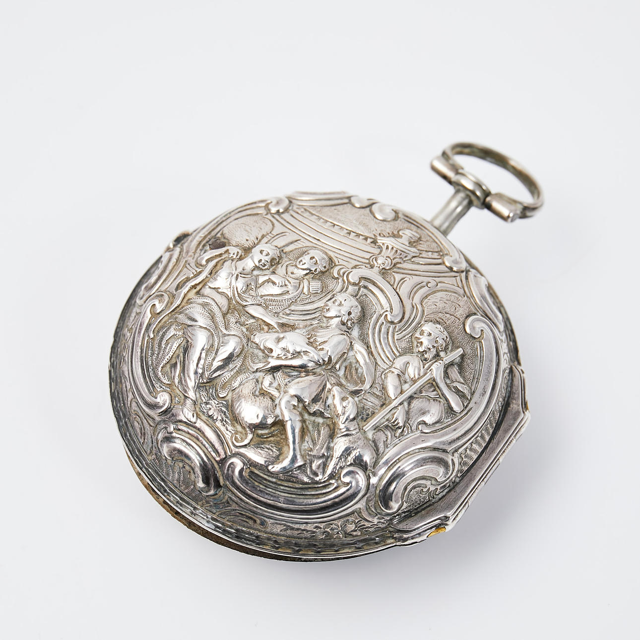 Enamelled dial with Roman and Arabic numerals and hand-painted decoration. Diameter approx. 53 mm. Double cases in silver, the outer with rich driven decor of figure scene. Silver stamped Thomas Chawner, London, 1786. The work is signed and numbered “12838 Samson LONDON”. Case number: 12839. Condition Wear and age related wear, marks, does not work at the time of cataloging, no functional warranty is provided.