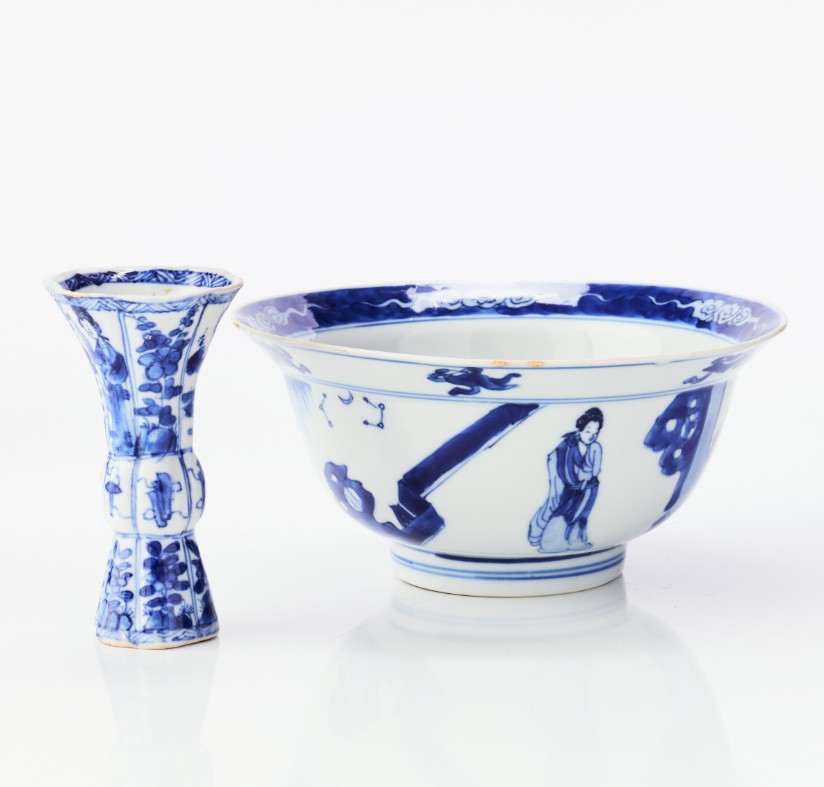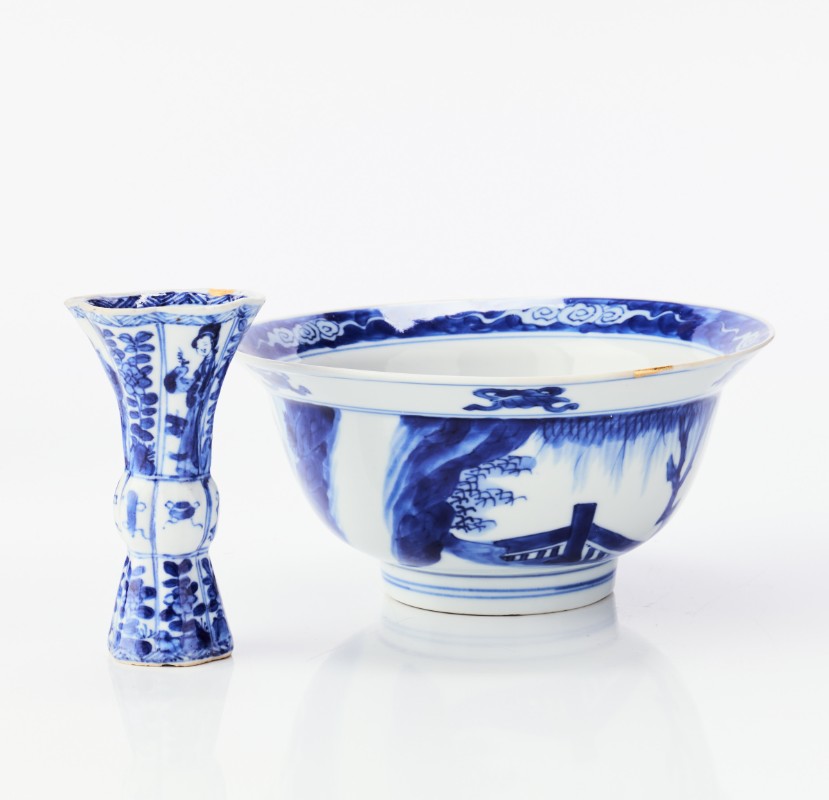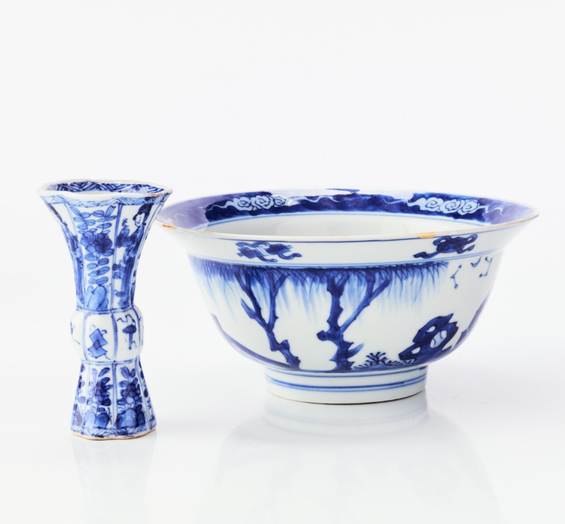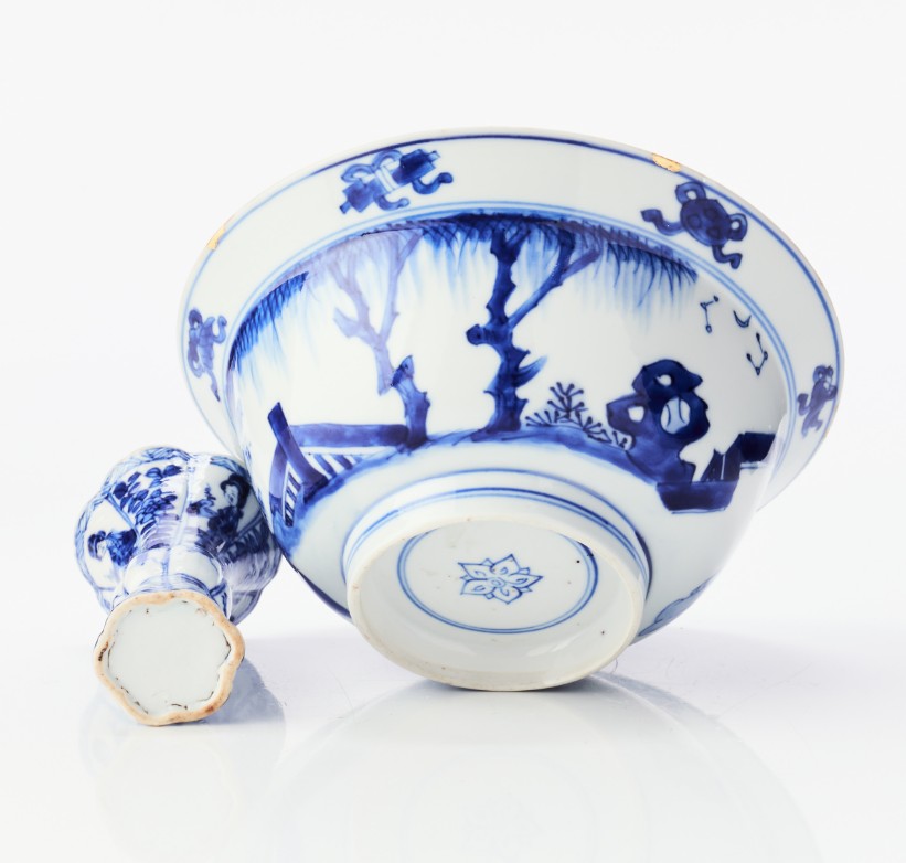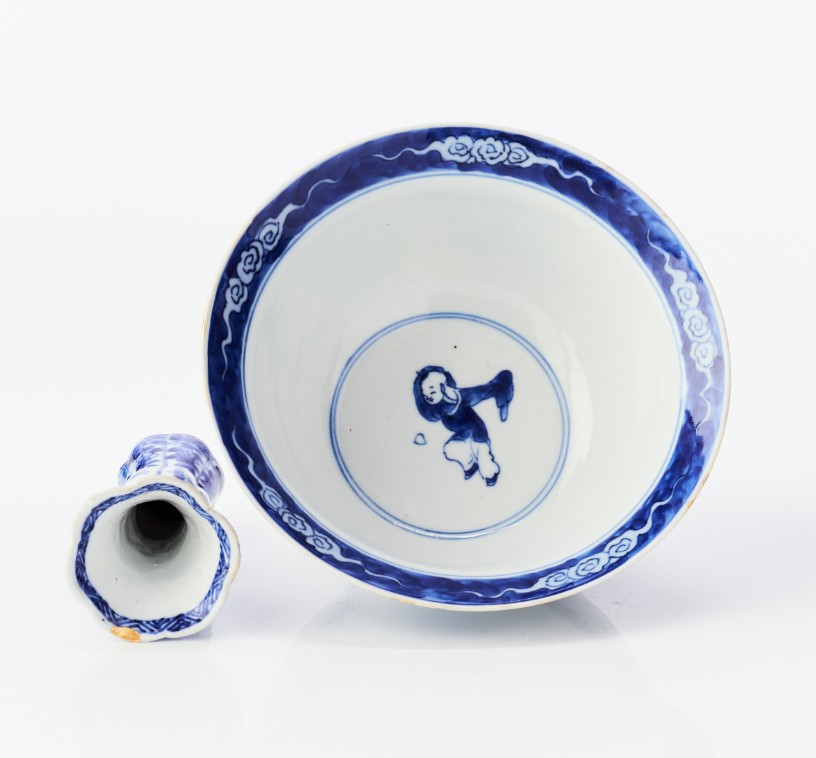 A Small Chinese Blue and White Porcelain Vase and a Bowl The base of the bowl with a single prunus bloom within a double circle. Period: Kangxi (1662-1722). Diameter of the bowl: 15.5 cm, height of the vase: 9.3 cm. Konditionsrapport Rim repairs. Chips. Cracks.