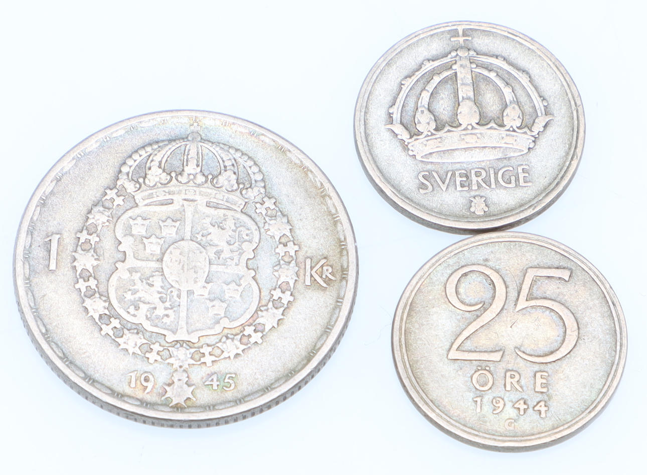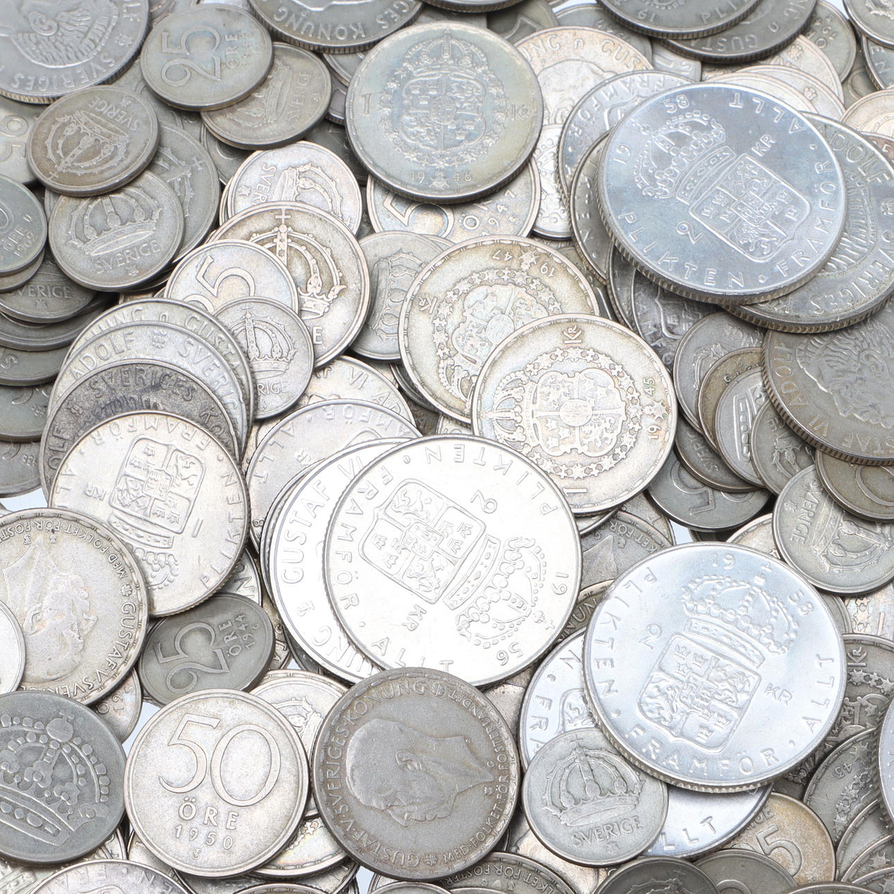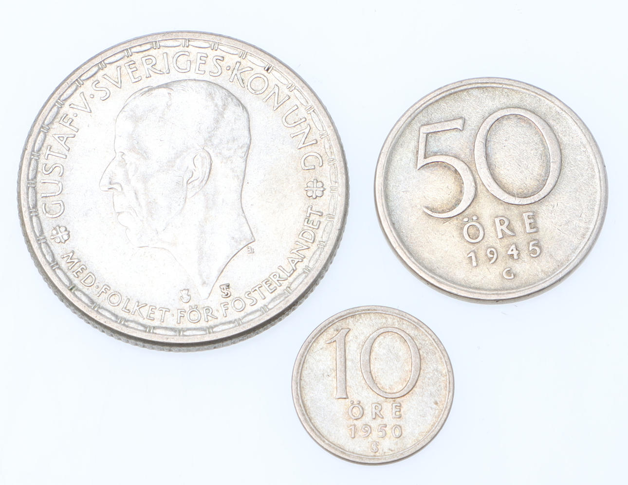 2 kr, 5 pcs. 1945-50, Silver 0.400, weight: 14 g/pc. 2 kr, 23 pcs. 1952—61. Silver 0.400, weight: 14 g/pc. 1 kr, 127 pcs. 1942-68, Silver 0.400, weight: 7 g/pc. 50 öre, 63 pcs. 1943-61, Silver 0.400, weight: 4,8 g/pc. 25 öre, 104 pcs. 1943-61, Silver 0.400, weight: 2.3 g/pc. 10 penny, 114 pcs. 1943-60, Silver 0.400, weight: 1.44 g/pc. Condition Surface dirt, abrasions, condition of use. 165302