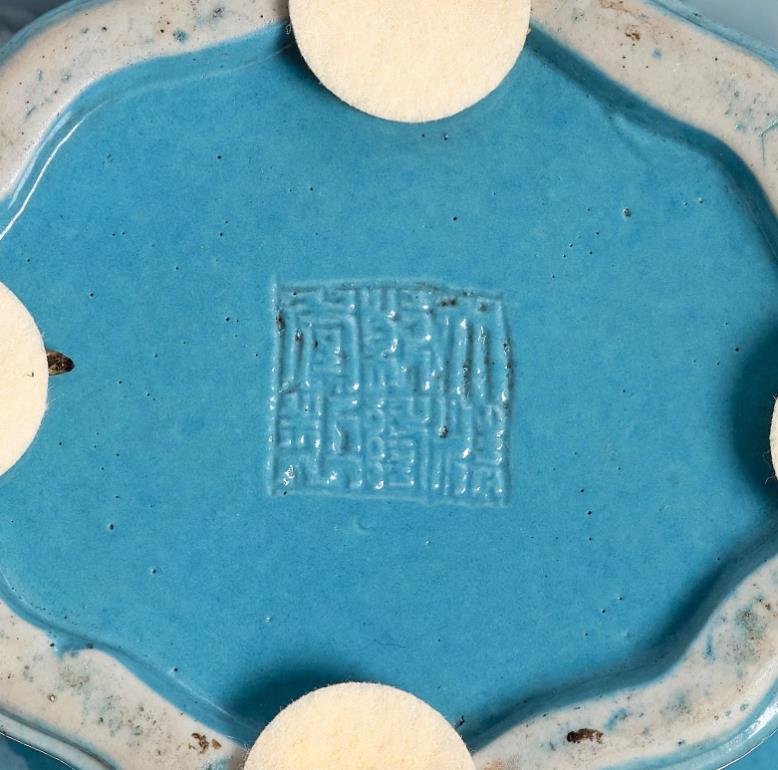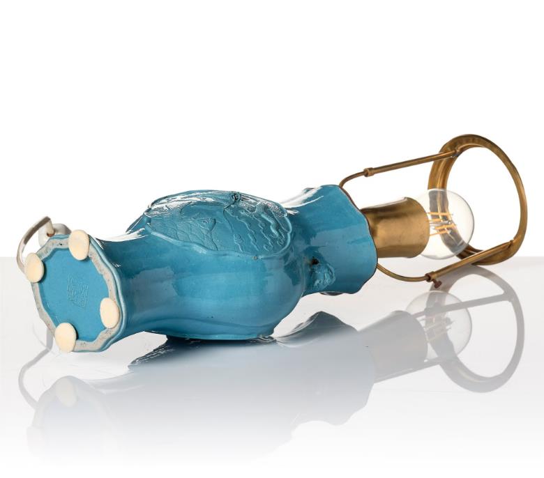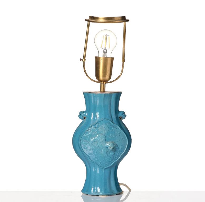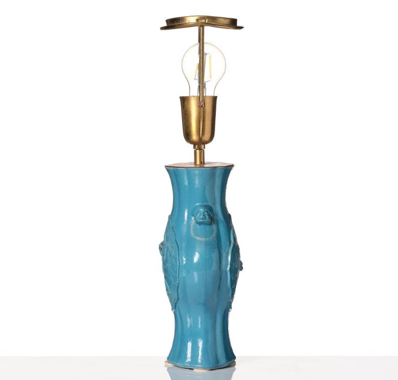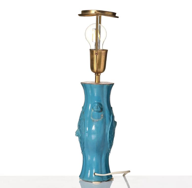 After a bronze shape, central panel decorated in relief with a four clawed dragon amidst cloud formatios above a turbulent sea of waves and a leaping carpfish. Handels in the shape of mythical creatures. Height vase 27 cm. Height with mount as a lamp 48 cm. Polished by rim. Has had ringhandles.