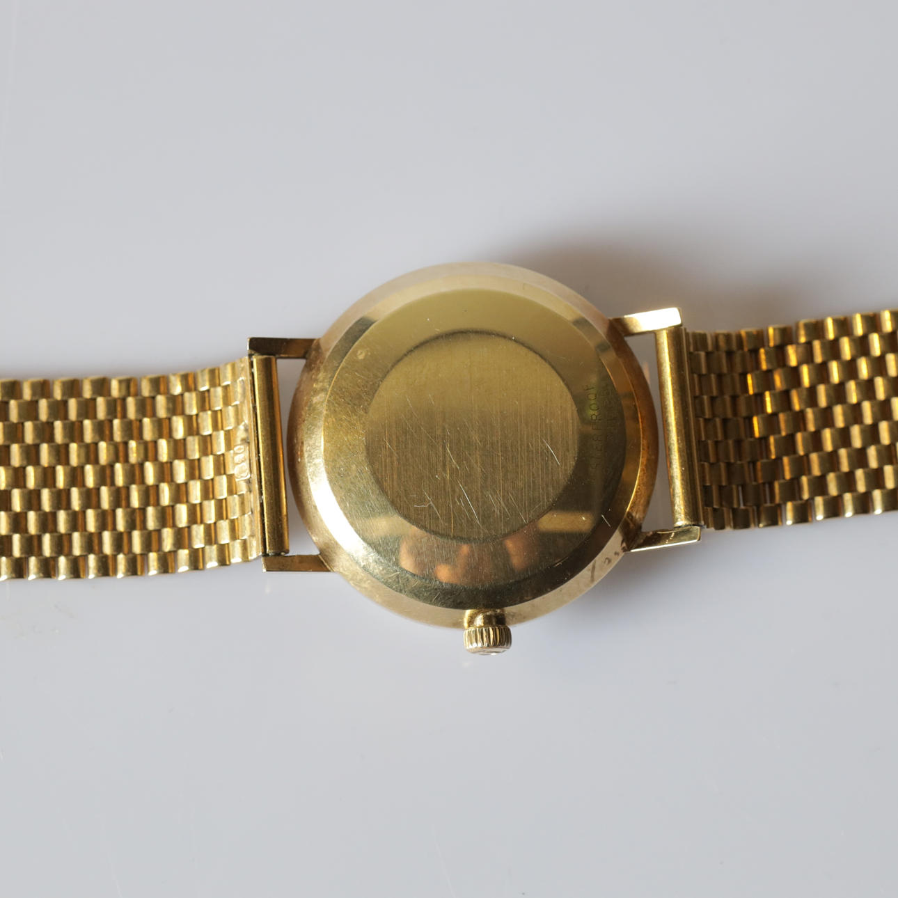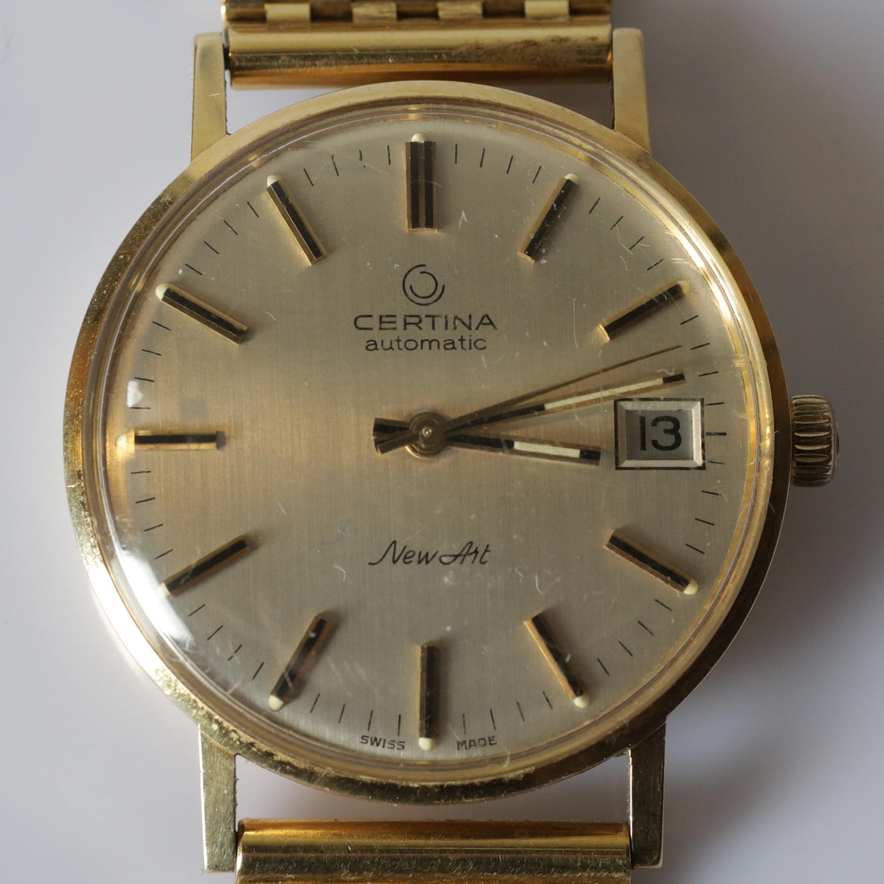 Certina Automatic New Art, 1960s. Total weight approx. 71,7 g. Case in 18K gold with bright dial and rod index. Case marked: 913 381065. Diameter about 34.5 mm. Bracelet in 18K gold with import stamps. Length approx. 20 cm. Condition Minor surface wear. Worked at the time of cataloging. No functional warranty is provided. 52916