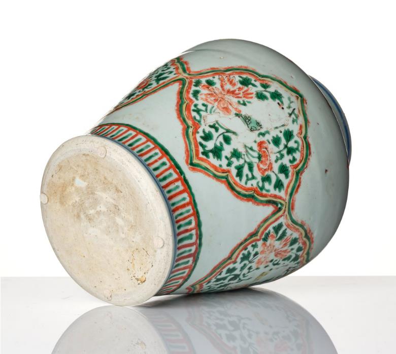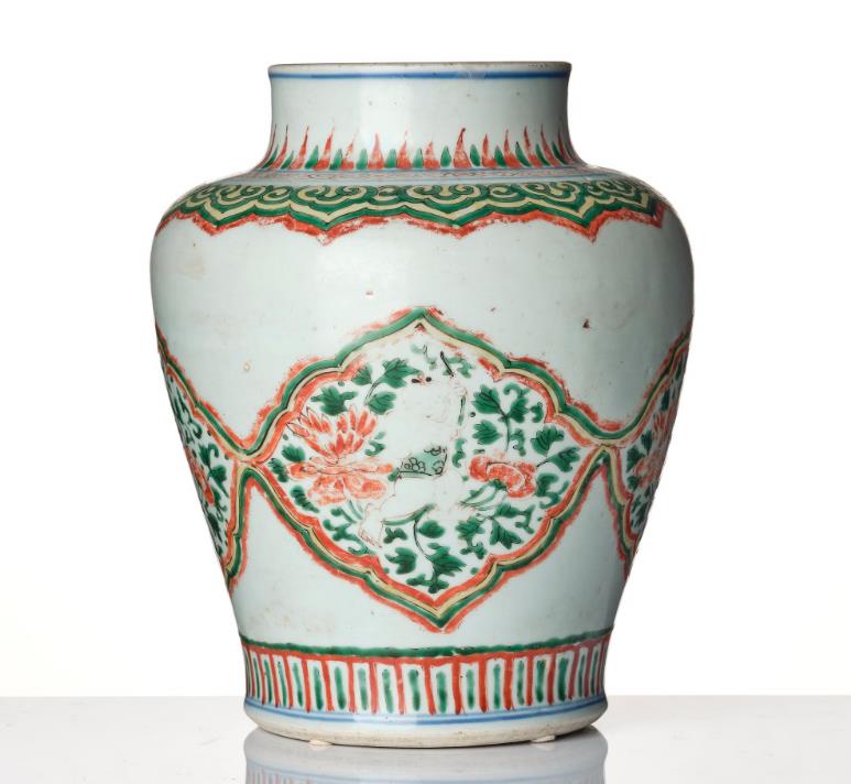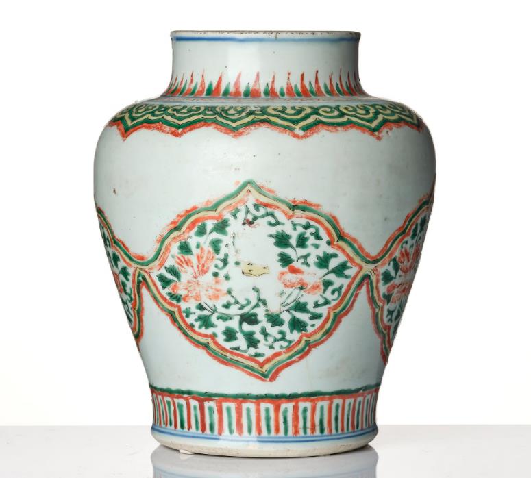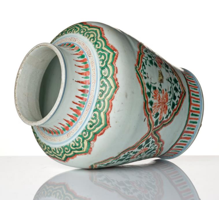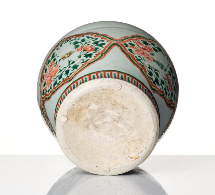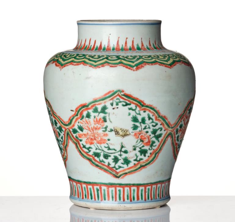 Of baluster shape with a waisted neck and flared rim, decorated in wucai colours with panels with laughing boys amidst peonies. Height 28.5 cm. Cracks. Wear.