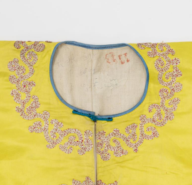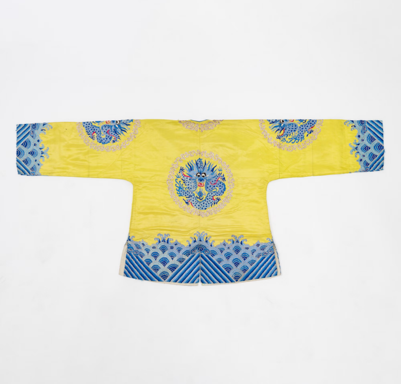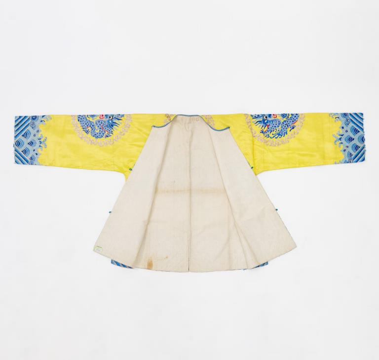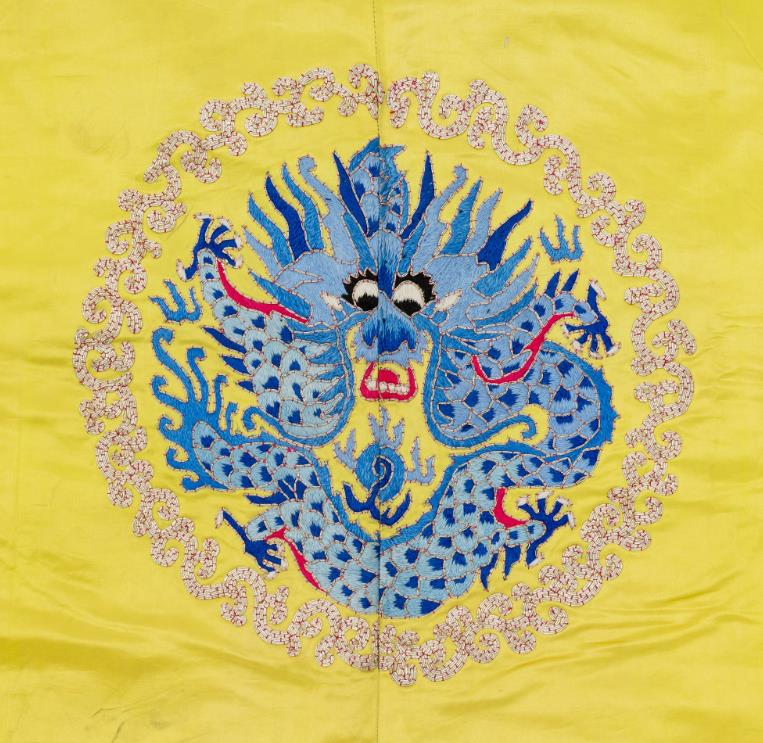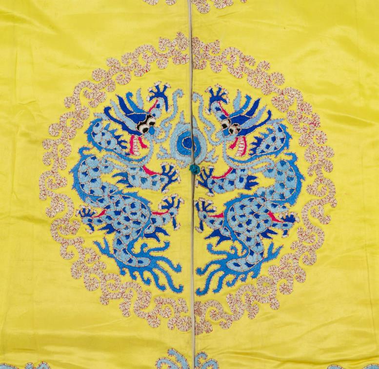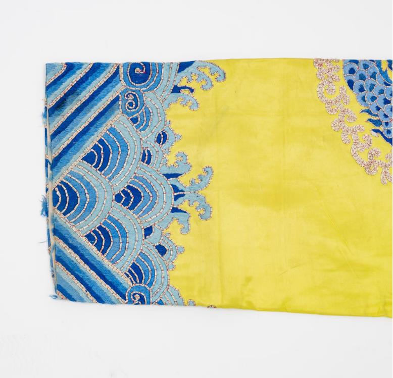 Embroidered blue dragons with the flaming pearl, foaming waves to yellow silk ground. Width between arms 162, length 72 cm. Wear. Small hole. Stains.
