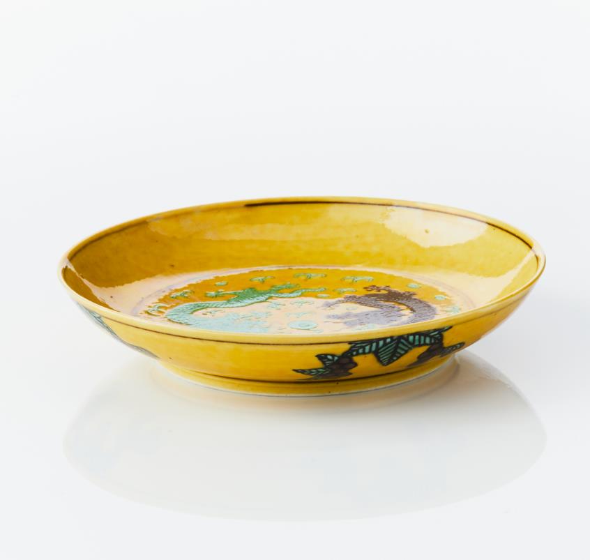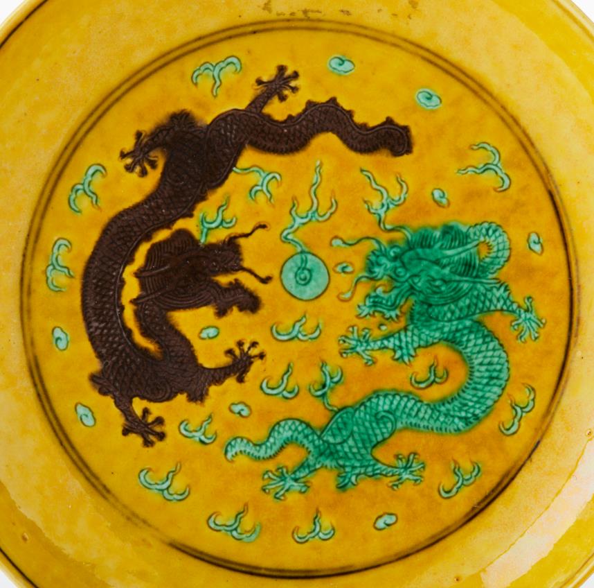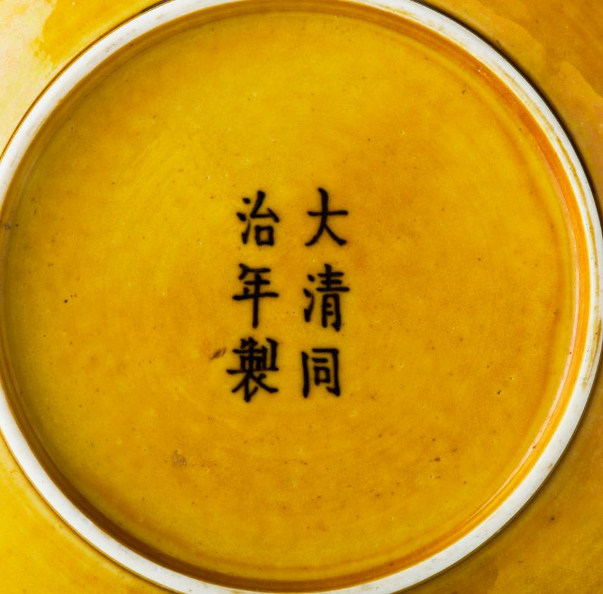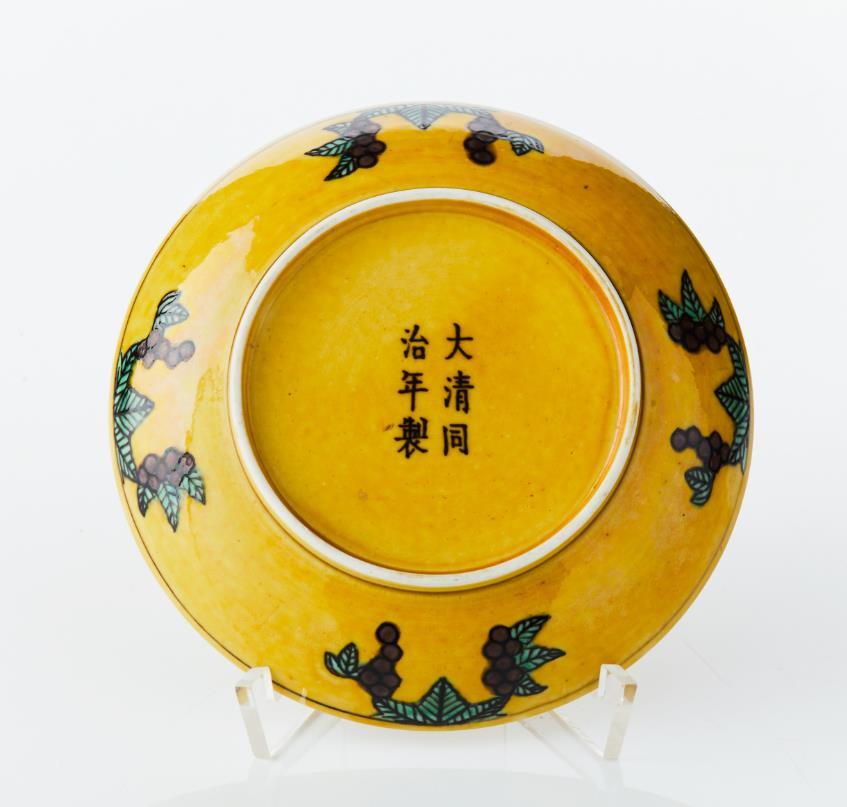 A Yellow Ground Porcelain ’Dragon’ Dish Of circular form with gently rounded sides rising from a short foot, glazed in yellow overall and finely incised with a central medallion of two ferocious five-clawed dragons chasing the flaming pearl within a double circle, their bodies glazed in green and brown, respectively, and curling among stylized clouds and ribbons of flame, the rim encircled with a single line, the reverse of the brim further decorated with grape bunches and stiff pointed leaves, glazed in green and brown with black outlines, the glazed base with a six-character mark of Tongzhi. Period: mark and presumably period of Tongzhi (1862‑1874). Diameter: 13.2 cm.