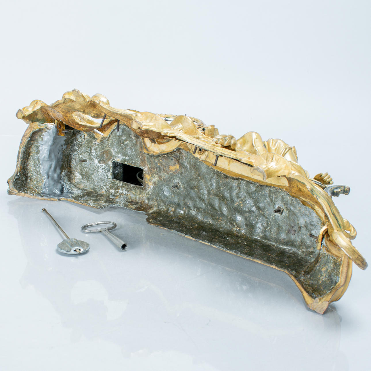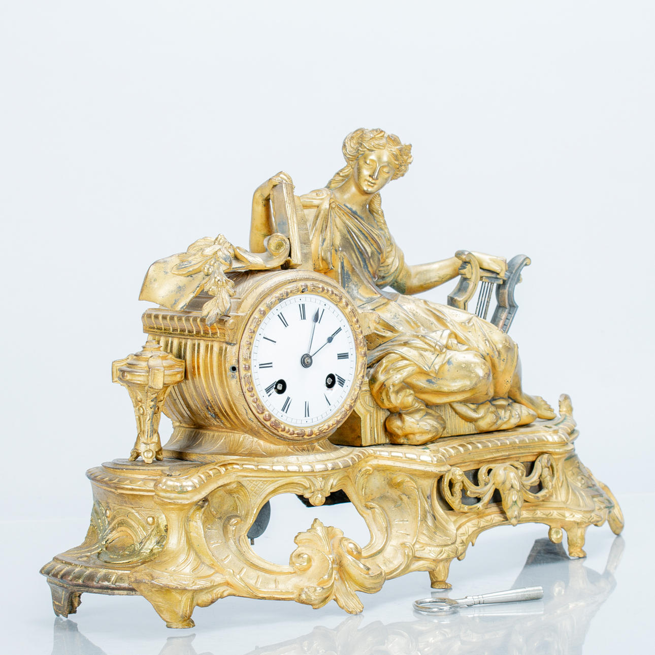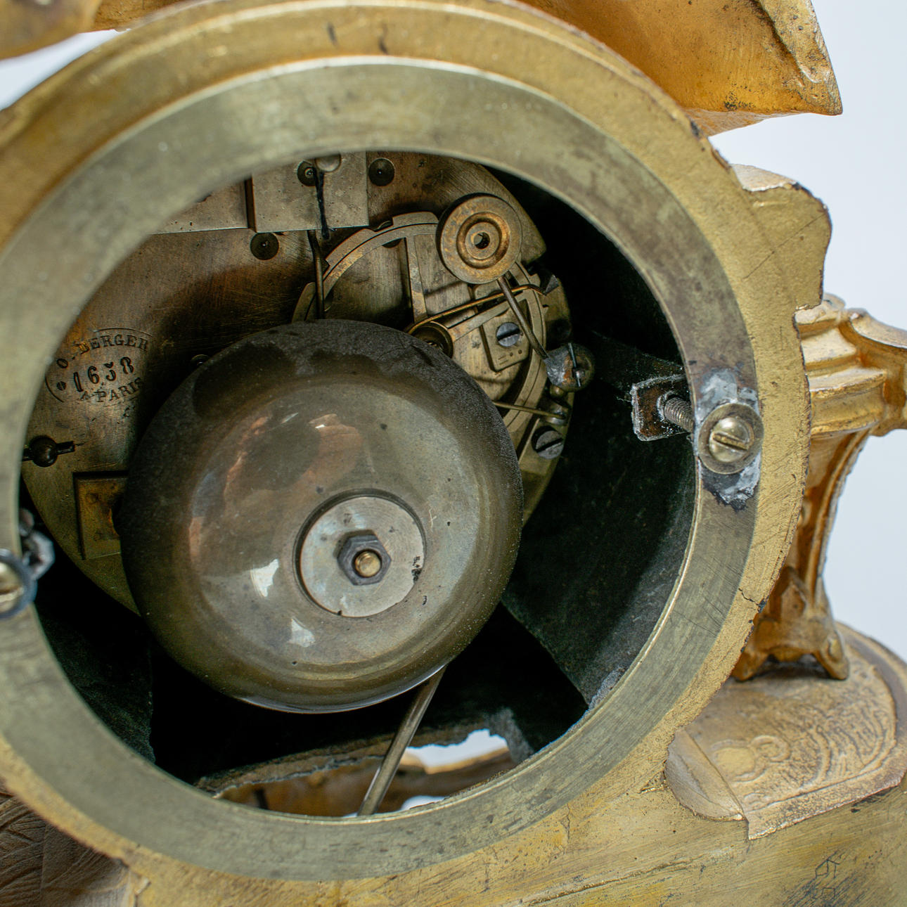 Gilded bronze bell with abundant decor, crowned by the allegory of music Dial with Roman numerals, abundant decor Key included, not functional tested Height: 29 cm Width; 45 cm. Condition Age-based wear, missing glass, material loss, repairs, no other remarks. 310