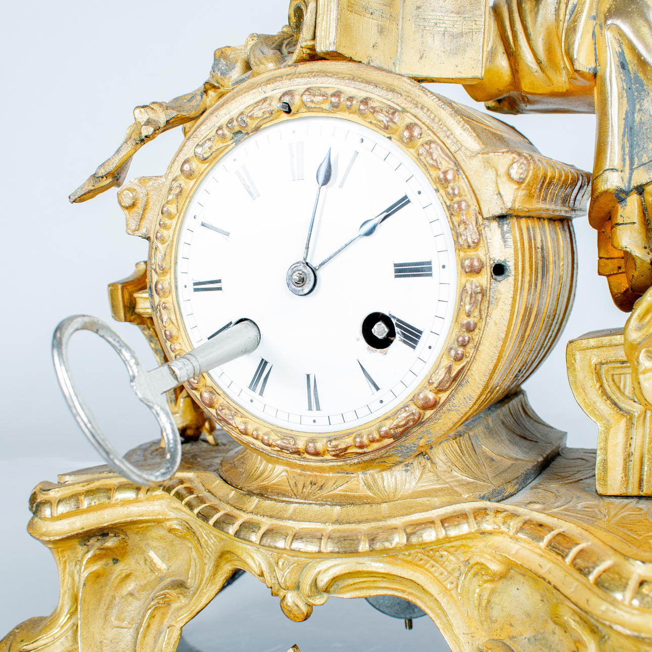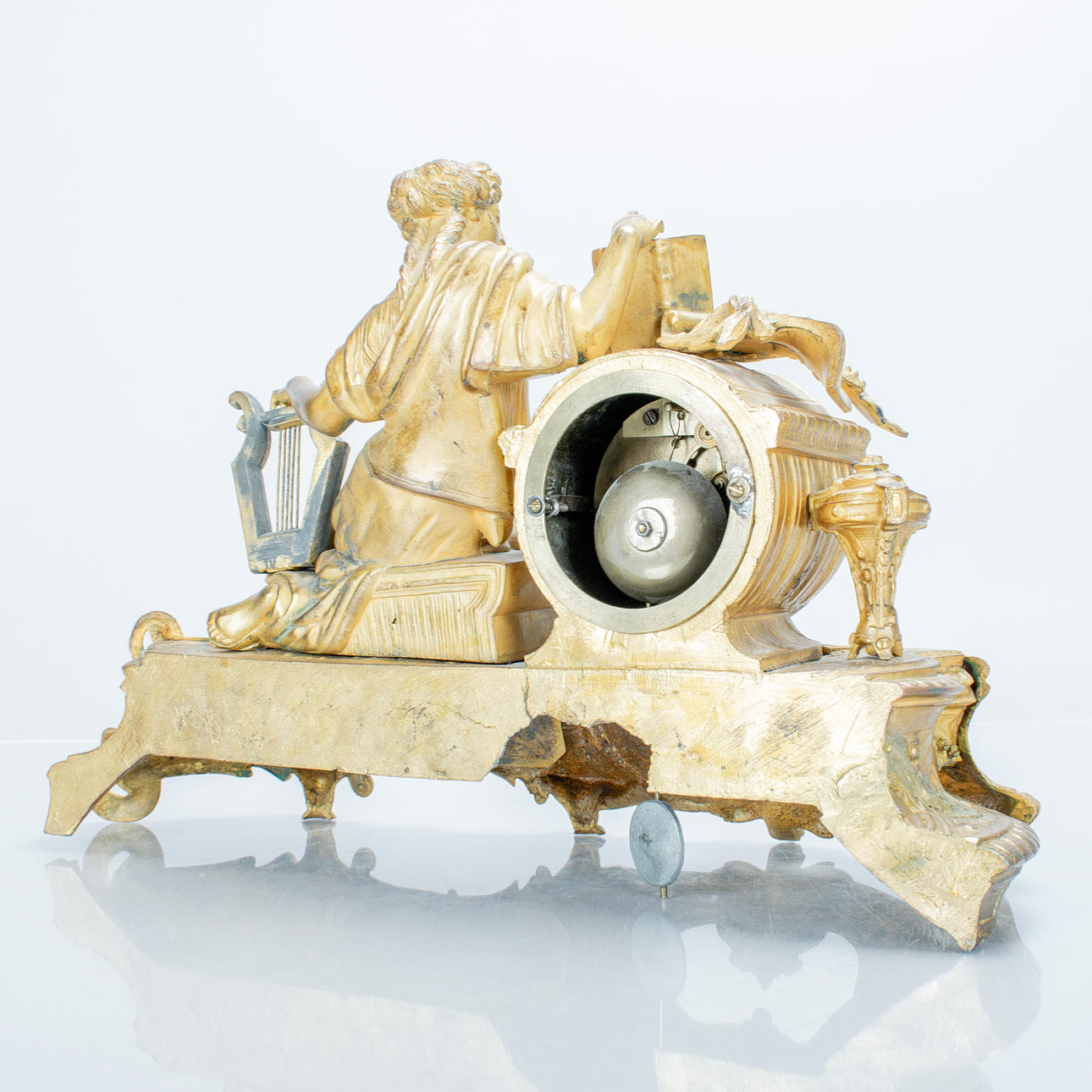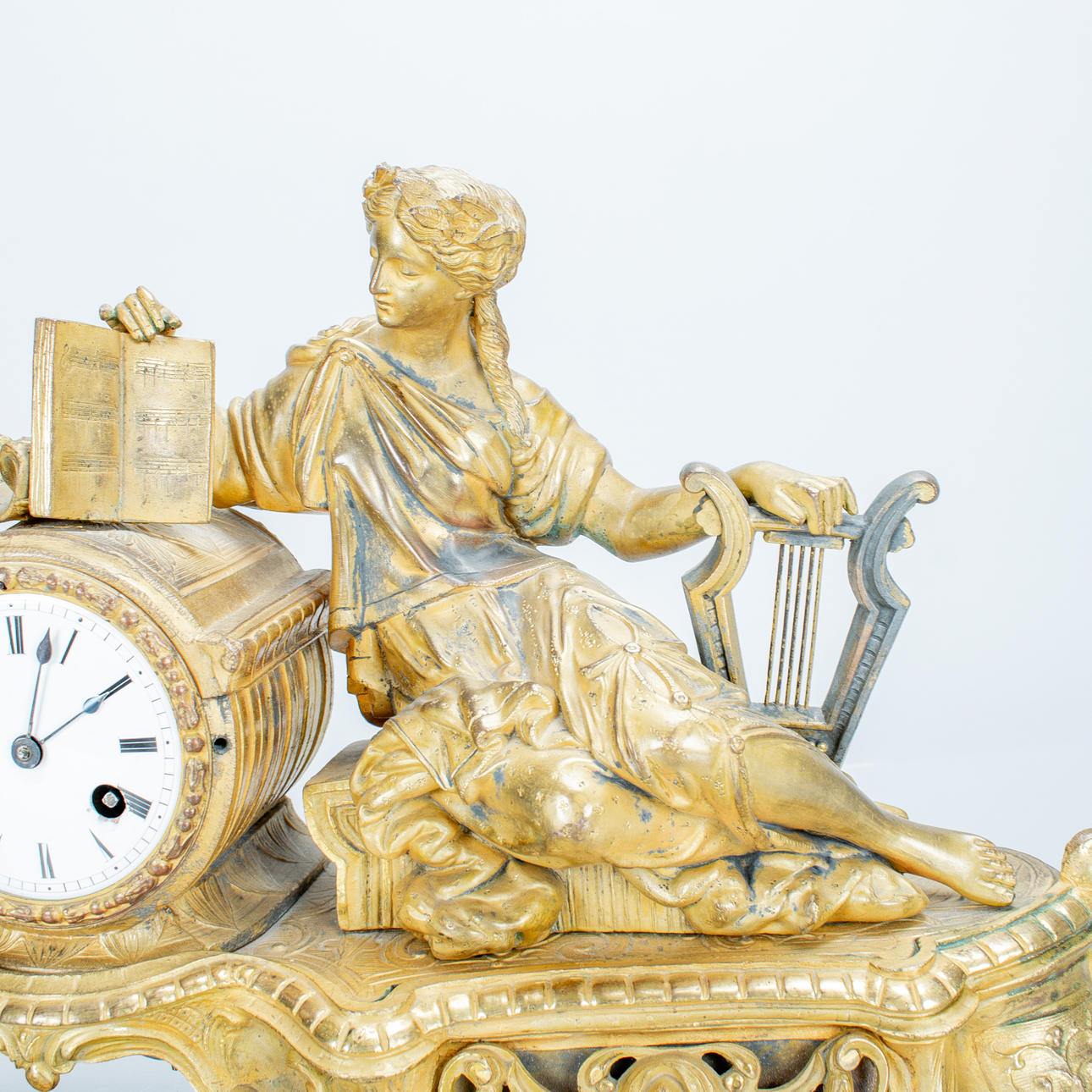 Gilded bronze bell with abundant decor, crowned by the allegory of music Dial with Roman numerals, abundant decor Key included, not functional tested Height: 29 cm Width; 45 cm. Condition Age-based wear, missing glass, material loss, repairs, no other remarks. 310
