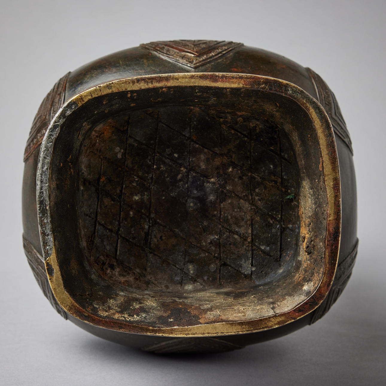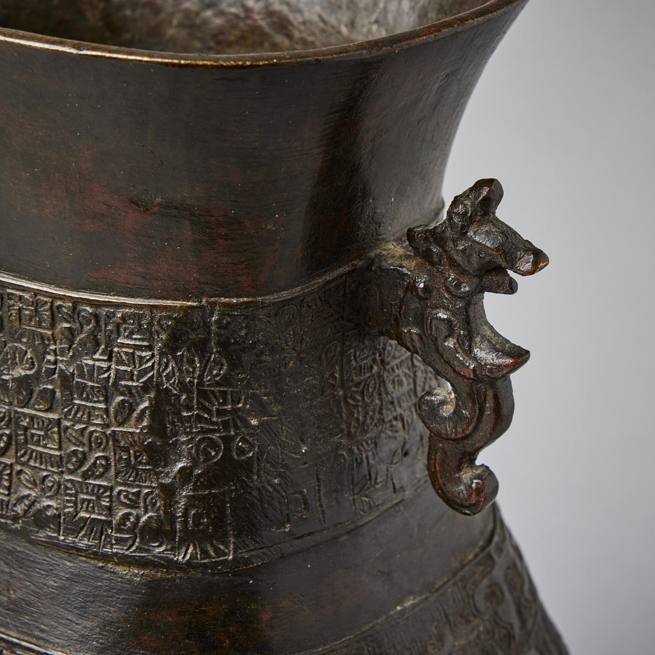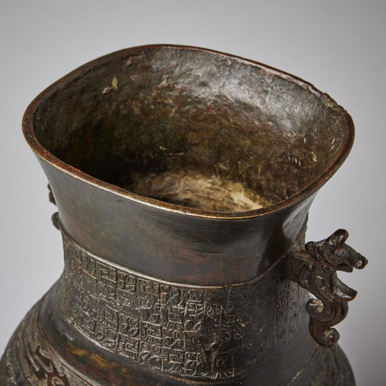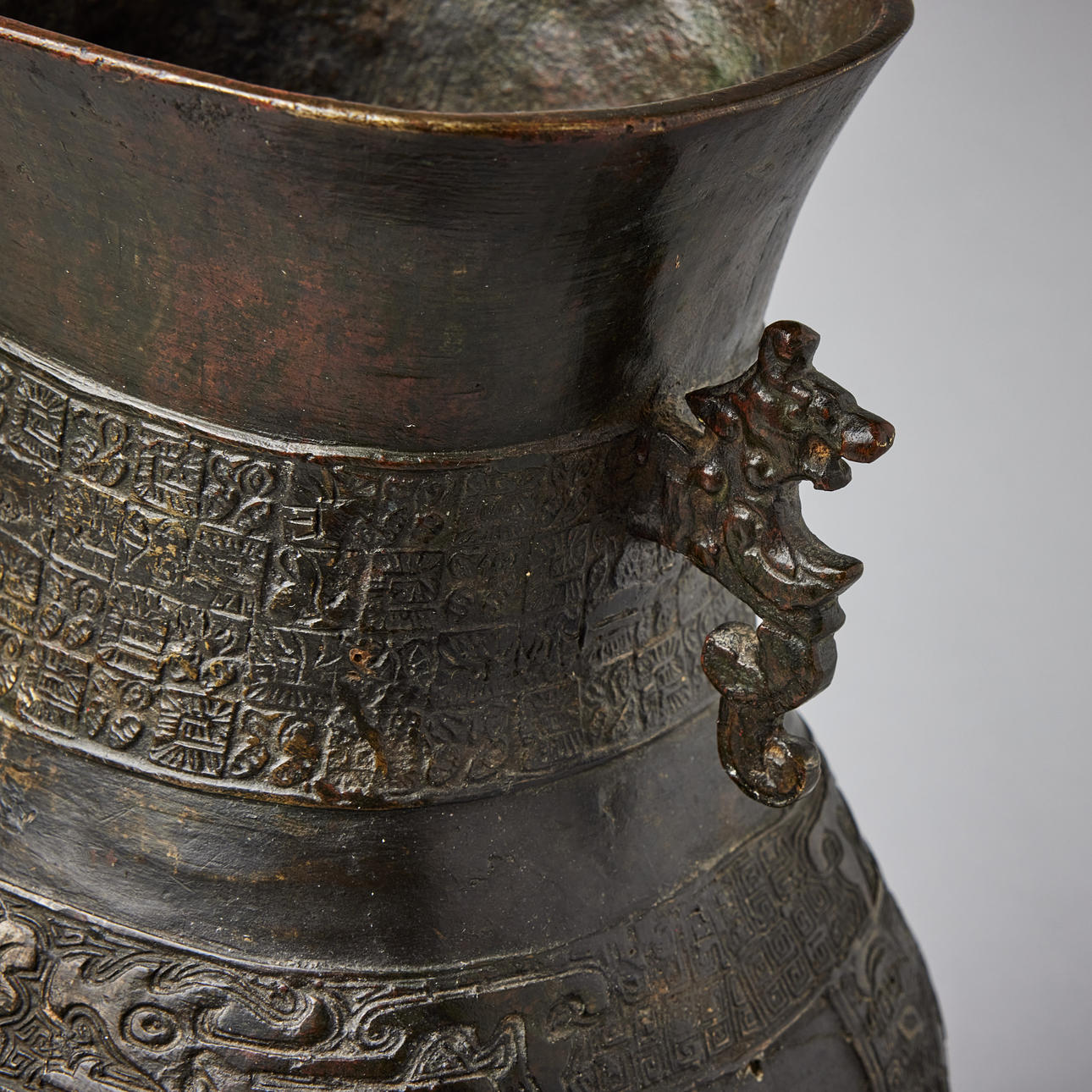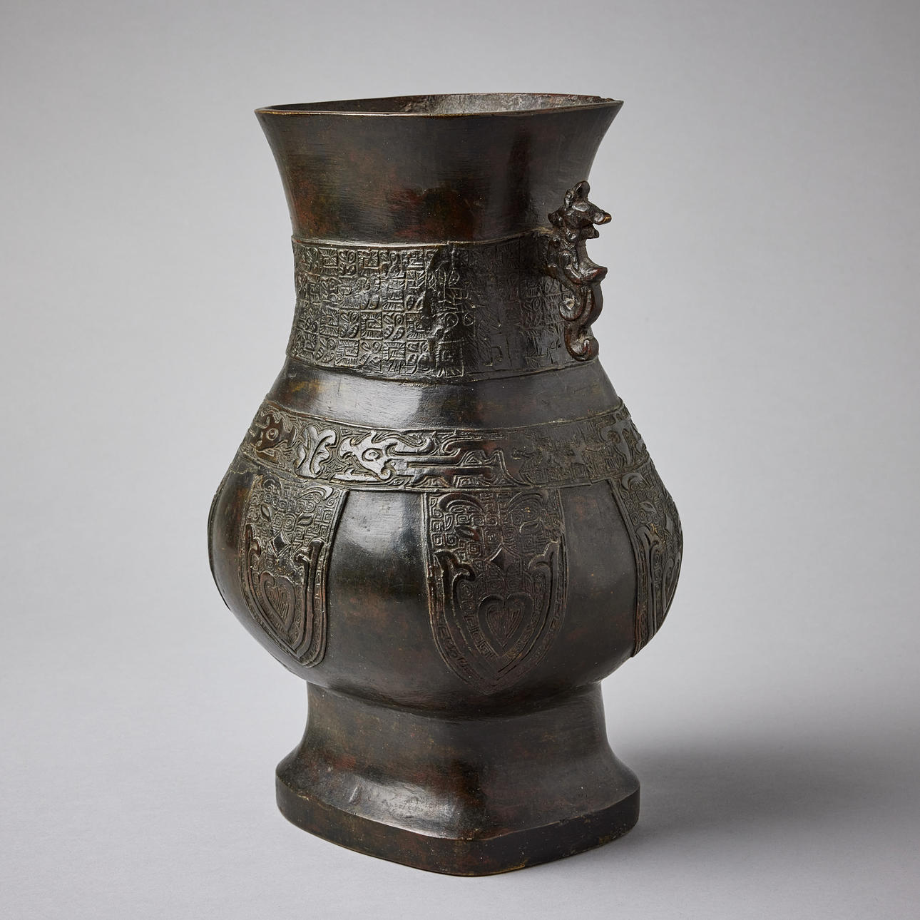 Cast with pendant cicada panels and archaistic bands encircling the neck, flanked by mythical beast handles, 18/19th century, height c. 31.5 cm. Konditionsrapport Wear and construction defects. Repairs. 35833