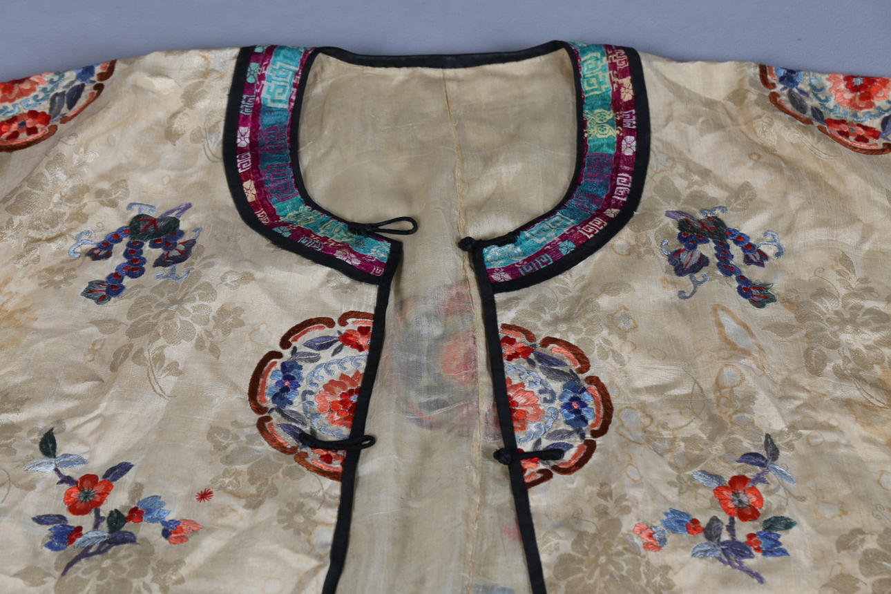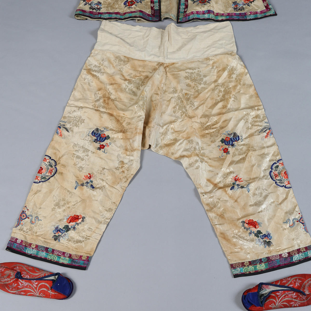 Comprising a jacket and pair of trousers, silk embroidered with brightly coloured flowers and motifs, trousers 95cm long, jacket 70cm long approx., and a pair of shoes (4). Condition Considerable stains and discolouration all over, wear to the shoes. 34085