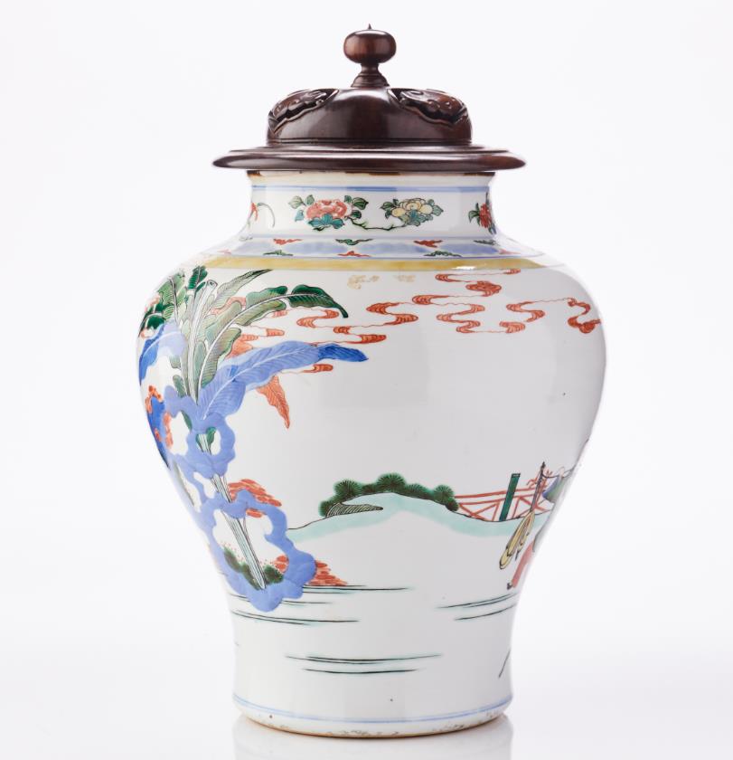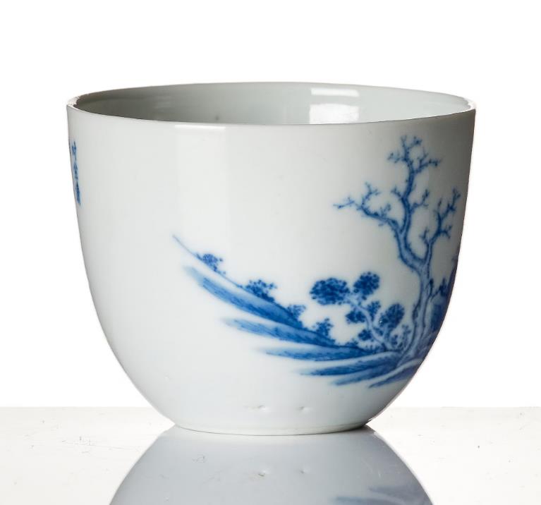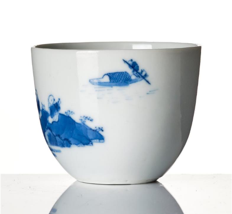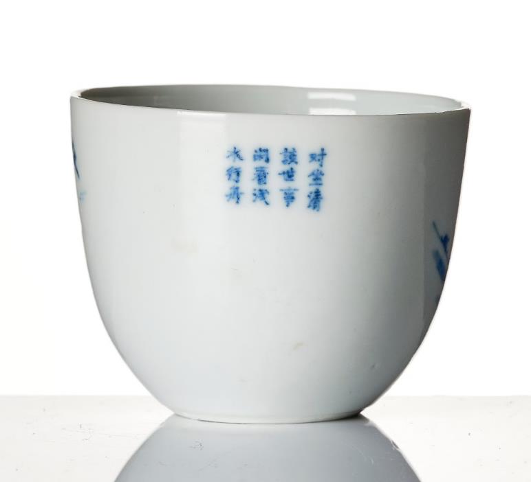 A tall cup with an everted rim, decorated in blue and white with scholars in a landscape and the other side with calligraphy. Height 5 cm. Diameter 6.5 cm.