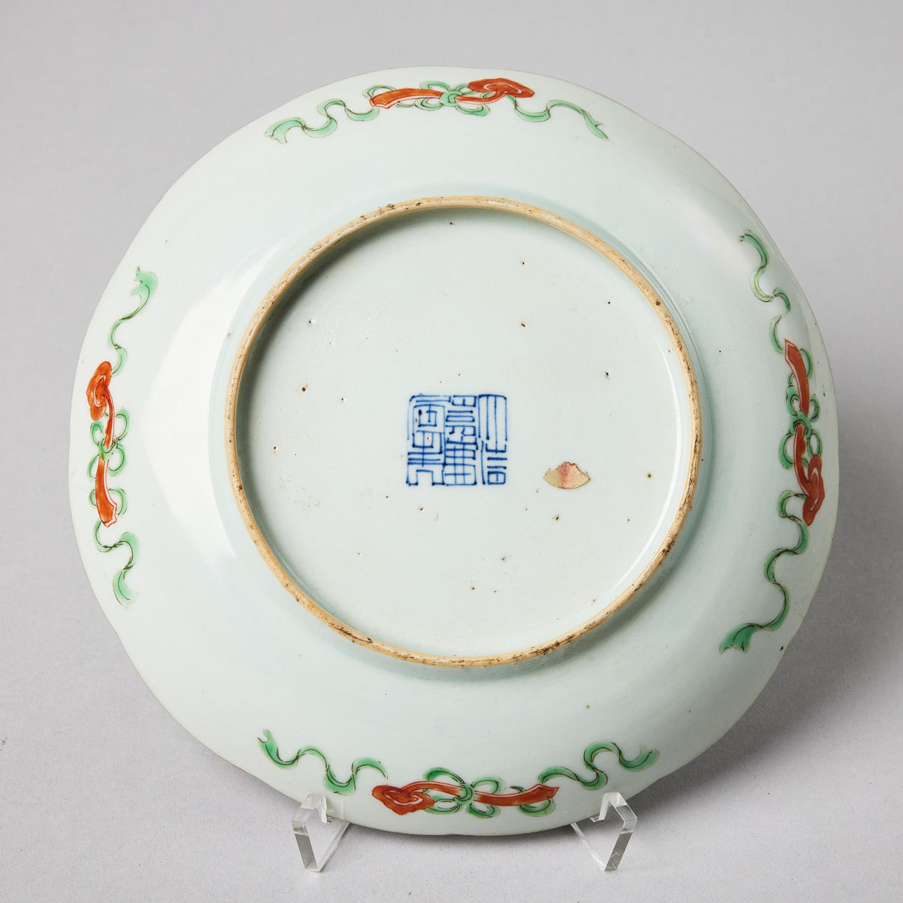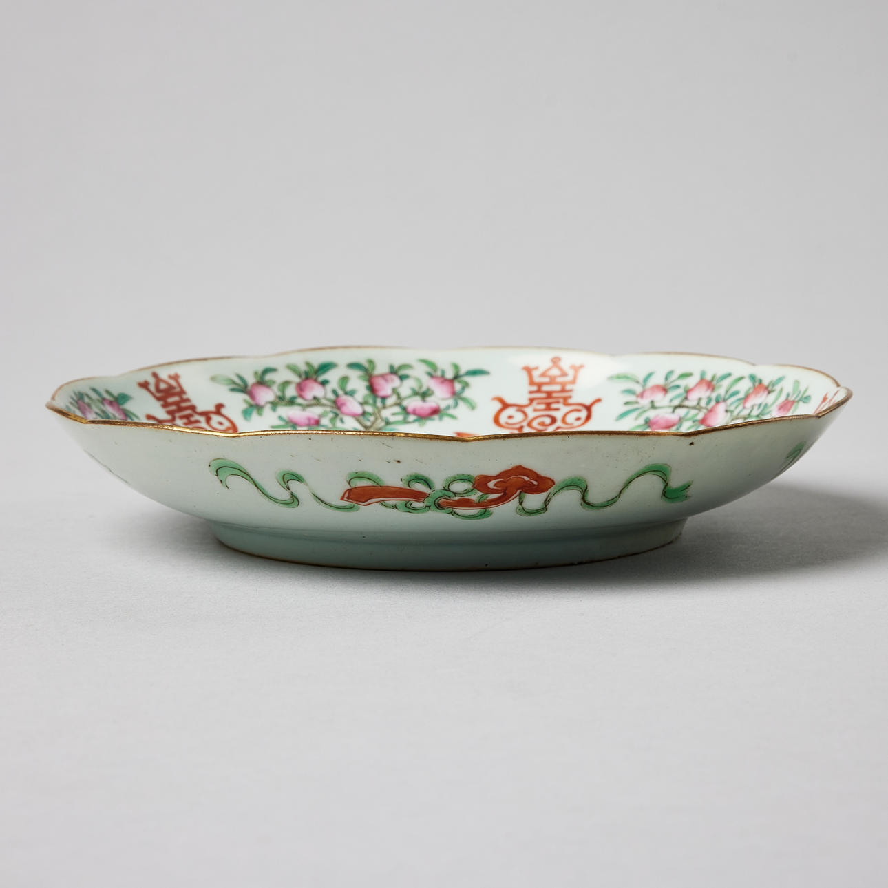 Decorated with peach trees, bats and a ruyi scepter, seal mark, 19th century. Diameter c. 19 cm. Condition Minor wear. No repairs found with UV-light. 29023