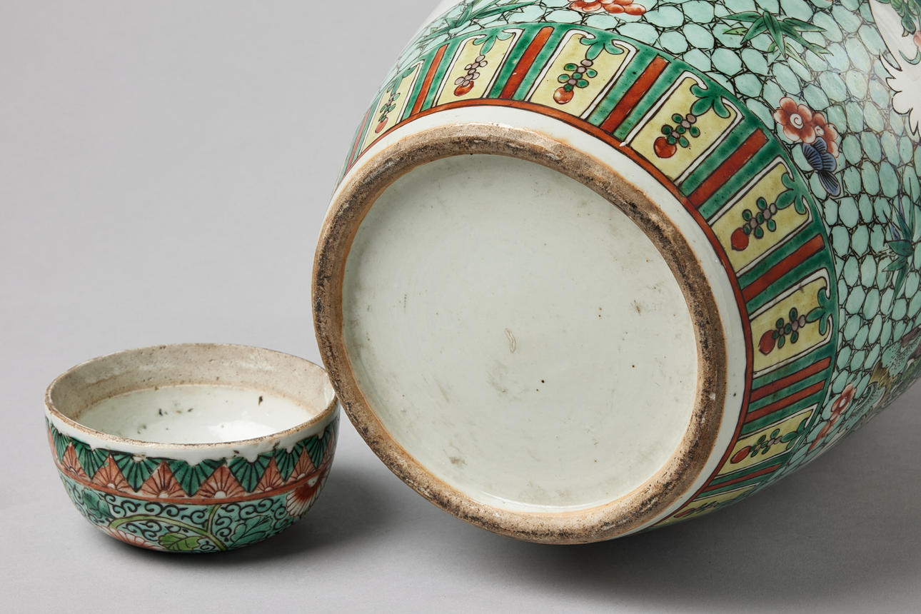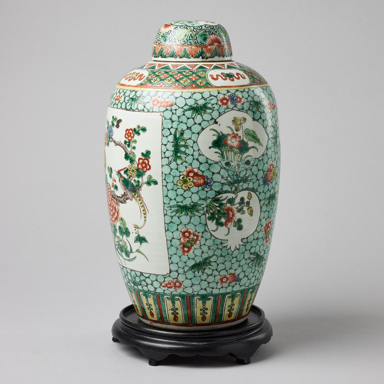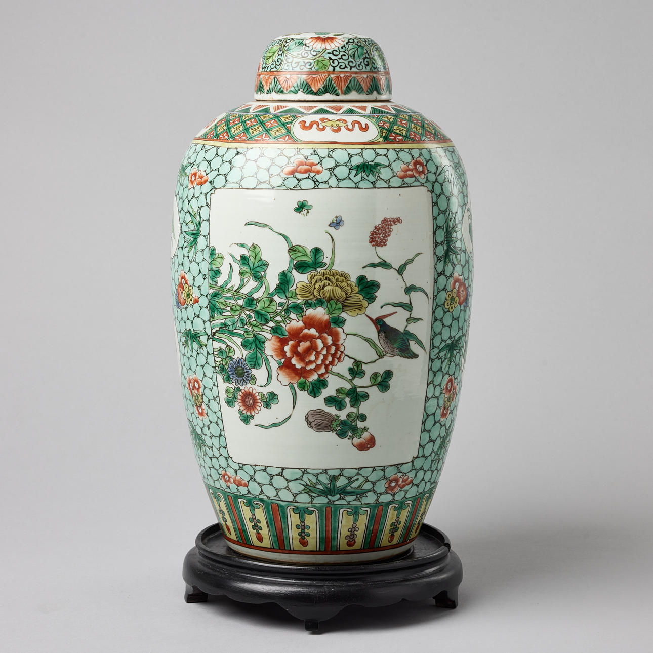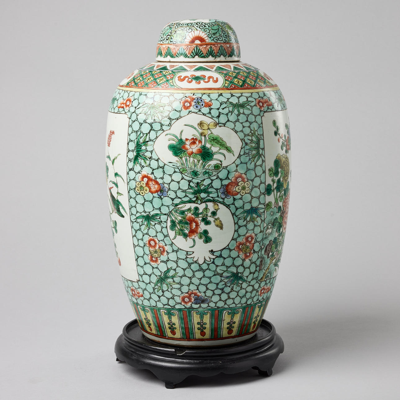 Decorated with two panels enclosing flowers and birds surrounded by 'cracked ice', 19th century. Altura c. 45 cm, wood stand included. Condition Wear. Fabrication defects. No repairs found with UV-light. 28916