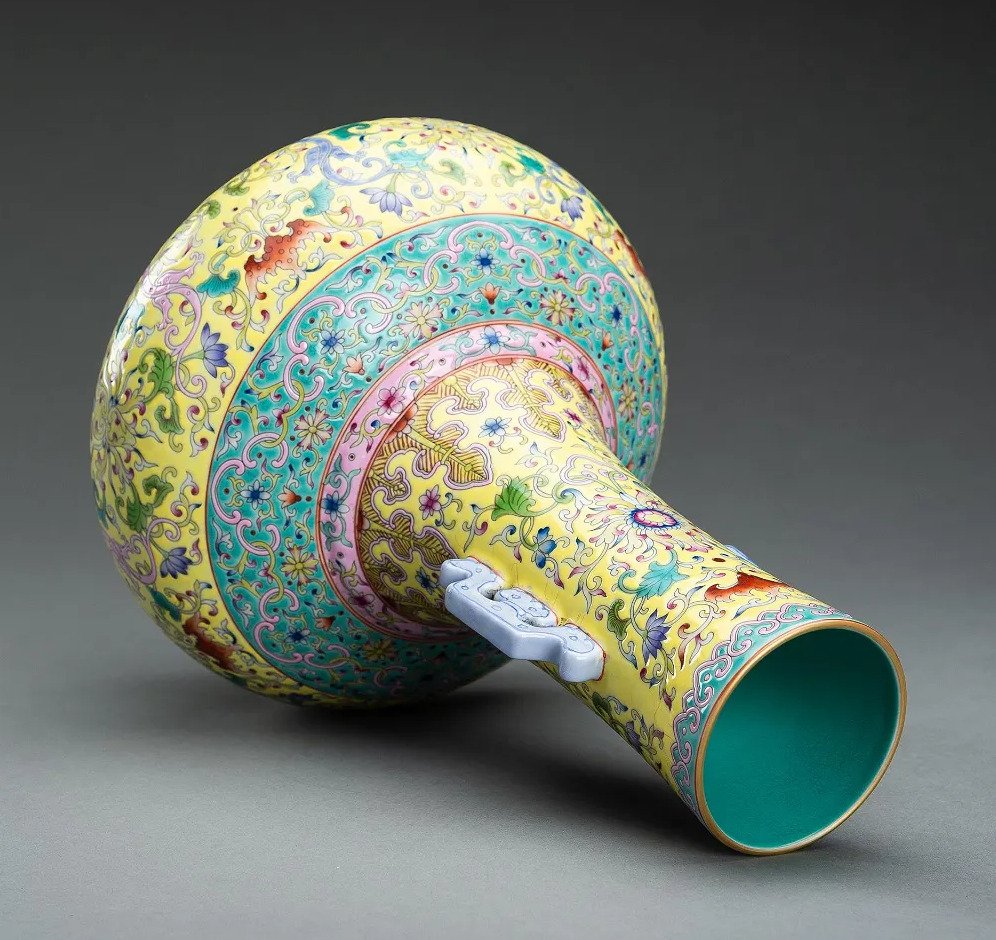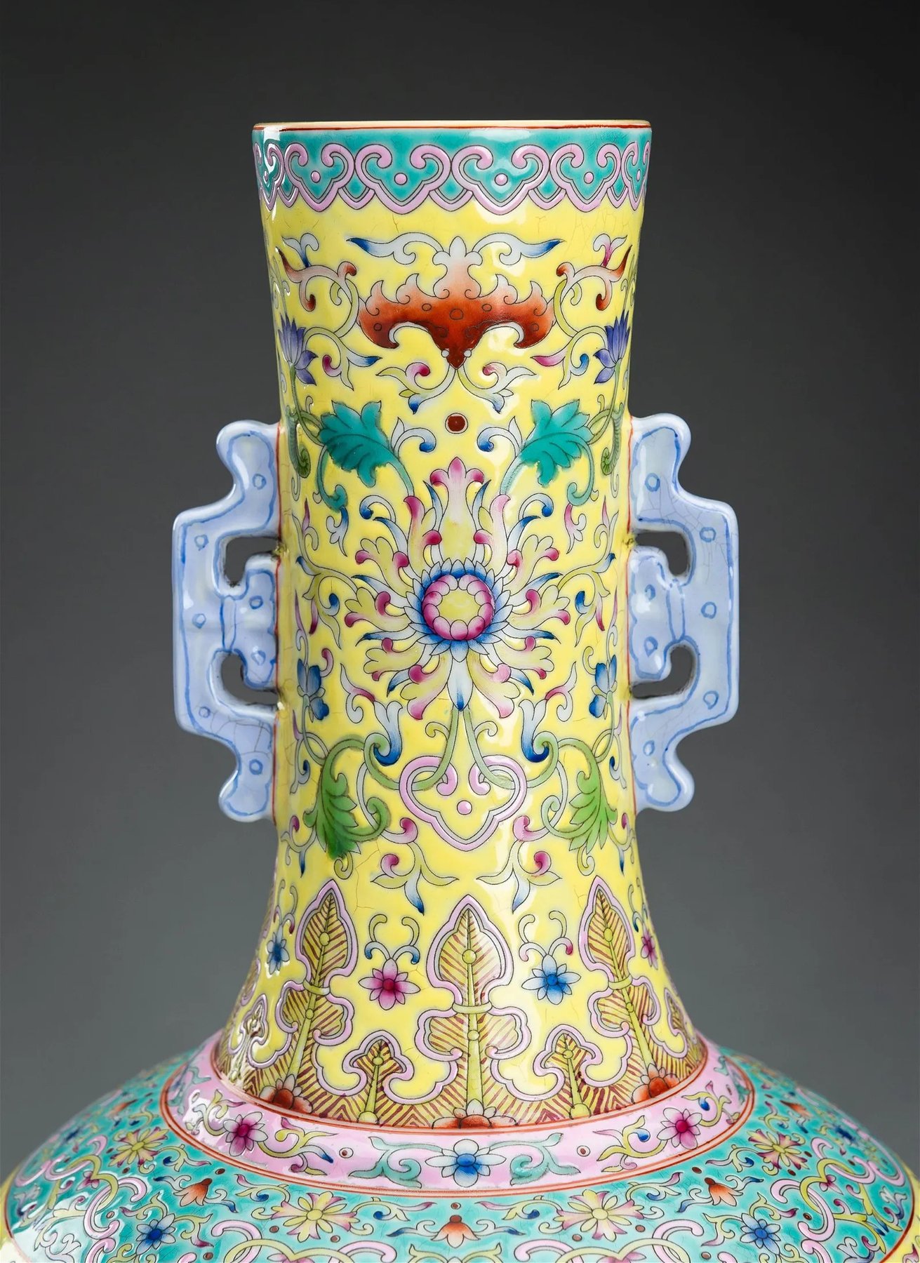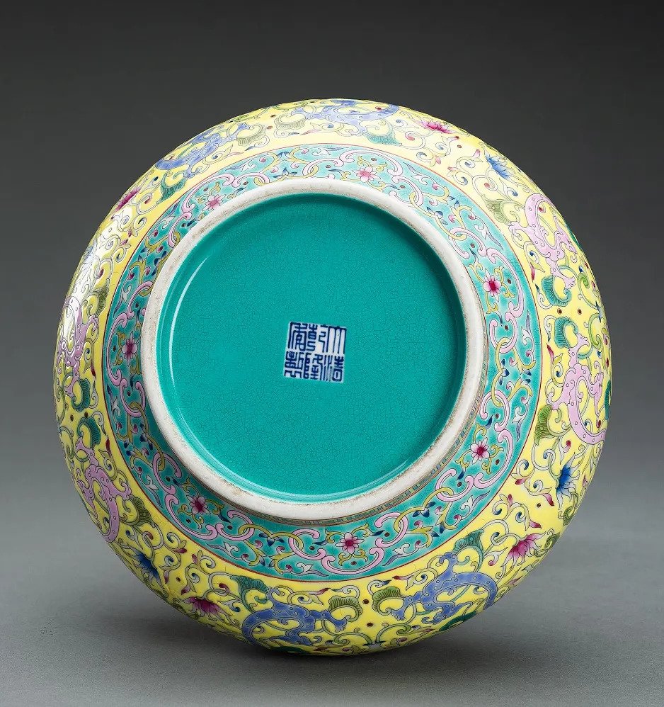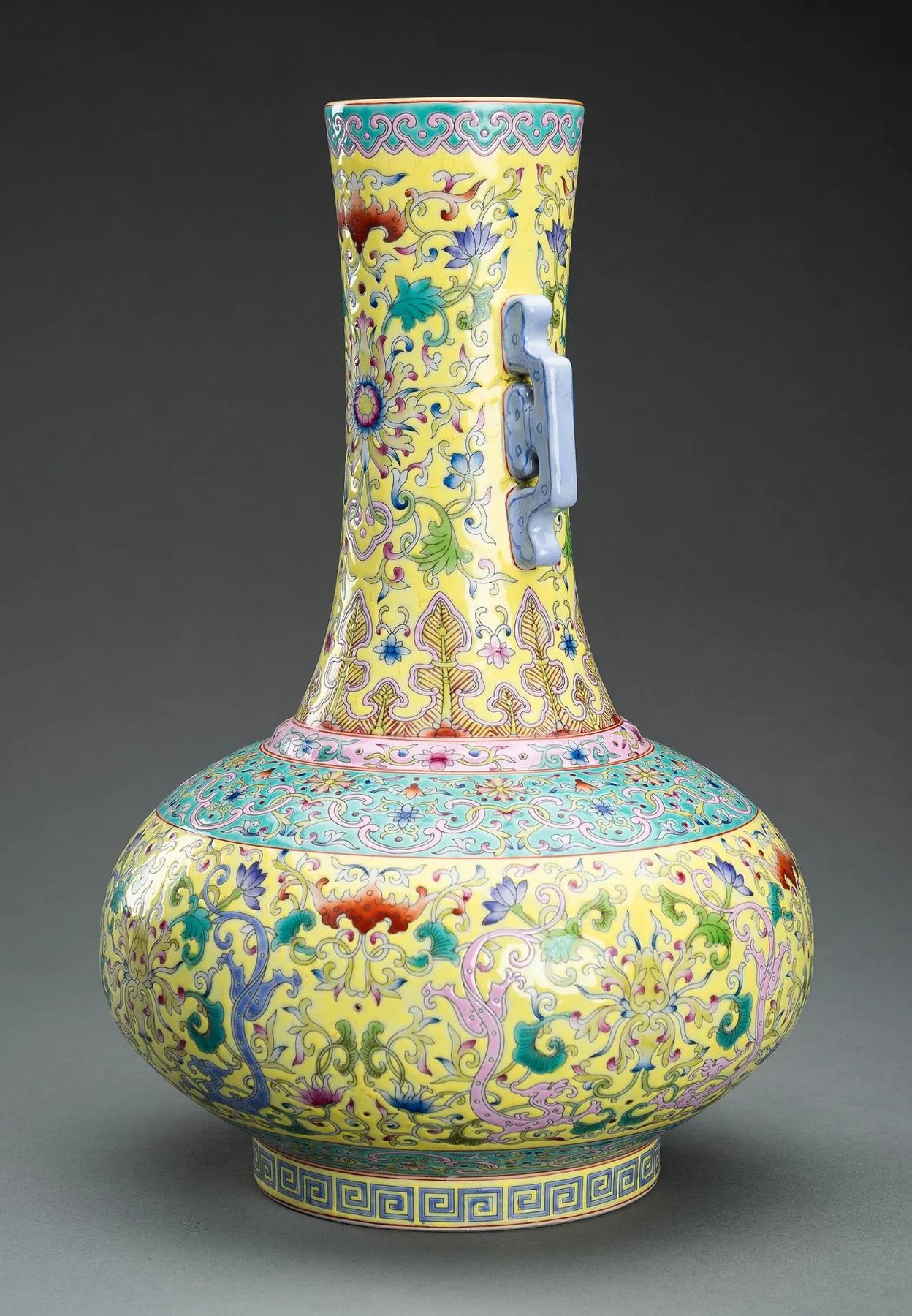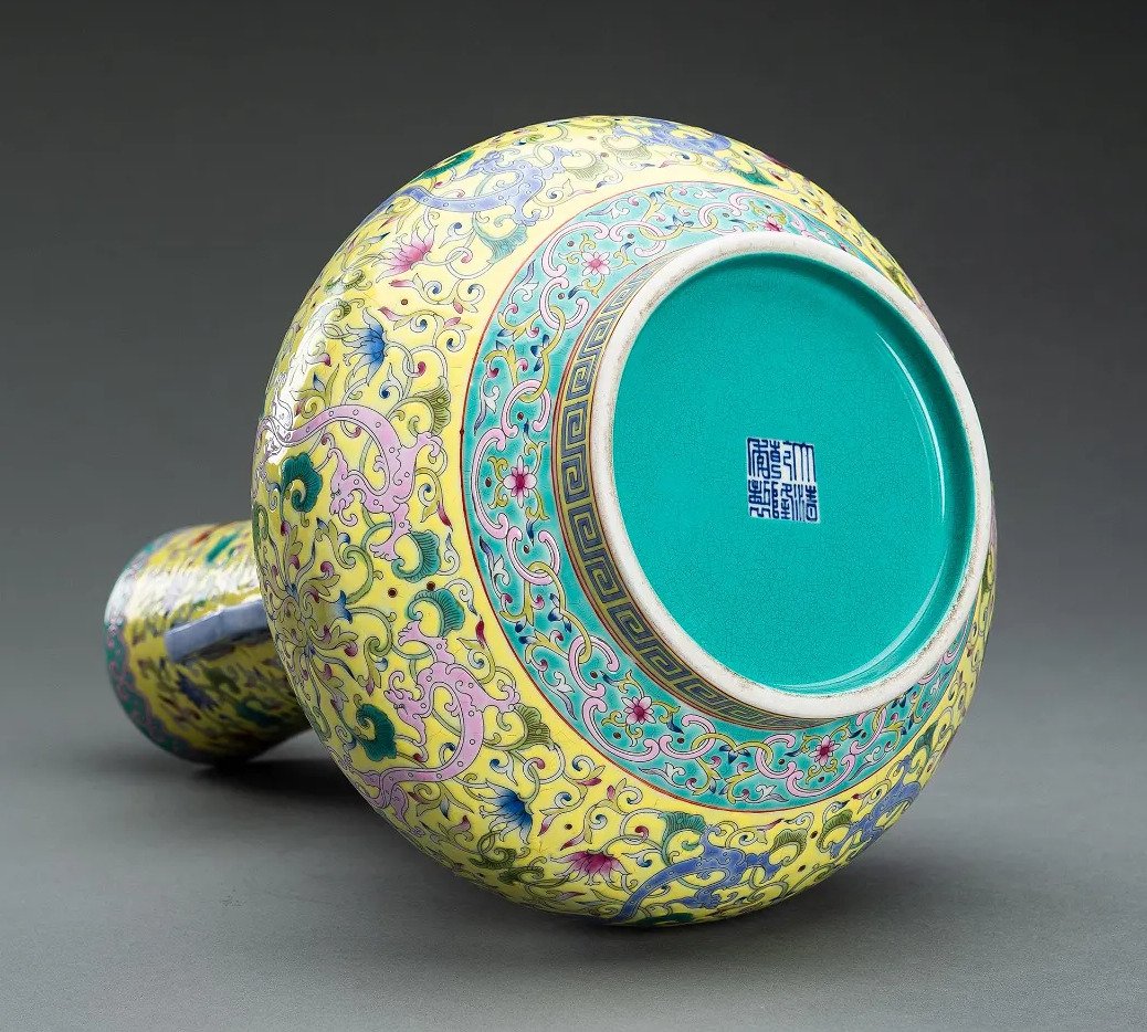 The compressed globular body rising from a straight foot to the neck with a pair of handles, painted on a light yellow ground with lotus, scrolling vines and sinuous chilong, framed to the shoulder and above the foot with floral and ruyi bands, the foot with key fret, the neck with further lotus and vines and framed by ruyi-head bands. The underside with an apocryphal six-character Qianlong mark. Information Art/country: Asian Art, China. Type: Globular vase Period: Republic or later Dimensions: Diameter: 32.5 cm / 12.8". Weight: 2.25 kg. Condition: After very careful checks under natural and UV lights: No hairline or chips. minor wear and firing flaws. In overall VERY GOOD CONDITION and STRICTLY AS PER VISUALS.
